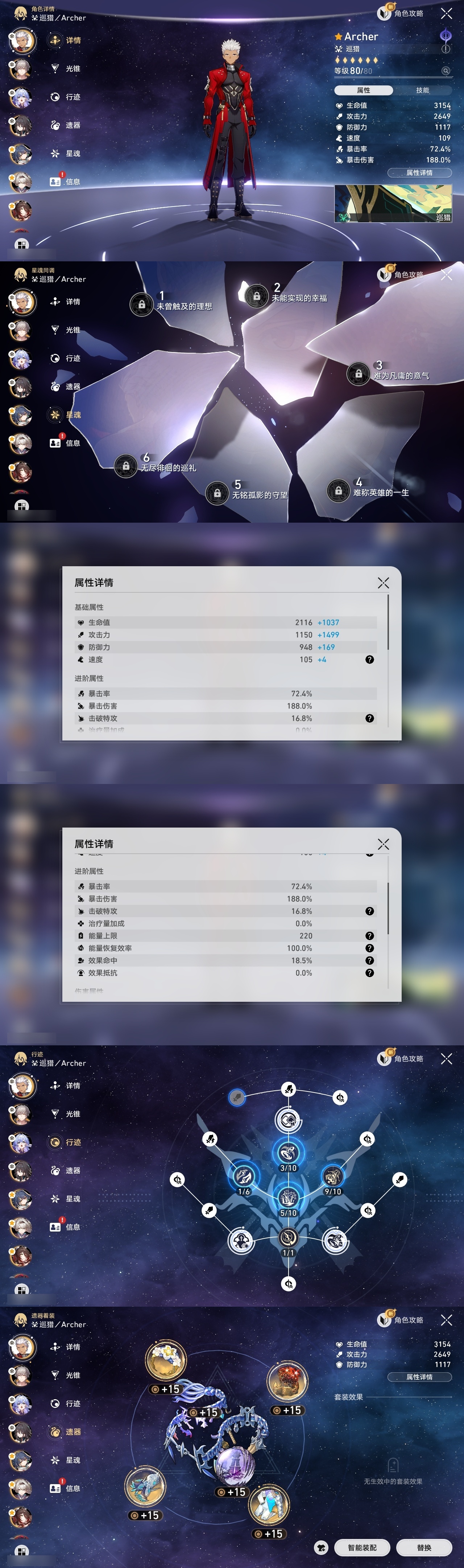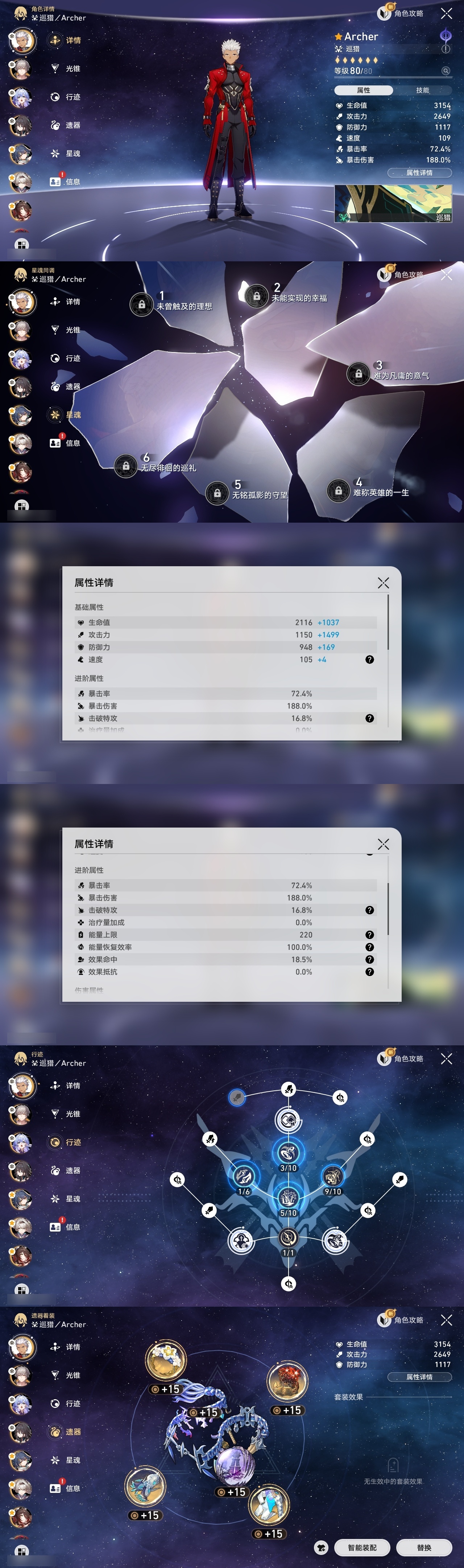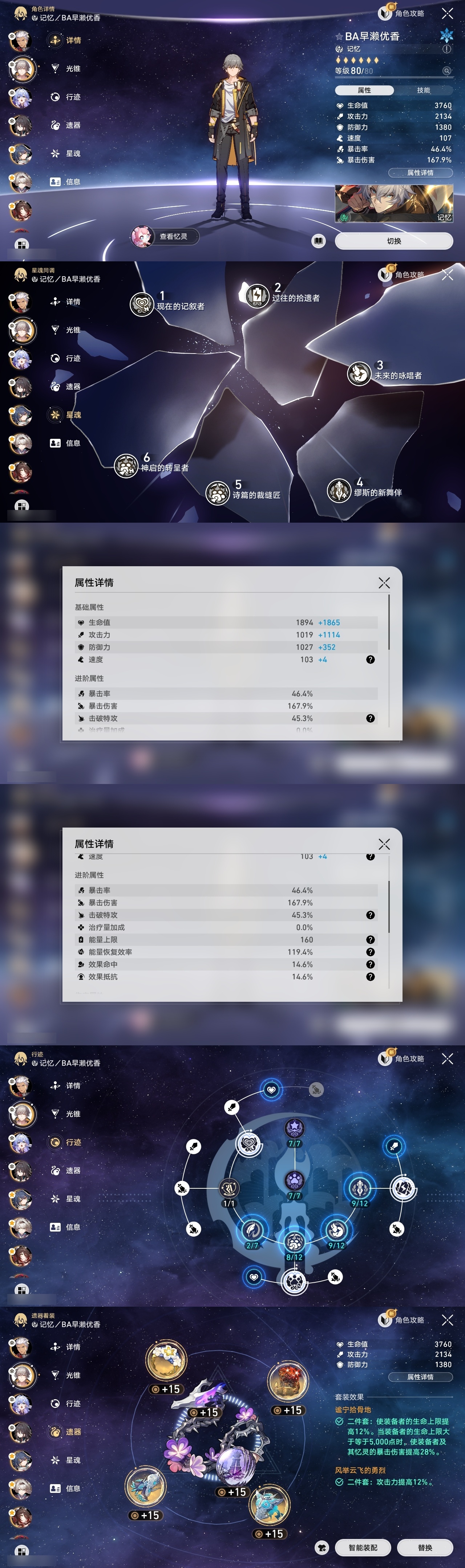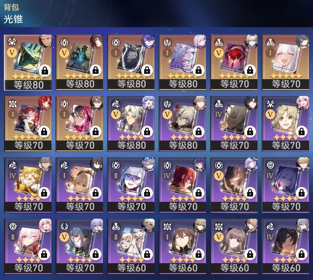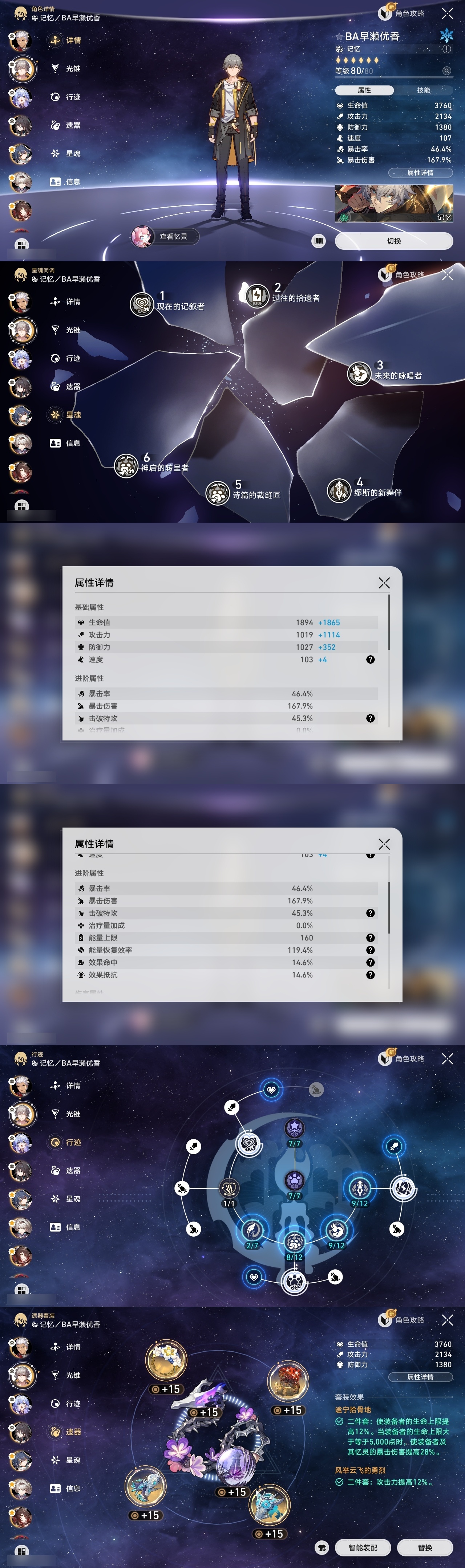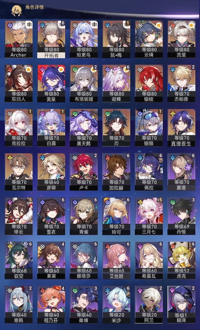 [12282885]总黄数: 38 6命金色角色: 6命遐蝶 2命金色角色: 2命布洛妮娅,2命杰帕德 1命金色角色: 1命白露,1命克拉拉,1命银狼,1命阮•梅 0命金色角色: 0命彦卿,0命瓦尔特,0命刃,0命银枝,0命真理医生,0命黑天鹅,0命黄泉,0命知更鸟,0命流萤,0命云璃,0命忘归人,0命Archer 精5武器: 精5孤独的疗愈,精5记一位星神的陨落,精5星海巡航 精1武器: 精1以世界之名,精1无可取代的东西,精1银河铁道之夜,精1行于流逝的岸,精1让告别,更美一些【按主角: 男主】