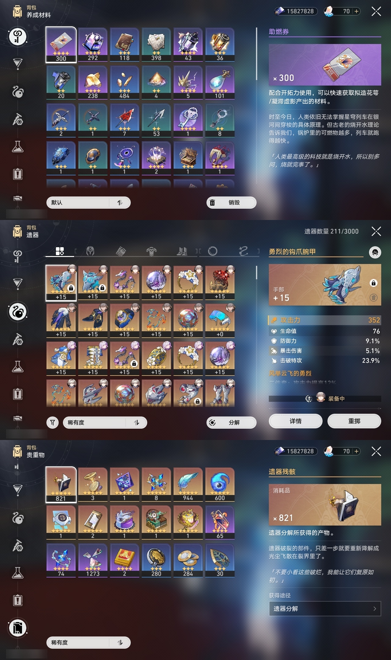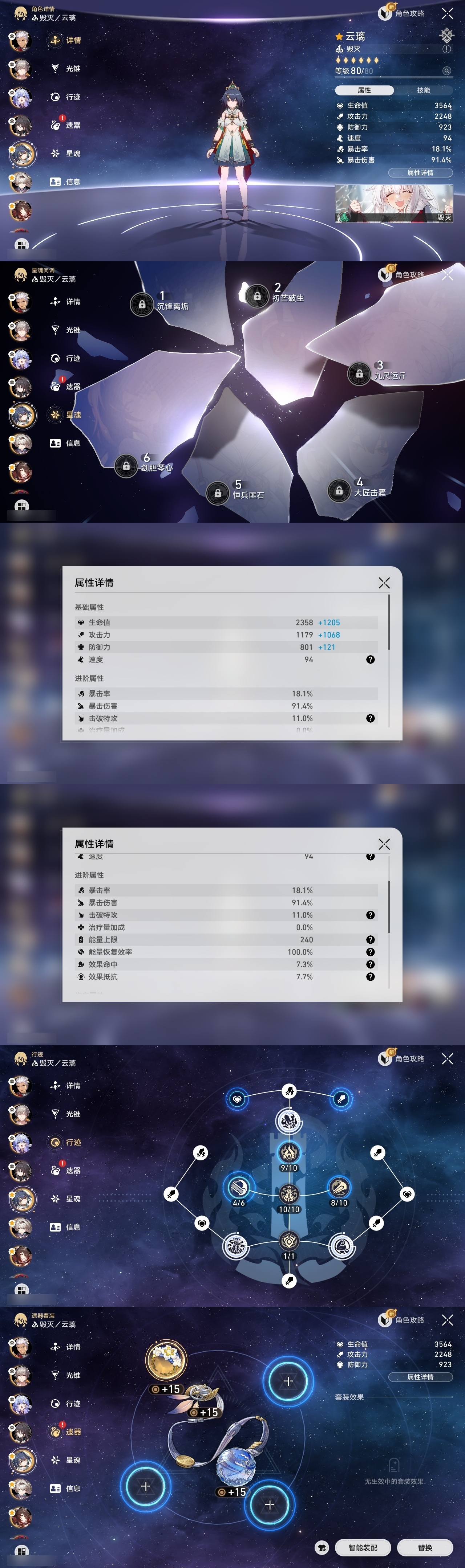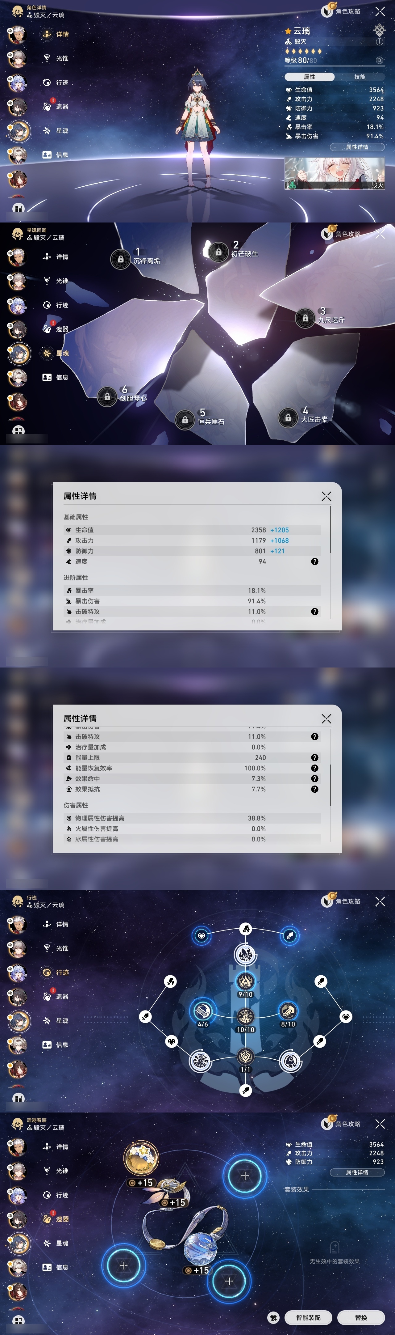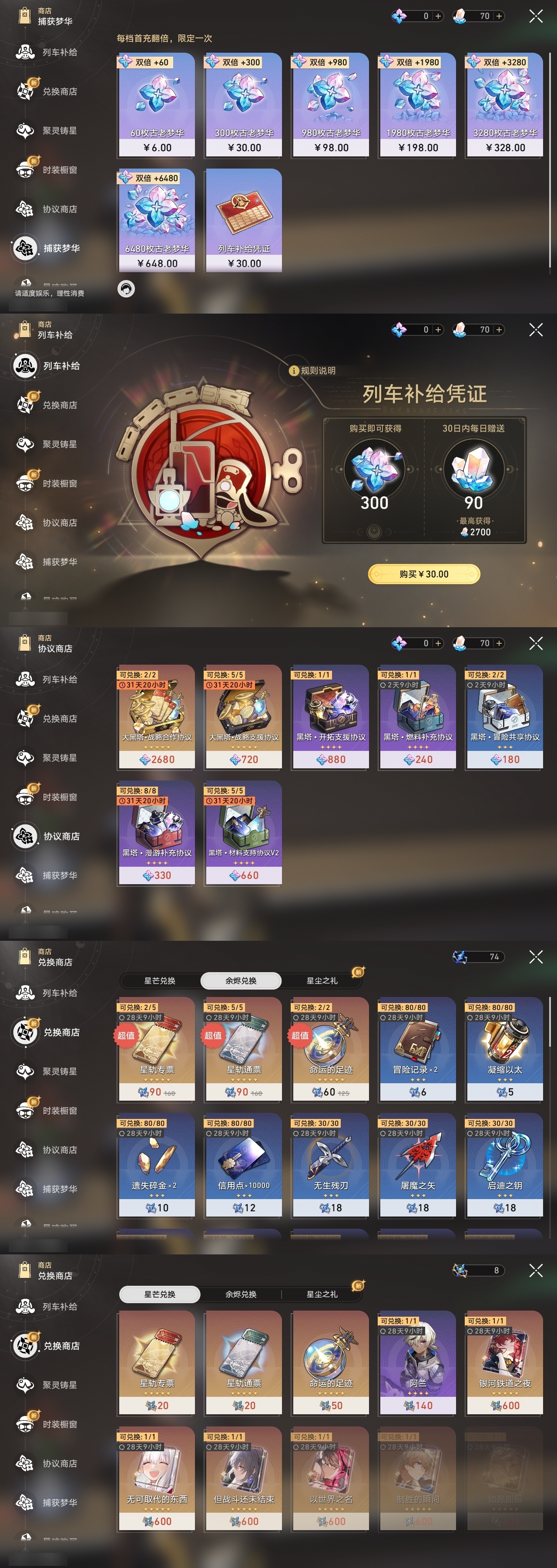 [12282885]总黄数: 38 6命金色角色: 6命遐蝶 2命金色角色: 2命布洛妮娅,2命杰帕德 1命金色角色: 1命白露,1命克拉拉,1命银狼,1命阮•梅 0命金色角色: 0命彦卿,0命瓦尔特,0命刃,0命银枝,0命真理医生,0命黑天鹅,0命黄泉,0命知更鸟,0命流萤,0命云璃,0命忘归人,0命Archer 精5武器: 精5孤独的疗愈,精5记一位星神的陨落,精5星海巡航 精1武器: 精1以世界之名,精1无可取代的东西,精1银河铁道之夜,精1行于流逝的岸,精1让告别,更美一些【按主角: 男主】