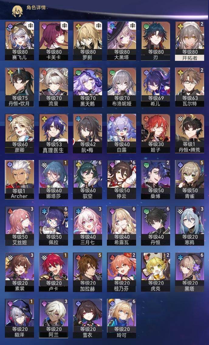 Archer,赛飞儿,大黑塔,流萤,黑天鹅,真理医生,阮•梅,卡芙卡,刃,罗刹,希儿,白露,彦卿,布洛妮娅,瓦尔特,姬子,向着不可追问处,只需等待,银河铁道之夜,记一位星神的陨落,2命瓦尔特,0命Archer,0命赛飞儿,0命大黑塔,0命流萤,0命黑天鹅,0命真理医生,0命阮•梅,0命卡芙卡,0命刃,0命罗刹,0命希儿,0命白露,0命彦卿,0命布洛妮娅,0命姬子,精2银河铁道之夜,精2记一位星神的陨落,精1向着不可追问处,精1只需等待【按邮箱: 邮箱未绑定】