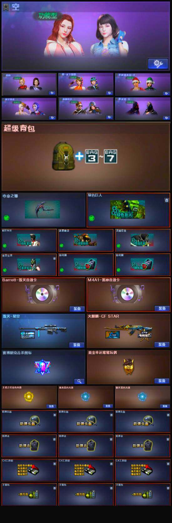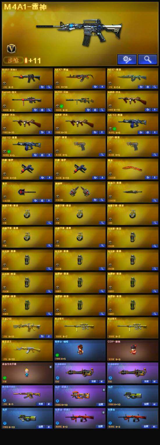【英雄级武器】:AK47-雷暴,USP-雷暴*2,斩神刀-雷暴,M4A1-雷神,M4A1-黑骑士,汤姆逊-烈龙*3,Barrett-毁灭,AA-12-雷霆*2,M200-幻神,AK47-黑鲨,沙鹰-修罗*2,麒麟刺,擎天,屠龙