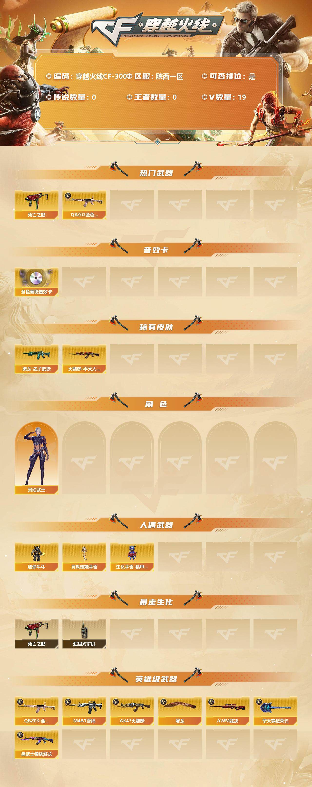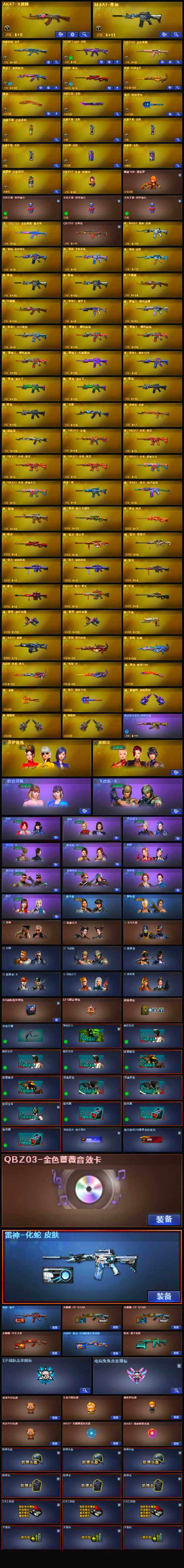 【英雄级武器】:擎天-竞技荣光,QBZ03-金色蔷薇,M4A1-雷神,AK47-火麒麟,AWM-裁决,黑武士-锦绣游龙,屠龙