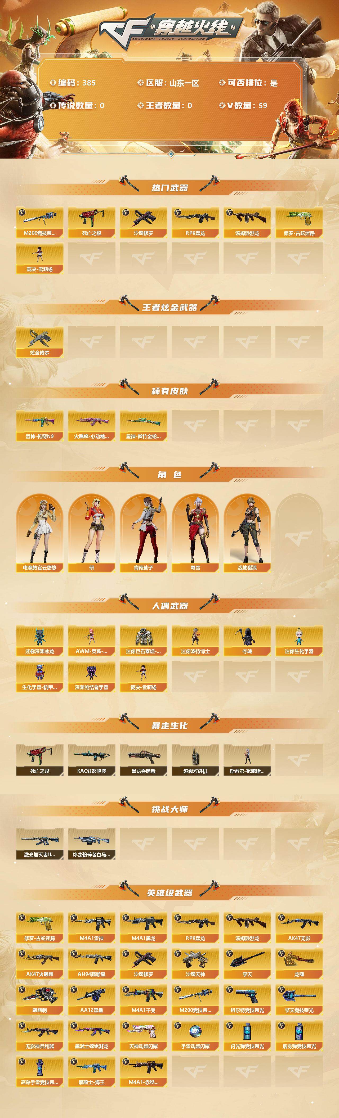 [13037121]【385】56V/100级/元帅/1炫金/3英雄/修罗-古蛇迷踪/M200-竞技荣光/死亡之眼/汤姆逊-烈龙/RPK-盘龙/裁决-雪莉杨/沙鹰-修罗/炫金修罗/星神-傲竹金蛇/雷神-传奇N9/火麒麟-心动糖果/电竞教官-云悠悠/研/战地猎狐/蜀雪/青霞仙子/AWM-灵狐-15周年嘉年华/迷你巨石泰坦-魔花研究所/迷你深渊冰龙/迷你波特博士/夺魂/迷你生化手雷/生化手雷-机甲核心/深渊终结者手雷/KAC-狂怒咆哮/黑龙吞噬者/斯泰尔-枪娘暗刃/超级对讲机/冰龙粉碎者-白马银枪/激光毁灭者III-白马银枪/M4A1-千变/AK47-火麒麟/M4A1-黑龙/M4A1-雷神/AK47-无影/AN94-超新星/无影-神兵利器/AK47-黑武士-锦绣游龙/黑骑士-海王/AA-12-雷霆/沙鹰-天神/柯尔特-竞技荣光/天神-动感闪耀/龙啸/擎天/麒麟刺/擎天-竞技荣光/高爆手雷-竞技荣光/手雷-动感闪耀/闪光弹-竞技荣光/烟雾弹-竞技荣光/M4A1-赤狱骑士【实名情况: 可二次实名】