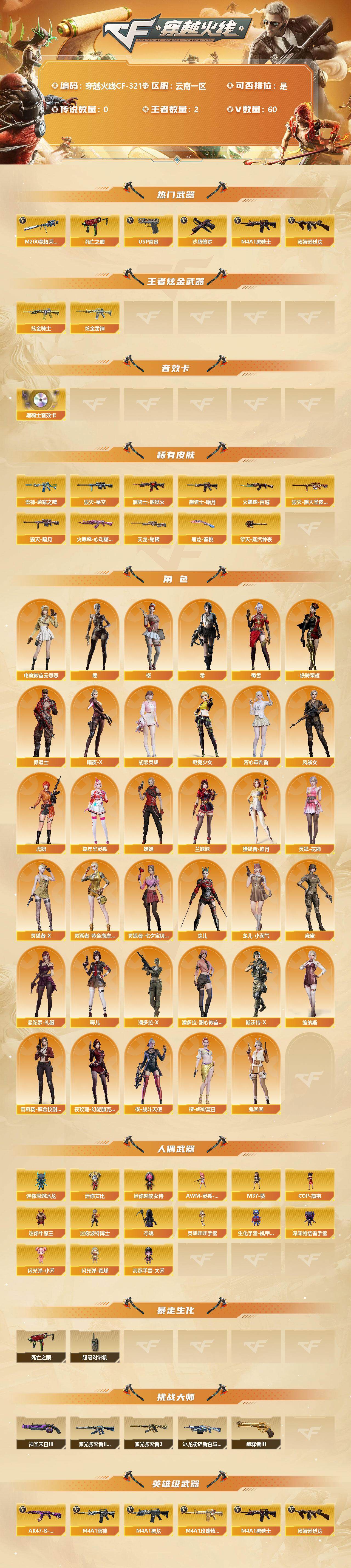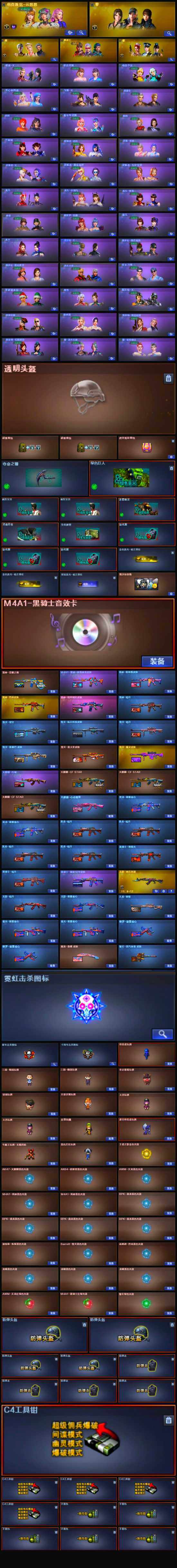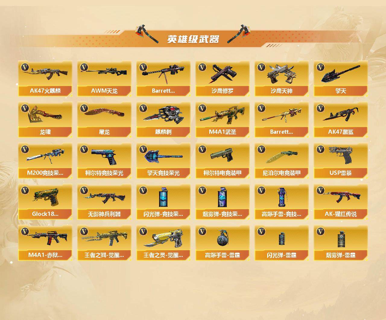 【英雄级武器】:AK47-火麒麟*2,M4A1-黑龙,M4A1-雷神,M4A1-黑骑士,M4A1-武圣,AK47-黑鲨,无影-神兵利器,M4A1-玫瑰精灵,王者之戮-觉醒版,AK-47-猩红传说,AK47-B-常胜将军,AWM-天龙,Barrett-毁灭,Barrett-朱雀,M200-竞技荣光,汤姆逊-烈龙*2,沙鹰-修罗*2,沙鹰-天神,US【实名情况: 可二次实名】