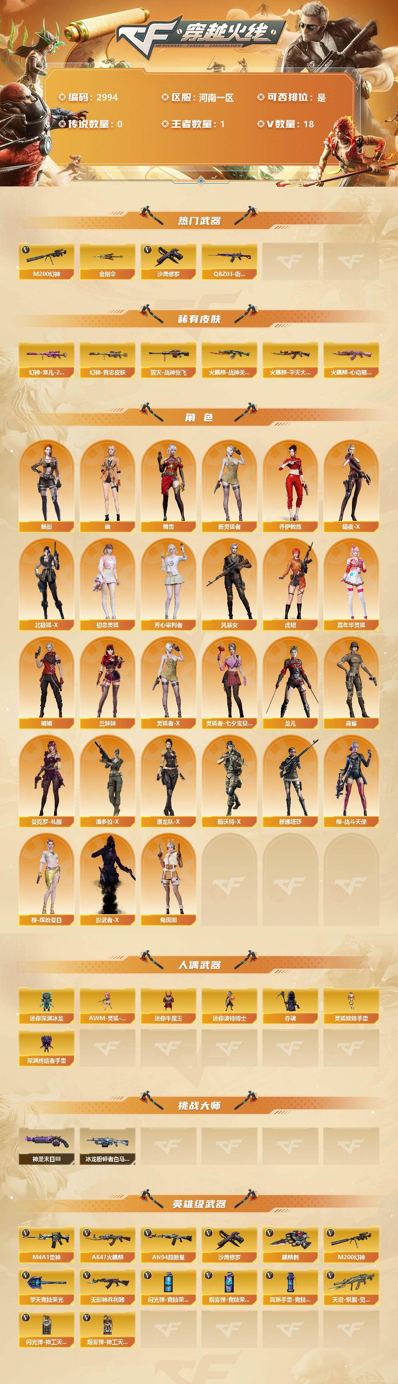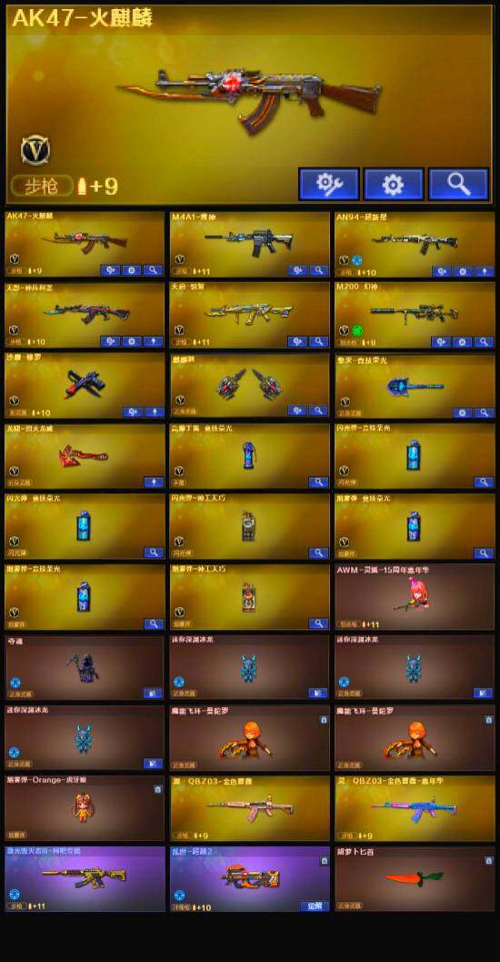 【英雄级武器】:AK47-火麒麟*2,M4A1-雷神,AN94-超新星,无影-神兵利器,天启-悦智-觉醒版,M200-幻神,沙鹰-修罗,麒麟刺,擎天-竞技荣光,高爆手雷-竞技荣光,闪光弹-竞技荣光*2,闪光弹-神工天巧,烟雾弹-竞技荣光*2,烟雾弹-神工天巧