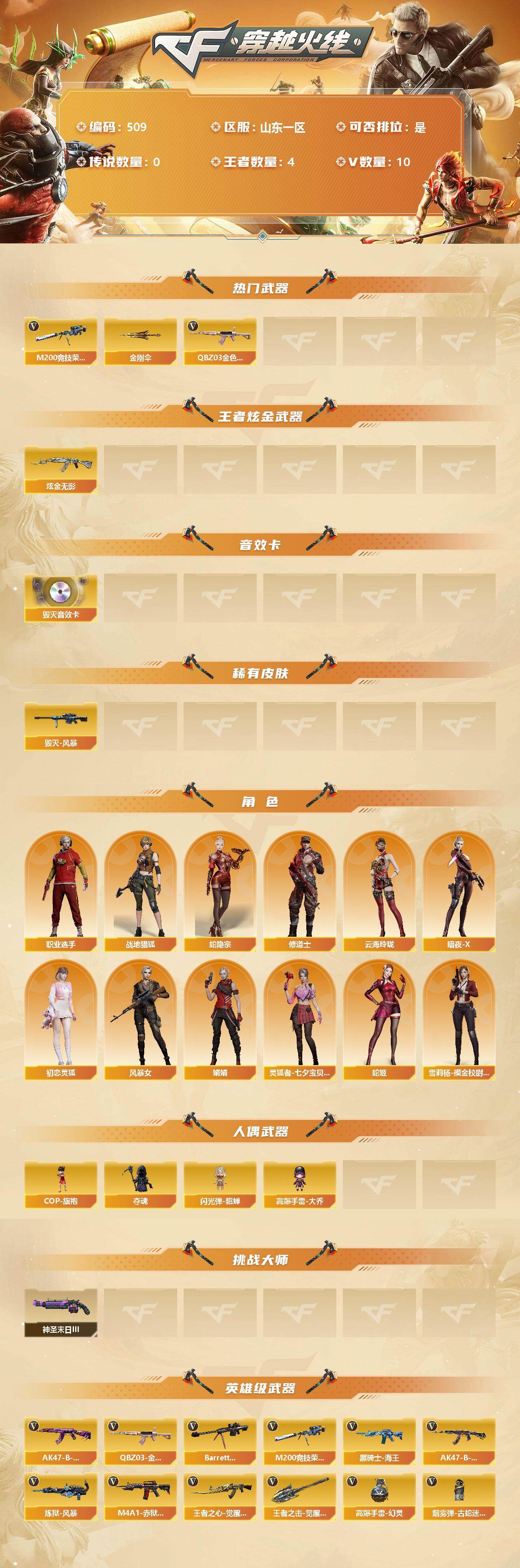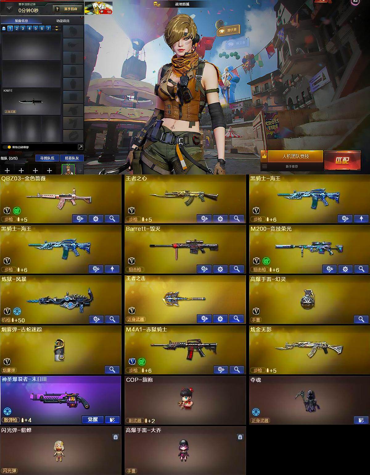 【英雄级武器】:QBZ03-金色蔷薇,王者之心-觉醒版,AK47-B-战神,黑骑士-海王*2,AK47-B-常胜将军,Barrett-毁灭,M200-竞技荣光,炼狱-风暴,王者之击-觉醒版,高爆手雷-幻灵,烟雾弹-古蛇迷踪,M4A1-赤狱骑士
