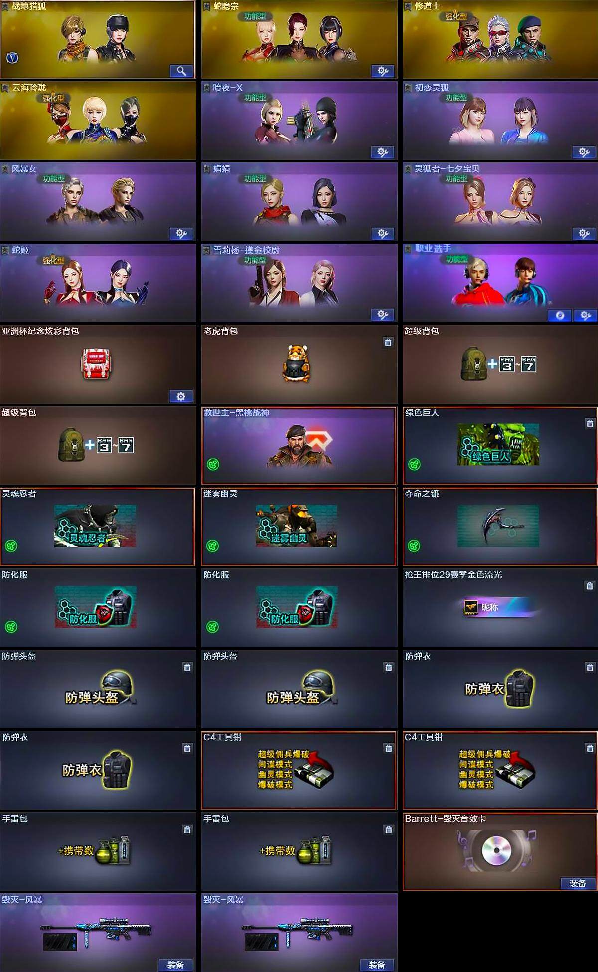 【道具】:亚洲杯纪念炫彩背包,老虎背包,超级背包*2,救世主-黑桃战神,绿色巨人,灵魂忍者,迷雾幽灵,夺命之镰,防化服*2,枪王排位29赛季金色流光,防弹头盔*2,防弹衣*2,C4工具钳*2,手雷包*2