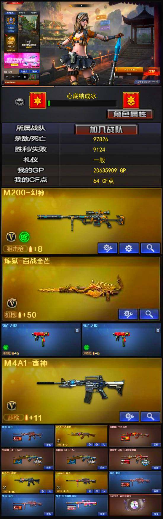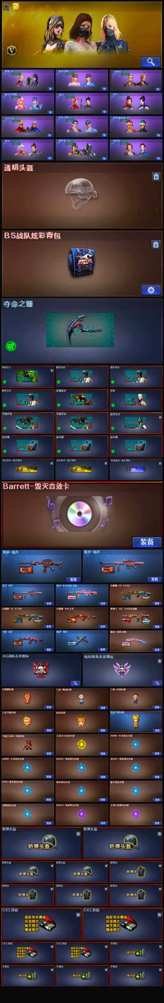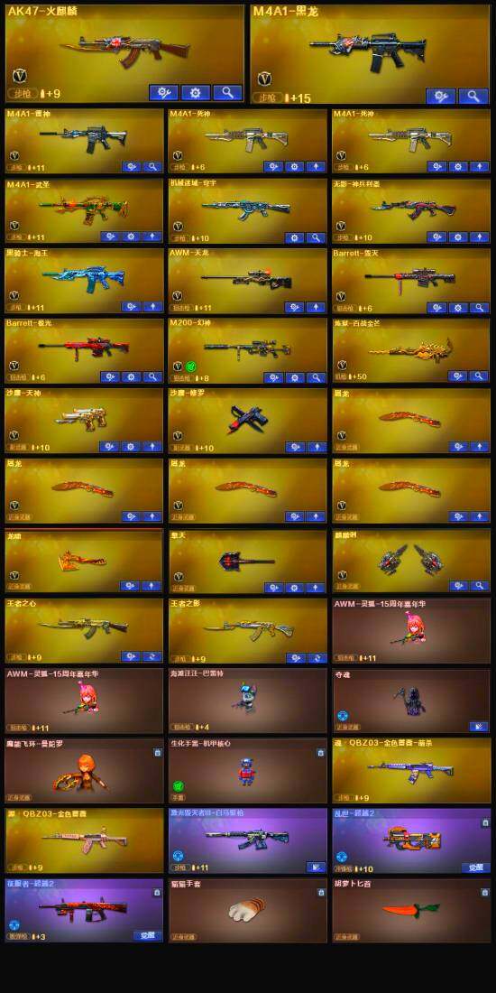 【英雄级武器】:AK47-火麒麟,M4A1-黑龙,M4A1-雷神,M4A1-死神*2,M4A1-武圣,无影-神兵利器,黑骑士-海王,AWM-天龙,Barrett-毁灭,Barrett-极光,M200-幻神,炼狱-百战金芒,沙鹰-修罗,沙鹰-天神,屠龙*4,龙啸,擎天,麒麟刺,麒麟刺-百战金芒,M4A1-赤狱骑士,M4A1-苍鸣雷神,Barrett-碧霄极光