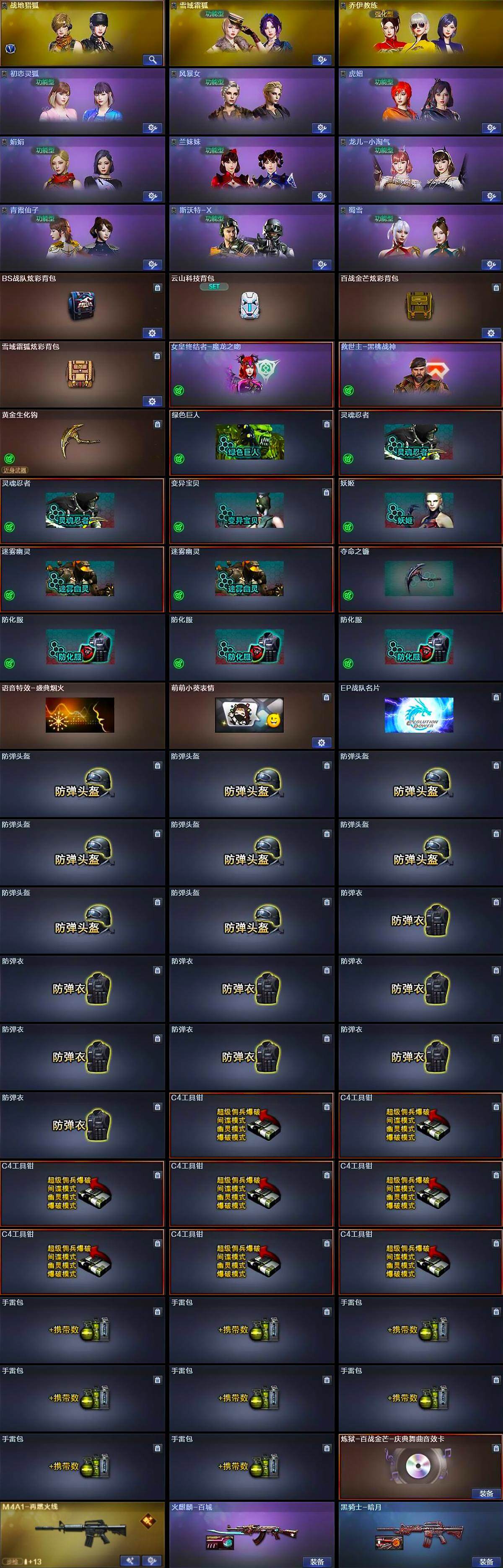 【道具】:BS战队炫彩背包,云山科技背包,百战金芒炫彩背包,雪域霜狐炫彩背包,女皇终结者-魔龙之吻,救世主-黑桃战神,黄金生化钩,绿色巨人,灵魂忍者*2,变异宝贝,妖姬,迷雾幽灵*2,夺命之镰,防化服*3,语音特效-盛典烟火,萌萌小葵表情,EP战队名片,防弹头盔*8,防弹衣*8,C4工具钳*8,手雷包*8