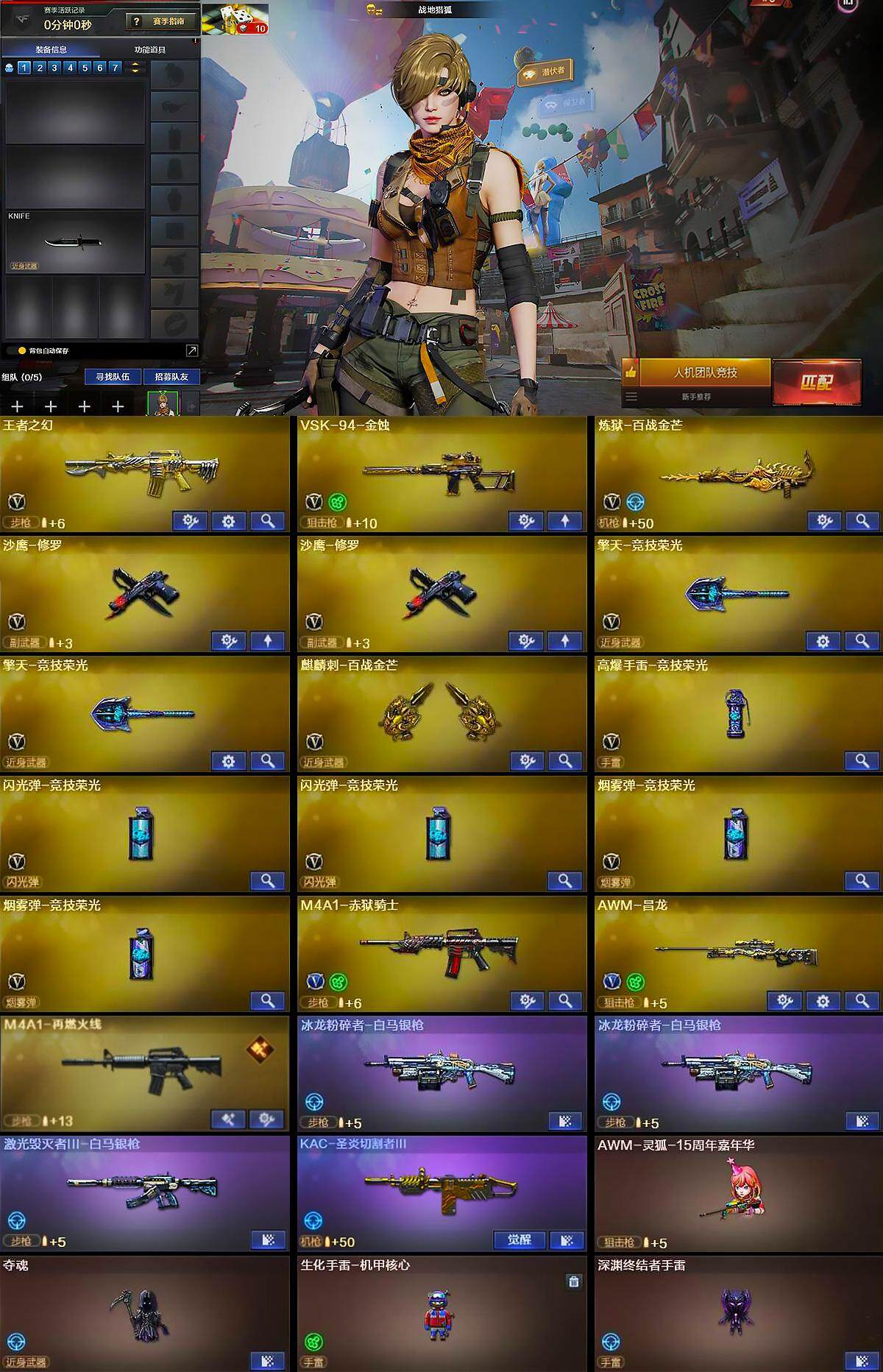 【英雄级武器】:王者之幻-觉醒版,VSK-94-金蚀,炼狱-百战金芒,沙鹰-修罗*2,擎天-竞技荣光*2,麒麟刺-百战金芒,高爆手雷-竞技荣光,闪光弹-竞技荣光*2,烟雾弹-竞技荣光*2,M4A1-赤狱骑士,AWM-昌龙