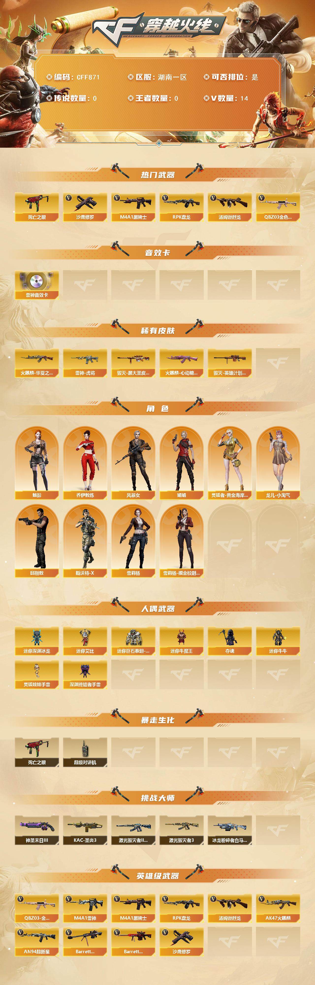【CFF871】13V/100级/元帅/1英雄/QBZ03-金色蔷薇/死亡之眼/M4A1-黑骑士/汤姆逊-烈龙/RPK-盘龙/沙鹰-修罗/M4A1-雷神音效卡/雷神-虎将/火麒麟-华夏之心/火麒麟-心动糖果/毁灭-黑大圣皮肤/毁灭-英雄计划 皮肤/魅影/乔伊教练/风暴女/娟娟/灵狐者-黄金海岸/龙儿-小淘气/邱刚敖/斯沃特-X/雪莉杨/雪莉杨-摸金校尉/迷你深渊冰龙/迷你牛魔王/夺魂/迷你牛牛/深渊终结者手雷/迷你艾比/迷你巨石泰坦-魔花研究所/灵狐娃娃手雷/超级对讲机/冰龙粉碎者-白马银枪/激光毁灭者III-白马银枪/激光毁灭者III/KAC-圣炎切割者III/神圣爆裂者-末日III/AK47-火麒麟/M4A1-雷神/AN94-超新星/Barrett-毁灭/Barrett-极光/亚洲杯纪念炫彩背包/绿色巨人/灵魂忍者/迷雾幽灵/夺命之镰/防化服/C4-沙漠/防弹头盔/防弹衣/C4工具钳/手雷包【是否可排位: 可排位】