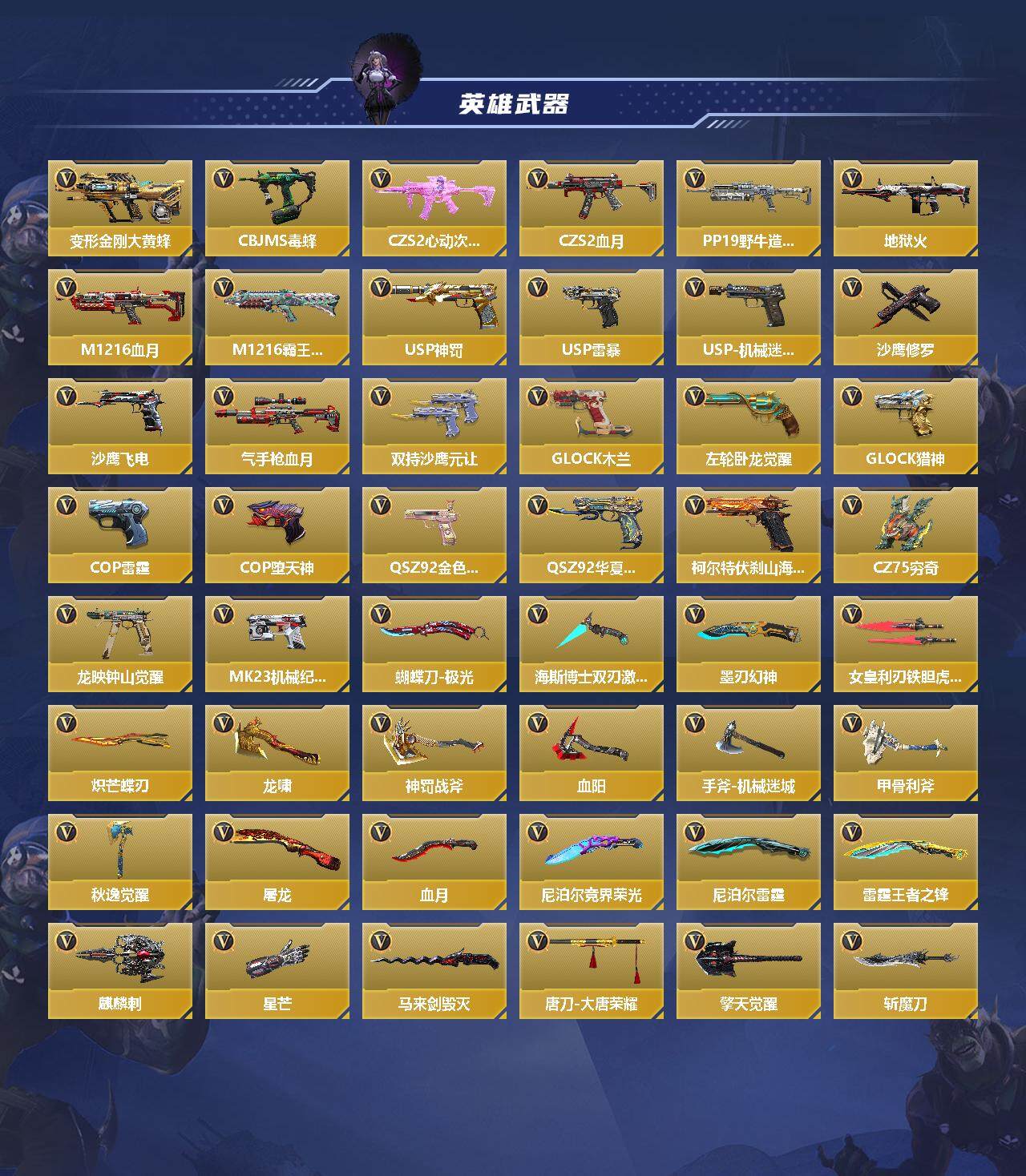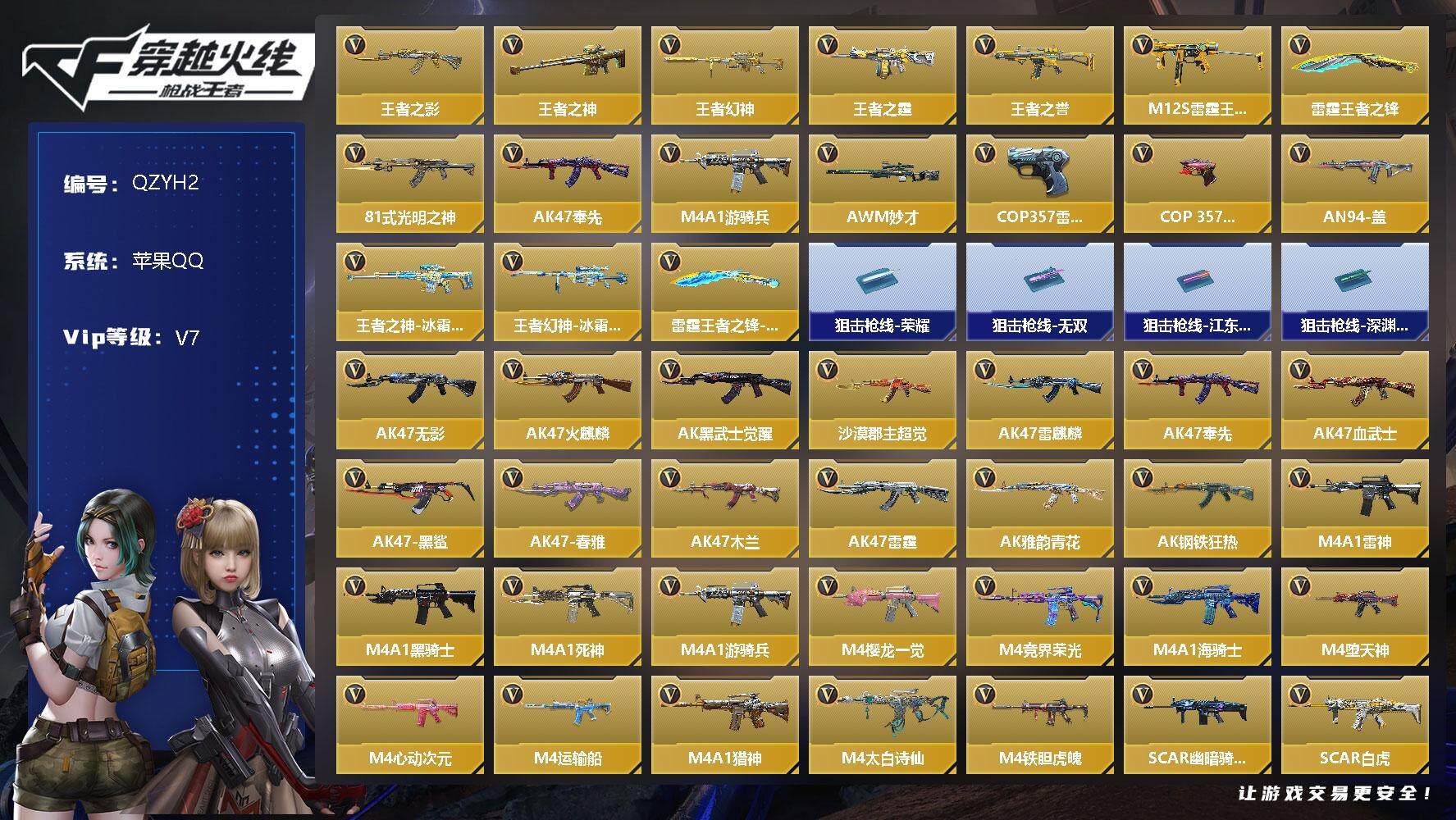 【QZYH2】VIP7/231V/王者之影/王者之神/王者幻神/王者之霆/王者之誉/M12S-雷霆王者/雷霆王者之锋/81式-光明之神/AK47-奉先/M4A1-游骑兵/AWM-妙才/COP 357-雷霆/COP 357-堕天神/AN94-盖/王者幻神-冰霜奇迹/雷霆王者之锋-冰霜奇迹/王者之神-冰霜奇迹/狙击枪线-深渊领主/狙击枪线-江东骇虎/狙击枪线-无双/狙击枪线-荣耀/葵/关小雨/乔月/炽天使-X/祝融夫人/钟小魁/AK47-无影/AK47-火麒麟/AK47-黑武士觉醒/AK47-沙漠郡主-超觉/AK47-雷麒麟/奉先/AK47-血武士/AK47-黑鲨/AK47-春雅/AK47-木兰/AK47-雷霆/AK47-雅韵青花/AK47-钢铁狂热/M4A1-雷神/M4A1-黑骑士/M4A1-死神/M4游骑兵/M4A1-樱龙·一觉/M4竞界荣光/M4A1-海骑士/M4A1-堕天神/M4A1-心动次元/M4A1-运输船/M4A1-猎神/M4A1-太白诗仙/M4A1-铁胆虎魄/SCAR-幽暗骑士/SCAR Light-白虎/SCAR-探星者/SCAR-印刷术/AN94-四凶觉醒/9A91-天神/M14EBR-拂影/AK12-天启/QBZ03-玉面羞花/HK417-炎龙铠甲/G36-机械纪元/MK47-云舞/MK47-金角巨兽/G3A3-衍神兵/QBZ191-帝皇铠甲/AWM-天龙/AWM妙才/AWM-天使/AWM-大湾溢彩/巴雷特-毁灭/巴雷特-极光/巴雷特-雷神/M200-心动次元/09式狙-天神/98K-星神/加特林-堡垒/加特林-蟒蛇/刘易斯-血月/QBB95-极光/MK5-极光/汤姆逊-烈龙/双持斯泰尔-天使/QCW05-变形金刚·大黄蜂/CBJ-MS-毒蜂/CZS2-心动次元/CZS2-血月/PP19野牛-造纸术/地狱火/M1216-血月/M1216-霸王龙/USP-神罚/USP雷暴/USP-机械迷城/沙鹰-修罗/沙鹰-飞电/气手枪-血月/双持沙鹰-元让/改装GLOCK-木兰/左轮-卧龙觉醒/GLOCK18-猎神/改装GLOCK-魔杀族/COP雷霆/QSZ92-金色蔷薇/QSZ92-华夏传说/柯尔特-伏刹山海觉醒/CZ75-穷奇/CZ75-龙映钟山觉醒/MK23-机械纪元/蝴蝶刀-极光/海斯博士双刃-激光/墨刃-幻神/女皇利刃-铁胆虎魄/炽芒蝶刃/龙啸/神罚战斧/血阳/手斧-机械迷城/甲骨利斧/秋逸觉醒/屠龙/血月/尼泊尔-竞界荣光/尼泊尔-雷霆/太白诗仙扇/麒麟刺/星芒/马来剑-毁灭/唐刀-大唐荣耀/擎天觉醒/斩魔刀【操作系统: 苹果QQ】
