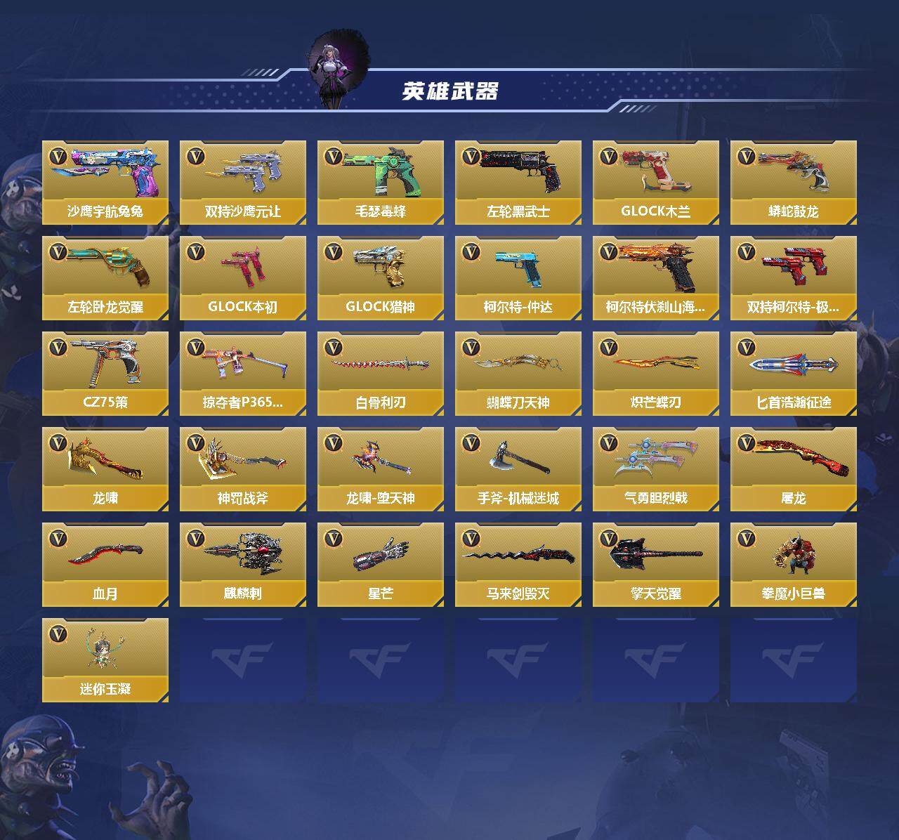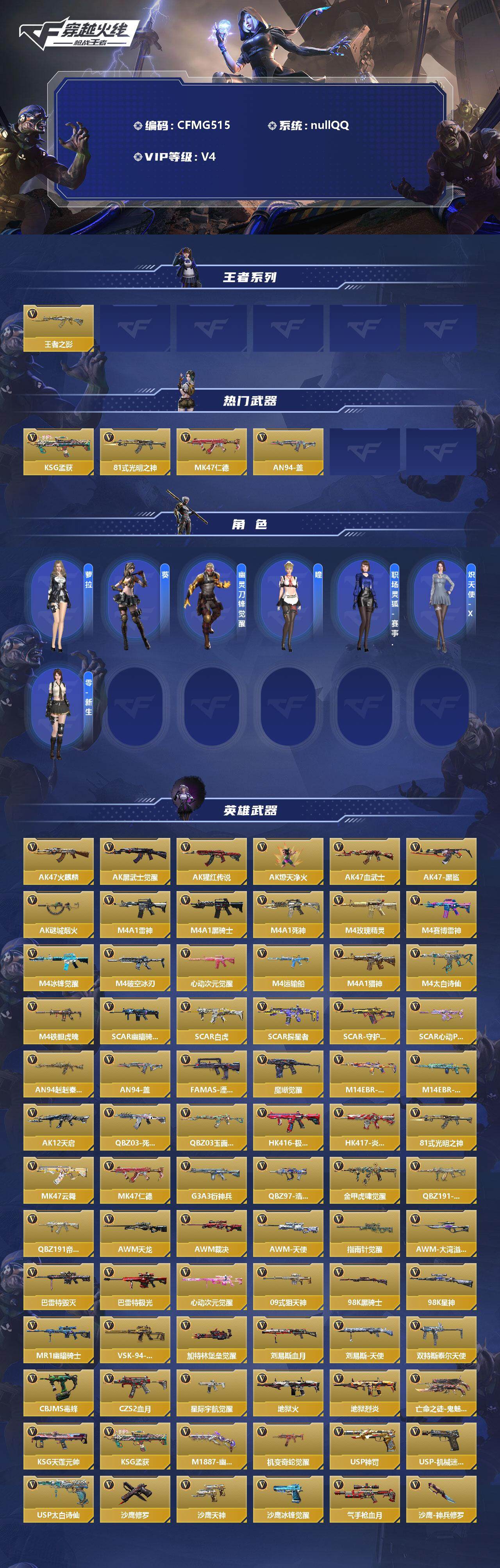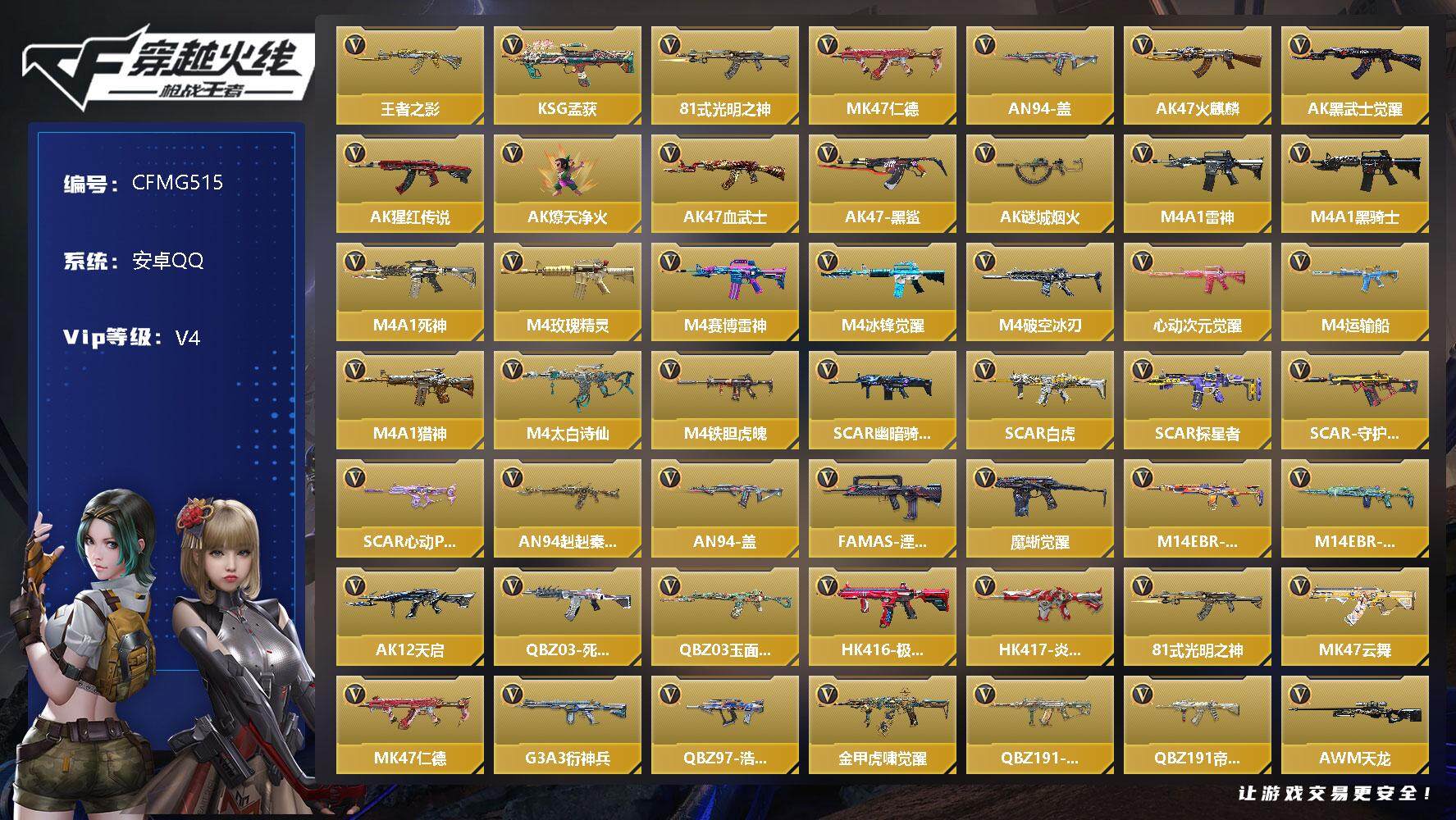 【CFMG515】VIP4/202V/1王者/王者之影/KSG-孟获/81式-光明之神/MK47-仁德/AN94-盖/萝拉/葵/幽灵刀锋-觉醒/瞳/职场灵狐赛事经理/炽天使-X/零-新生/AK47-火麒麟/AK47-黑武士觉醒/AK47-猩红传说/AK47-燎天净火/AK47-血武士/AK47-黑鲨/AK47-谜城烟火/M4A1-雷神/M4A1-黑骑士/M4A1-死神/M4A1-玫瑰精灵/M4A1-赛博雷神/M4A1-冰锋觉醒/M4A1-破空冰刃/M4A1-心动次元觉醒/M4A1-运输船/M4A1-猎神/M4A1-太白诗仙/M4A1-铁胆虎魄/SCAR-幽暗骑士/SCAR Light-白虎/SCAR-探星者/SCAR-守护者觉醒/SCAR-心动PICK/AN94-赳赳秦师/FAMAS-湮灭/9A91-魔蜥觉醒/M14EBR-拂影/M14EBR-葫芦山庄/AK12-天启/QBZ03-死神/QBZ03-玉面羞花/HK416-极光/HK417-炎龙铠甲/MK47-云舞/仁德/G3A3-衍神兵/QBZ97-浩瀚征途/QBZ191-金甲虎啸觉醒/QBZ191-封神榜/QBZ191-帝皇铠甲/AWM-天龙/AWM-裁决/AWM-天使/AWM-指南针觉醒/AWM-大湾溢彩/巴雷特-毁灭/巴雷特-极光/M200-心动次元觉醒/09式狙-天神/98K-黑骑士/98K-星神/MR1-幽暗骑士/VSK-94-金蚀/加特林-堡垒觉醒/刘易斯-血月/刘易斯-天使/双持斯泰尔-天使/CBJ-MS-毒蜂/CZS2-血月/DDM4-PDW-星际宇航觉醒/地狱火/地狱烈炎/亡命之徒-鬼魅双生/KSG-天蓬元帅/M1887-幽冥玄喵觉醒/Origin12-机变奇蛇觉醒/USP-神罚/USP-机械迷城/USP-太白诗仙/沙鹰-修罗/沙鹰-天神/沙鹰-冰锋觉醒/气手枪-血月/沙鹰-神兵修罗/沙鹰-宇航兔兔/双持沙鹰-元让/毛瑟-毒蜂/猎弩-虫族女王/蚩尤战弓觉醒/左轮-黑武士/改装GLOCK-木兰/蟒蛇-鼓龙/左轮-卧龙觉醒/双持GLOCK18-本初/GLOCK18-猎神/柯尔特-仲达/柯尔特-伏刹山海觉醒/双持柯尔特-极光/CZ75-策/掠夺者P365-虹舞/白骨利刃/蝴蝶刀-天神/炽芒蝶刃/匕首-浩瀚征途/龙啸/神罚战斧/龙啸-堕天神/手斧-机械迷城/气勇胆烈戟/屠龙/血月/太白诗仙扇/麒麟刺/星芒/马来剑-毁灭/擎天觉醒/拳魔小巨兽/迷你玉凝【操作系统: 安卓QQ】