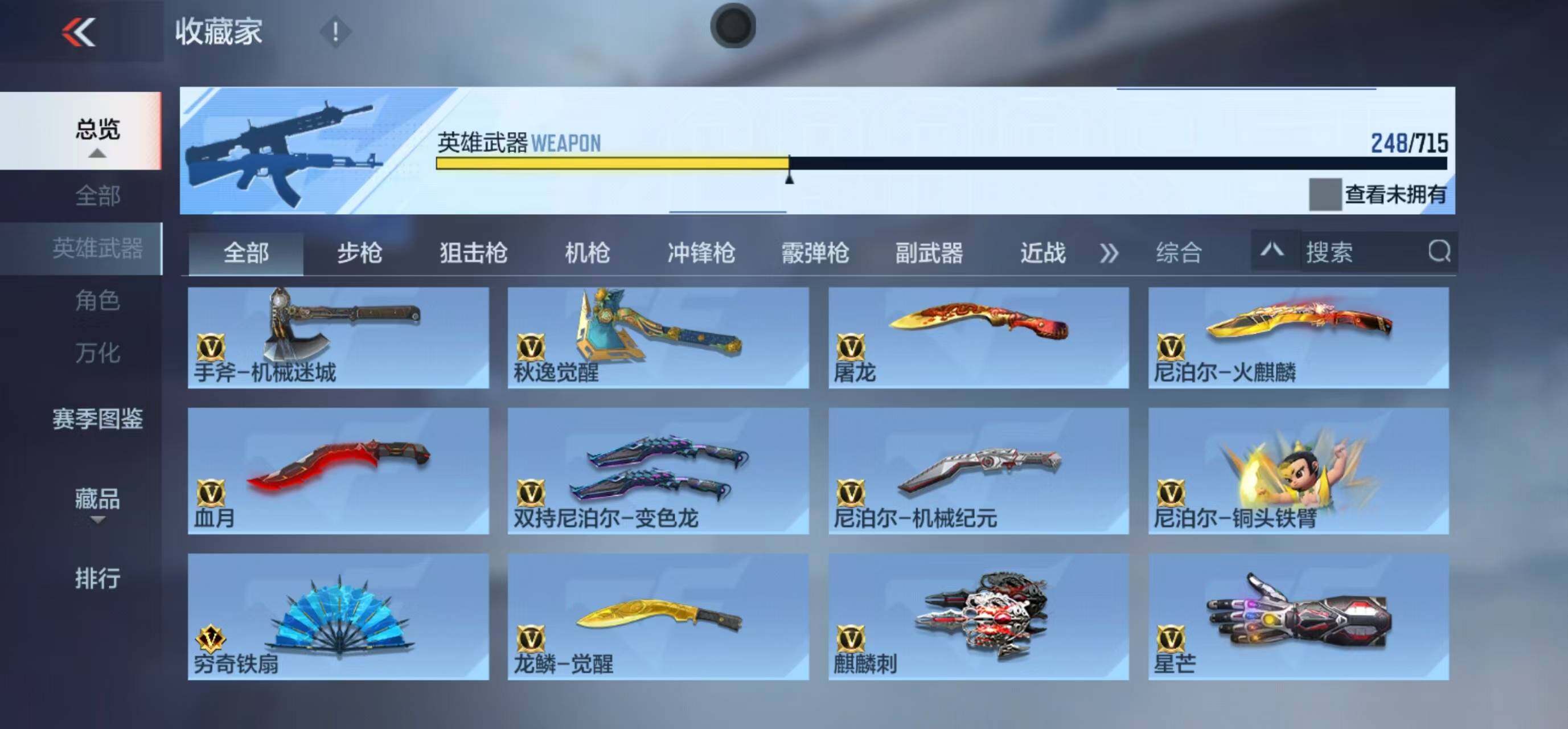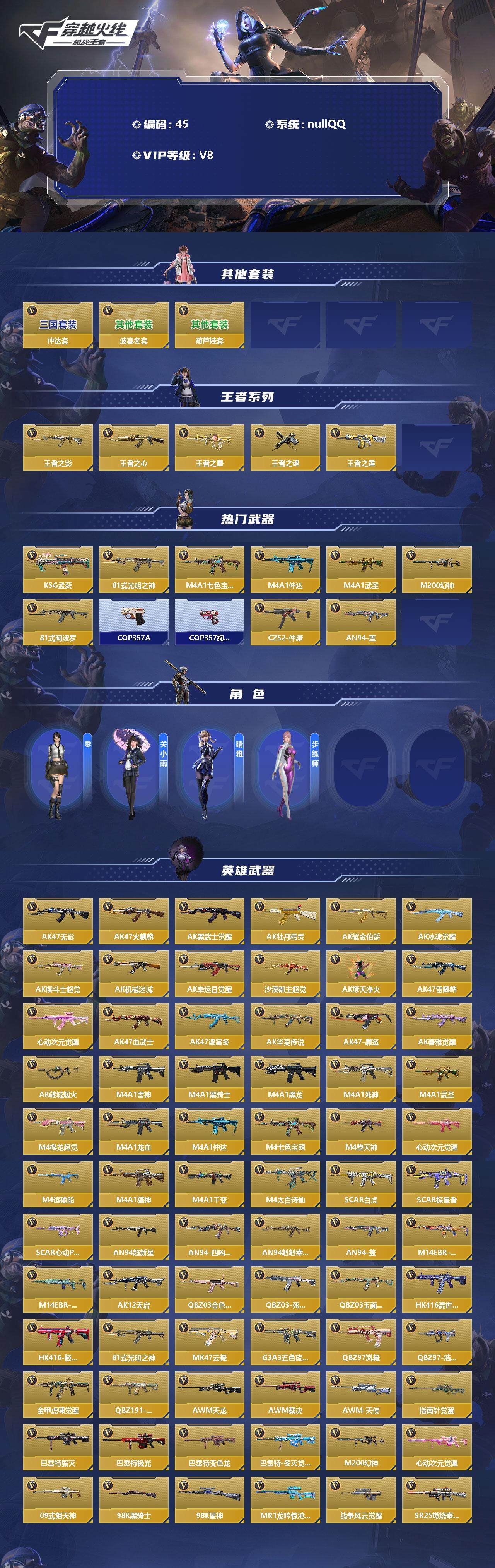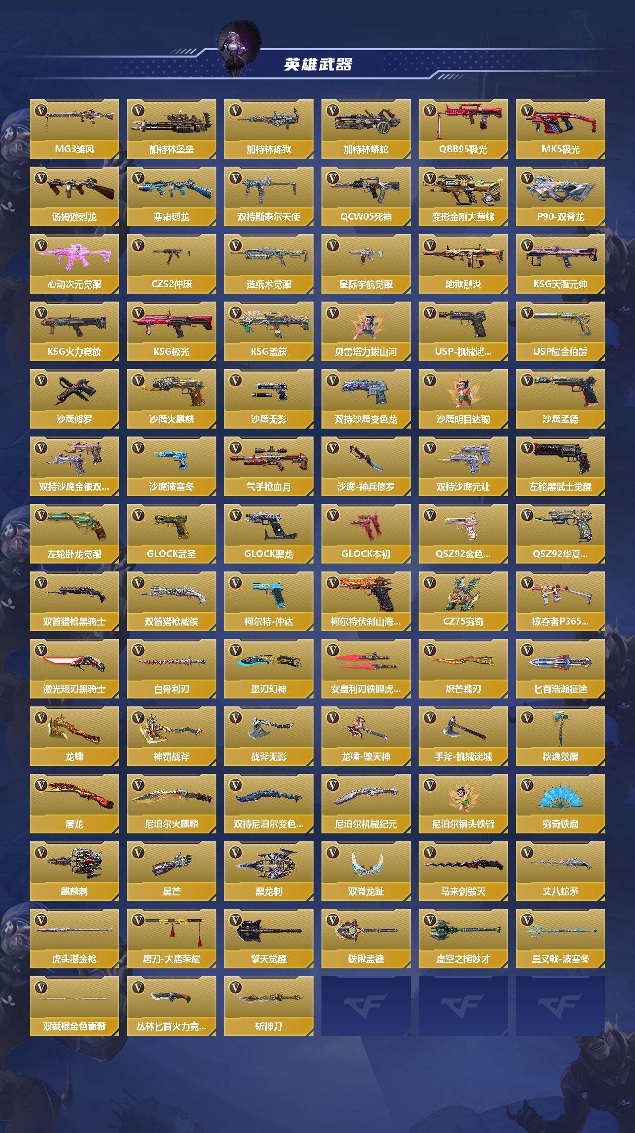 【英雄武器】:AK47-无影,AK47-火麒麟,AK47-黑武士觉醒,AK47-牡丹精灵,AK47-耀金伯爵,AK47-冰魂觉醒,AK47-樱斗士-超觉,AK47-机械迷城,AK47-幸运日觉醒,AK47-沙漠郡主-超觉,AK47-燎天净火,AK47-雷麒麟,AK47-心动次元觉醒,AK47-血武士,AK47-波塞冬,AK47-华夏传说,AK47-黑鲨,AK47-春雅觉醒,AK47-谜城烟火,M4A1-雷神*4,M4A1-黑骑士*2,M4A1-黑龙,M4A1-死神*2,M4A1-武圣,M4A1-樱龙·超觉,M4A1-龙血*2,M4A1-仲达,M4A1-七色宝葫*2,M4A1-堕天神,M4A1-心动次元觉醒,M4A1-运输船,M4A1-猎神,M4A1-千变,M4A1-太白诗仙,SCAR Light-白虎,SCAR-探星者,SCAR-心动PICK,AN94-超新星,AN94-四凶觉醒,AN94-赳赳秦师,AN94-盖,M14EBR-拂影,M14EBR-葫芦山庄,AK12-天启,QBZ03-金色蔷薇*2,QBZ03-死神,QBZ03-玉面羞花,HK416-混世行者,HK416-极光,81式-光明之神,MK47-云舞,G3A3-五色琉璃觉醒,QBZ97-岚舞,QBZ97-浩瀚征途,QBZ191-金甲虎啸觉醒,QBZ191-封神榜,AWM-天龙,AWM-裁决,AWM-天使,AWM-指南针觉醒,巴雷特-毁灭*2,巴雷特-极光*3,巴雷特-变色龙,巴雷特-冬灭觉醒,M200-幻神,M200-心动次元觉醒,09式狙-天神,98K-黑骑士,98K-星神,MR1-龙吟惊沧海,GM6-战争风云觉醒,SR25-燃烧泰坦,MG3-雏凤,加特林-堡垒,加特林-炼狱,加特林-蟒蛇*3,QBB95-极光,MK5-极光*2,汤姆逊-烈龙*3,寒霜烈龙,双持斯泰尔-天使,QCW05-死神,QCW05-变形金刚·大黄蜂,P90-双脊龙,CZS2-心动次元觉醒,CZS【实名情况: 不可二次实名】