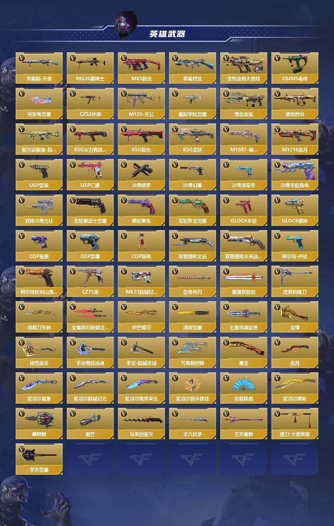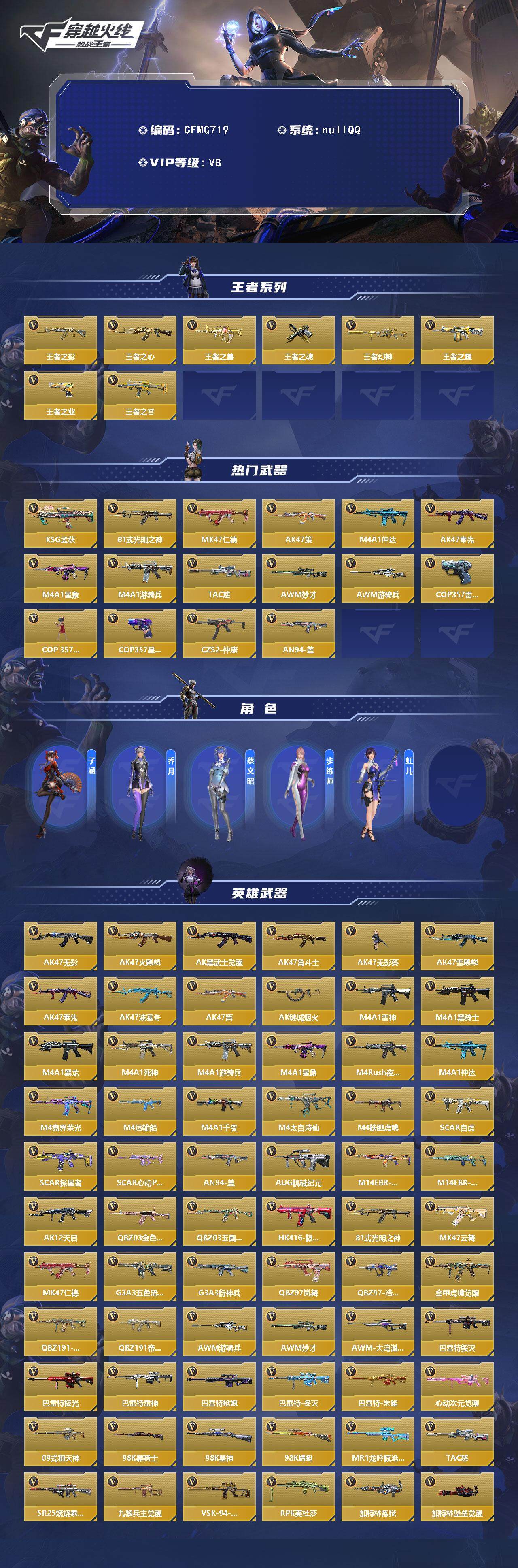 【CFMG719】VIP8/267V/王者之影/王者之心/王者之兽/王者之魂/王者幻神/王者之霆/王者之业/王者之誉/KSG-孟获/81式-光明之神/MK47-仁德/AK47-策/M4A1-仲达/AK47-奉先/M4A1-星象/M4A1-游骑兵/TAC-慈/AWM-妙才/AWM-游骑兵/COP 357-雷霆/COP 357-旗袍/COP 357-星象/CZS2-仲康/AN94-盖/子涵/乔月/蔡文昭/步练师/虹儿/AK47-无影/AK47-火麒麟/AK47-黑武士觉醒/AK47-角斗士/AK47-无影-葵/AK47-雷麒麟/奉先/AK47-波塞冬/策/AK47-谜城烟火/M4A1-雷神/M4A1-黑骑士/M4A1-黑龙/M4A1-死神/M4游骑兵/星象/M4A1-Rush-夜袭/仲达/M4竞界荣光/M4A1-运输船/M4A1-千变/M4A1-太白诗仙/M4A1-铁胆虎魄/SCAR Light-白虎/SCAR-探星者/SCAR-心动PICK/AUG-机械纪元/M14EBR-拂影/M14EBR-葫芦山庄/AK12-天启/QBZ03-金色蔷薇/QBZ03-玉面羞花/HK416-极光/MK47-云舞/仁德/G3A3-五色琉璃觉醒/G3A3-衍神兵/QBZ97-岚舞/QBZ97-浩瀚征途/QBZ191-金甲虎啸觉醒/QBZ191-封神榜/QBZ191-帝皇铠甲/AWM游骑兵/AWM妙才/AWM-大湾溢彩/巴雷特-毁灭/巴雷特-极光/巴雷特-雷神/巴雷特-枪娘/巴雷特-冬灭/巴雷特-朱雀/M200-心动次元觉醒/09式狙-天神/98K-黑骑士/98K-星神/98K-蜻蜓/MR1-龙吟惊沧海/TAC慈/SR25-燃烧泰坦/VSK-94-九黎兵主觉醒/VSK-94-金蚀/RPK-美杜莎/加特林-炼狱/加特林-堡垒觉醒/刘易斯-天使/MG36-黑骑士/MK5-极光/寒霜烈龙/QCW05-变形金刚·大黄蜂/CBJ-MS-毒蜂/P90-突突兔觉醒/M12S-天公/DDM4-PDW-星际宇航觉醒/嗜血金鲨/地狱烈炎/毁灭征服者-超越Max/KSG-火力竞放觉醒/KSG-极光/M1887-幽冥玄喵觉醒/M1216-血月/USP雷暴/USP-仁德/沙鹰-修罗/沙鹰-幻兽/沙鹰-波塞冬/沙鹰-宇航兔兔/双持沙鹰-元让/左轮-黑武士觉醒/蟒蛇-奉先/左轮-卧龙觉醒/双持GLOCK18-本初/GLOCK18-猎神/COP星象/COP雷霆/双管猎枪-文远/双管猎枪-未来战士/柯尔特-仲达/柯尔特-伏刹山海觉醒/CZ75-策/MK23-机械纪元/白骨利刃/雌雄双股剑/虎贲钩镰刀/蝴蝶刀-天神/女皇利刃-铁胆虎魄/炽芒蝶刃/清刚-觉醒/匕首-浩瀚征途/龙啸/神罚战斧/手斧-竞技战魂/手斧-机械迷城/气勇胆烈戟/屠龙/血月/尼泊尔-星象/尼泊尔-机械纪元/尼泊尔-竞界荣光/尼泊尔-铜头铁臂/穷奇铁扇/龙鳞-觉醒/尼泊尔-蜻蜓/太白诗仙扇/麒麟刺/星芒/马来剑-毁灭/丈八蛇矛/唐刀-华夏传说/方天画戟/唐刀-大唐荣耀/擎天觉醒【操作系统: 安卓QQ】