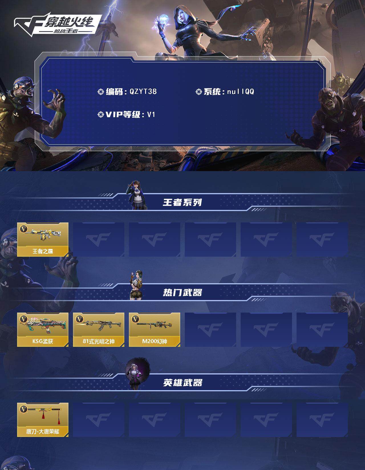 【QZYT38】VIP1/103V/王者之霆/KSG-孟获/81式-光明之神/M200-幻神/唐刀-大唐荣耀【操作系统: 安卓QQ】 【实名情况: 可二次实名】