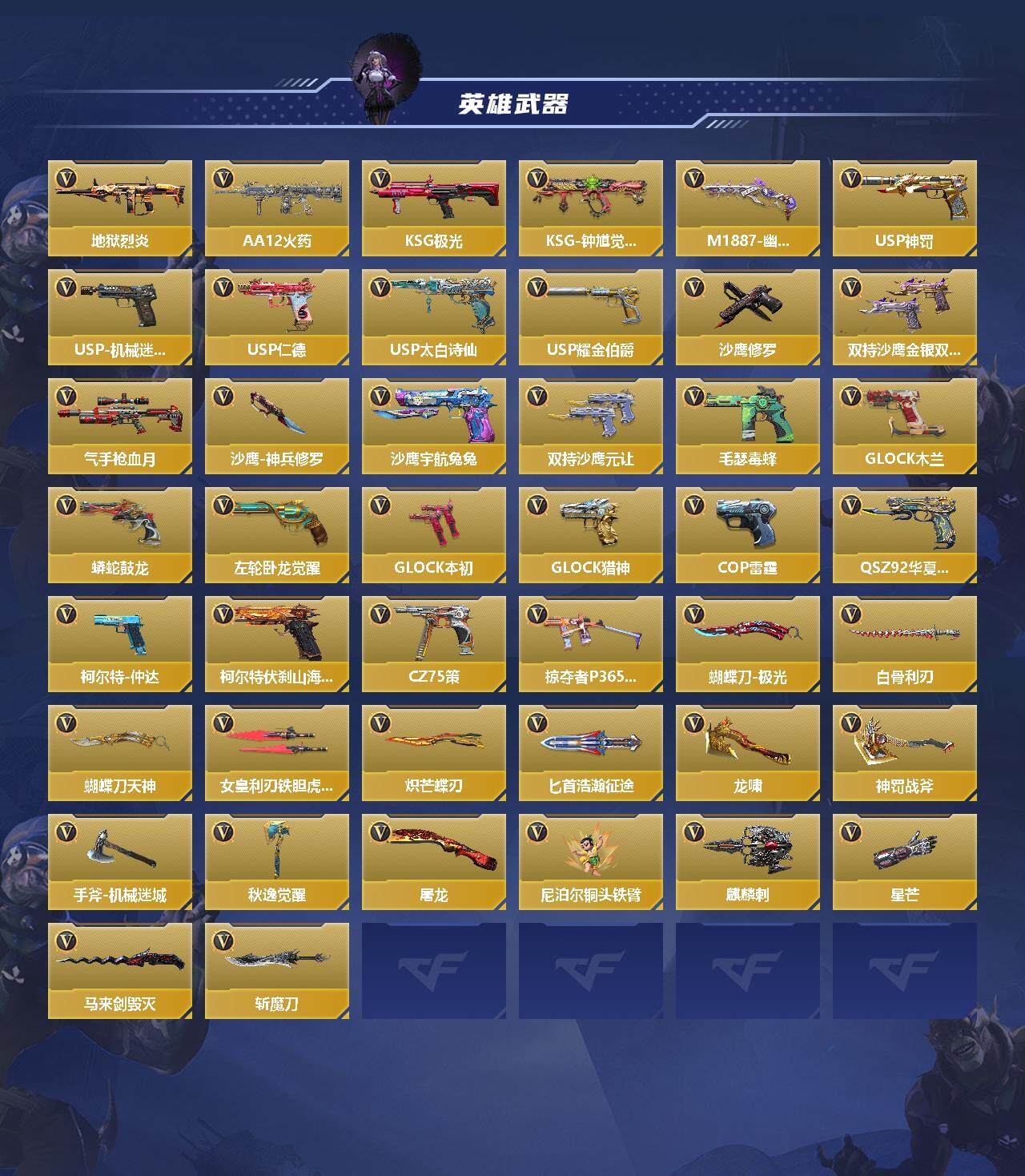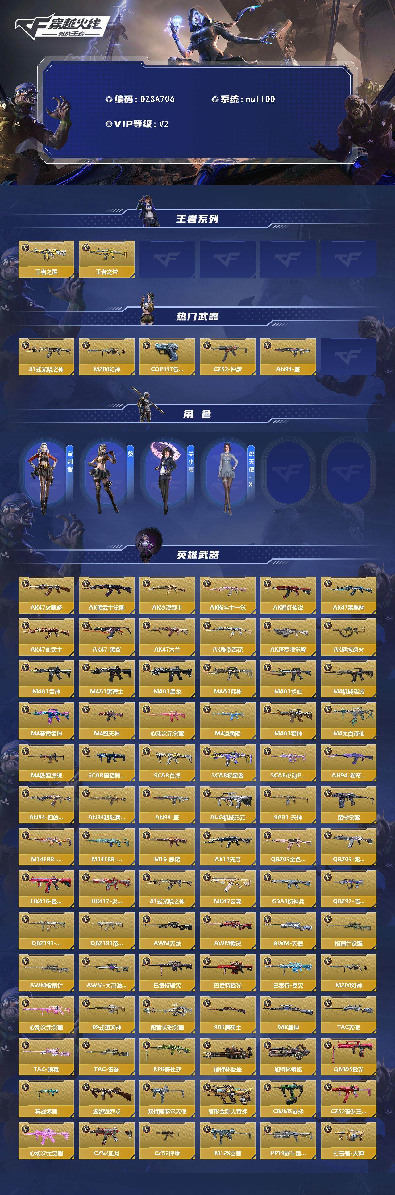 【QZSA706】VIP2/247V/2王者/王者之霆/王者之誉/81式-光明之神/M200-幻神/COP 357-雷霆/CZS2-仲康/AN94-盖/审判者/葵/关小雨/炽天使-X/AK47-火麒麟/AK47-黑武士觉醒/AK47-沙漠领主/AK47-樱斗士-一觉/AK47-猩红传说/AK47-雷麒麟/AK47-血武士/AK47-黑鲨/AK47-木兰/AK47-雅韵青花/AK47-塔罗牌觉醒/AK47-谜城烟火/M4A1-雷神/M4A1-黑骑士/M4A1-黑龙/M4A1-死神/M4A1-龙血/M4A1-机械迷城/M4A1-赛博雷神/M4A1-堕天神/M4A1-心动次元觉醒/M4A1-运输船/M4A1-猎神/M4A1-太白诗仙/M4A1-铁胆虎魄/SCAR-幽暗骑士/SCAR Light-白虎/SCAR-探星者/SCAR-心动PICK/AN94-卷帘大将军/AN94-四凶觉醒/AN94-赳赳秦师/AUG-机械纪元/9A91-天神/9A91-魔蜥觉醒/M14EBR-拂影/M14EBR-葫芦山庄/M16-恶魔/AK12-天启/QBZ03-金色蔷薇/QBZ03-死神/HK416-极光/HK417-炎龙铠甲/MK47-云舞/G3A3-衍神兵/QBZ97-浩瀚征途/QBZ191-封神榜/QBZ191-帝皇铠甲/AWM-天龙/AWM-裁决/AWM-天使/AWM-指南针觉醒/AWM-指南针/AWM-大湾溢彩/巴雷特-毁灭/巴雷特-极光/巴雷特-冬灭/幻神/M200-心动次元觉醒/09式狙-天神/09式狙-魔音长歌觉醒/98K-黑骑士/98K-星神/TAC-天使/TAC-晴舞/TAC-雷暴/RPK-美杜莎/加特林-堡垒/加特林-蟒蛇/QBB95-极光/QBB95-再战涿鹿/汤姆逊-烈龙/双持斯泰尔-天使/QCW05-变形金刚·大黄蜂/CBJ-MS-毒蜂/CZS2-善财童子/CZS2-心动次元觉醒/CZS2-血月/M12S-雷霆/PP19野牛-造纸术/打击者-天神/地狱烈炎/AA12-火药/KSG-极光/KSG-钟馗觉醒/M1887-幽冥玄喵觉醒/USP-神罚/USP-机械迷城/USP-仁德/USP-太白诗仙/USP-耀金伯爵/沙鹰-修罗/双持沙鹰-金银双煞/气手枪-血月/沙鹰-神兵修罗/沙鹰-宇航兔兔/双持沙鹰-元让/毛瑟-毒蜂/改装GLOCK-木兰/蟒蛇-鼓龙/左轮-卧龙觉醒/双持GLOCK18-本初/GLOCK18-猎神/COP雷霆/QSZ92-华夏传说/柯尔特-仲达/柯尔特-伏刹山海觉醒/CZ75-策/掠夺者P365-虹舞/蝴蝶刀-极光/白骨利刃/蝴蝶刀-天神/女皇利刃-铁胆虎魄/炽芒蝶刃/匕首-浩瀚征途/龙啸/神罚战斧/手斧-机械迷城/秋逸觉醒/屠龙/尼泊尔-铜头铁臂/龙鳞-觉醒/太白诗仙扇/麒麟刺/星芒/马来剑-毁灭/唐刀-华夏传说/斩魔刀【操作系统: 安卓QQ】