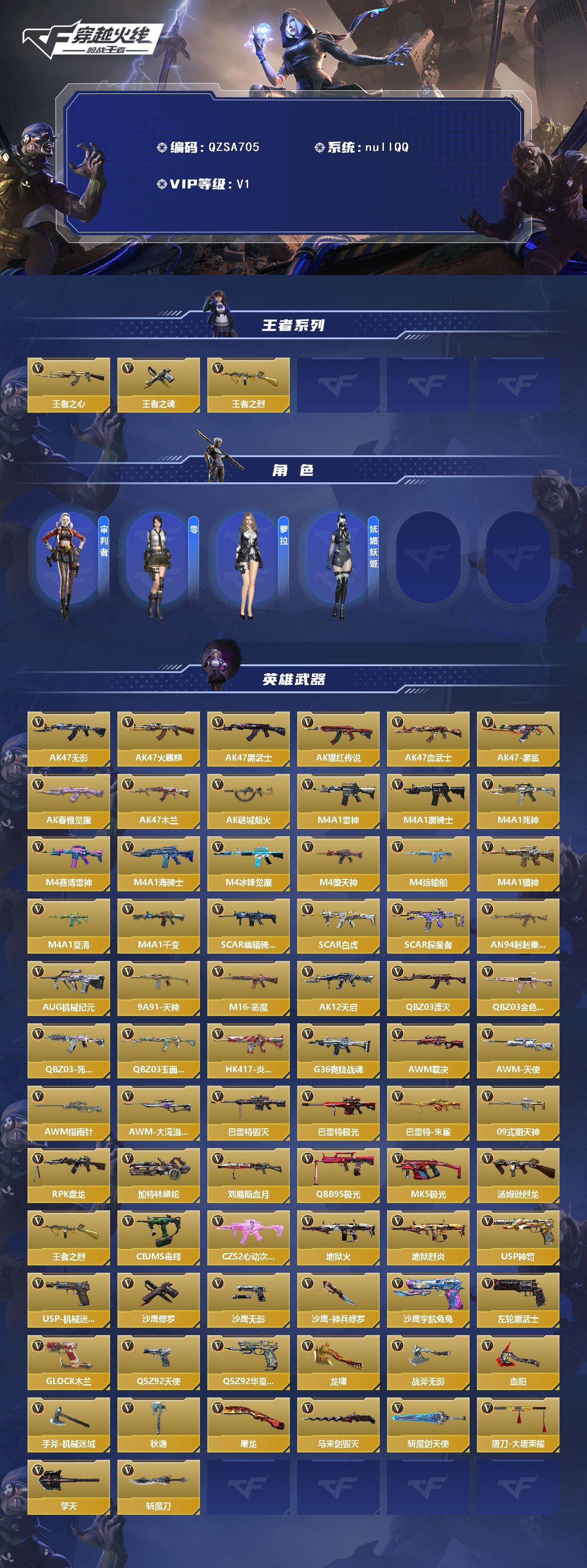【QZSA705】VIP1/150V/3王者/王者之心/王者之魂/王者之烈/审判者/零/萝拉/妩媚妖姬/AK47-无影/AK47-火麒麟/AK47-黑武士/AK47-猩红传说/AK47-血武士/AK47-黑鲨/AK47-春雅觉醒/AK47-木兰/AK47-谜城烟火/M4A1-雷神/M4A1-黑骑士/M4A1-死神/M4A1-赛博雷神/M4A1-海骑士/M4A1-冰锋觉醒/M4A1-堕天神/M4A1-运输船/M4A1-猎神/M4A1-夏清/M4A1-千变/SCAR-幽暗骑士/SCAR Light-白虎/SCAR-探星者/AN94-赳赳秦师/AUG-机械纪元/9A91-天神/M16-恶魔/AK12-天启/QBZ03-湮灭/QBZ03-金色蔷薇/QBZ03-死神/QBZ03-玉面羞花/HK417-炎龙铠甲/G36-竞技战魂/AWM-裁决/AWM-天使/AWM-指南针/AWM-大湾溢彩/巴雷特-毁灭/巴雷特-极光/巴雷特-朱雀/09式狙-天神/RPK-盘龙/加特林-蟒蛇/刘易斯-血月/QBB95-极光/MK5-极光/汤姆逊-烈龙/CBJ-MS-毒蜂/CZS2-心动次元/地狱火/地狱烈炎/USP-神罚/USP-机械迷城/沙鹰-修罗/沙鹰-无影/沙鹰-神兵修罗/沙鹰-宇航兔兔/左轮-黑武士/改装GLOCK-木兰/QSZ92-天使/QSZ92-华夏传说/龙啸/战斧-无影/血阳/手斧-机械迷城/秋逸/屠龙/太白诗仙扇/马来剑-毁灭/斩魔剑-天使/唐刀-华夏传说/唐刀-大唐荣耀/擎天/斩魔刀【操作系统: 安卓QQ】
