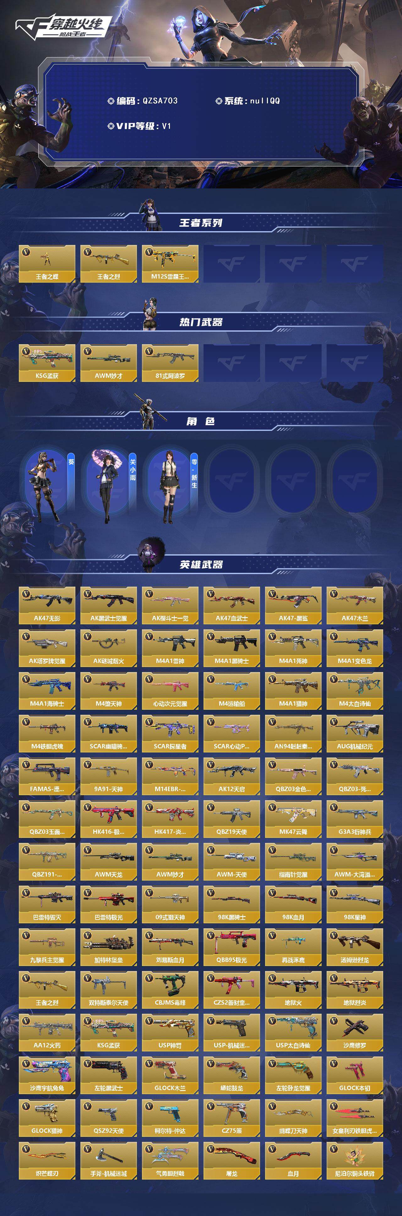 【QZSA703】VIP1/167V/3王者/王者之蝶/王者之烈/M12S-雷霆王者/KSG-孟获/AWM-妙才/81式-阿波罗/葵/关小雨/零-新生/AK47-无影/AK47-黑武士觉醒/AK47-樱斗士-一觉/AK47-血武士/AK47-黑鲨/AK47-木兰/AK47-塔罗牌觉醒/AK47-谜城烟火/M4A1-雷神/M4A1-黑骑士/M4A1-死神/M4A1-变色龙/M4A1-海骑士/M4A1-堕天神/M4A1-心动次元觉醒/M4A1-运输船/M4A1-猎神/M4A1-太白诗仙/M4A1-铁胆虎魄/SCAR-幽暗骑士/SCAR-探星者/SCAR-心动PICK/AN94-赳赳秦师/AUG-机械纪元/FAMAS-湮灭/9A91-天神/M14EBR-拂影/AK12-天启/QBZ03-金色蔷薇/QBZ03-死神/QBZ03-玉面羞花/HK416-极光/HK417-炎龙铠甲/QBZ19-天使/MK47-云舞/G3A3-衍神兵/QBZ191-封神榜/AWM-天龙/AWM妙才/AWM-天使/AWM-指南针觉醒/AWM-大湾溢彩/巴雷特-毁灭/巴雷特-极光/09式狙-天神/98K-黑骑士/98K-血月/98K-星神/VSK-94-九黎兵主觉醒/加特林-堡垒/刘易斯-血月/QBB95-极光/QBB95-再战涿鹿/汤姆逊-烈龙/双持斯泰尔-天使/CBJ-MS-毒蜂/CZS2-善财童子/地狱火/地狱烈炎/AA12-火药/USP-神罚/USP-机械迷城/USP-太白诗仙/沙鹰-修罗/沙鹰-宇航兔兔/左轮-黑武士/改装GLOCK-木兰/蟒蛇-鼓龙/左轮-卧龙觉醒/双持GLOCK18-本初/GLOCK18-猎神/QSZ92-天使/柯尔特-仲达/CZ75-策/蝴蝶刀-天神/女皇利刃-铁胆虎魄/炽芒蝶刃/手斧-机械迷城/气勇胆烈戟/屠龙/血月/尼泊尔-铜头铁臂/太白诗仙扇/麒麟刺/星芒/马来剑-毁灭/斩魔剑-天使/唐刀-大唐荣耀/擎天【操作系统: 安卓QQ】