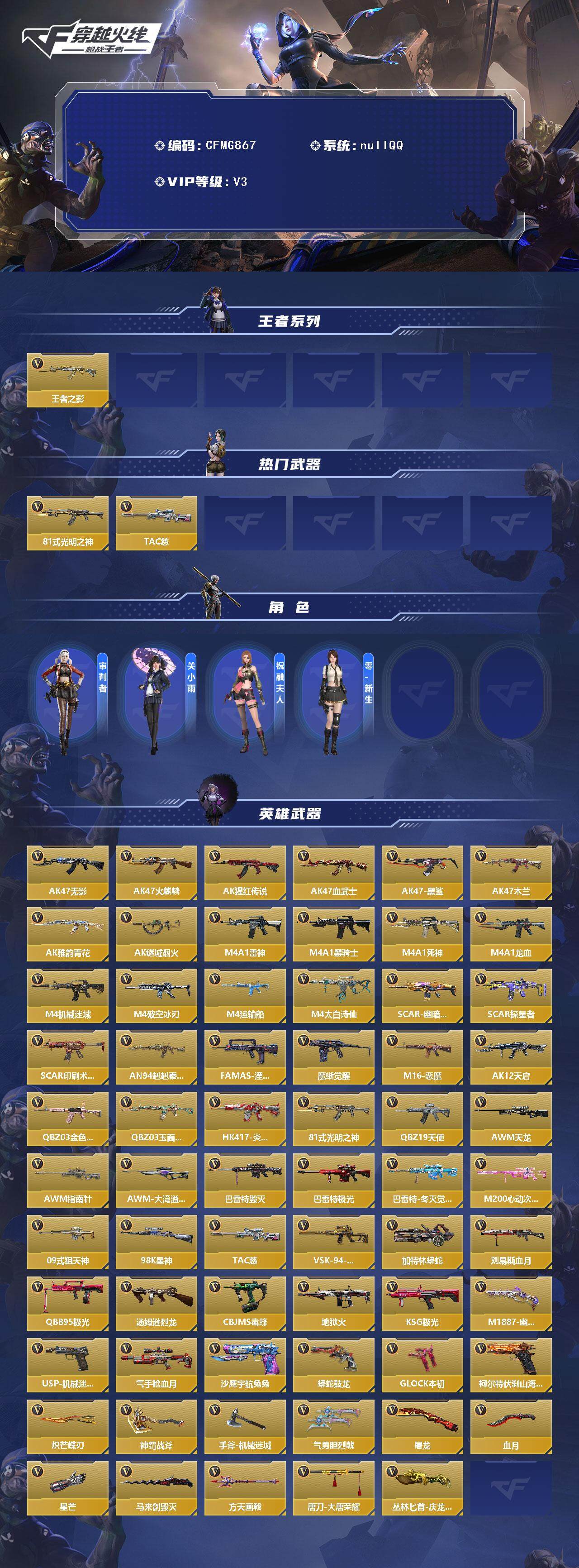 【CFMG867】VIP3/135V/1王者/王者之影/81式-光明之神/TAC-慈/审判者/关小雨/祝融夫人/零-新生/AK47-无影/AK47-火麒麟/AK47-猩红传说/AK47-血武士/AK47-黑鲨/AK47-木兰/AK47-雅韵青花/AK47-谜城烟火/M4A1-雷神/M4A1-黑骑士/M4A1-死神/M4A1-龙血/M4A1-机械迷城/M4A1-破空冰刃/M4A1-运输船/M4A1-太白诗仙/SCAR-幽暗骑士觉醒/SCAR-探星者/SCAR-印刷术觉醒/AN94-赳赳秦师/FAMAS-湮灭/9A91-魔蜥觉醒/M16-恶魔/AK12-天启/QBZ03-金色蔷薇/QBZ03-玉面羞花/HK417-炎龙铠甲/QBZ19-天使/AWM-天龙/AWM-指南针/AWM-大湾溢彩/巴雷特-毁灭/巴雷特-极光/巴雷特-冬灭觉醒/M200-心动次元/09式狙-天神/98K-星神/TAC慈/VSK-94-金蚀/加特林-蟒蛇/刘易斯-血月/QBB95-极光/汤姆逊-烈龙/CBJ-MS-毒蜂/地狱火/KSG-极光/M1887-幽冥玄喵觉醒/USP-机械迷城/气手枪-血月/沙鹰-宇航兔兔/蟒蛇-鼓龙/双持GLOCK18-本初/柯尔特-伏刹山海觉醒/炽芒蝶刃/神罚战斧/手斧-机械迷城/气勇胆烈戟/屠龙/血月/星芒/马来剑-毁灭/方天画戟/唐刀-大唐荣耀/丛林匕首-庆龙觉醒【操作系统: 安卓QQ】