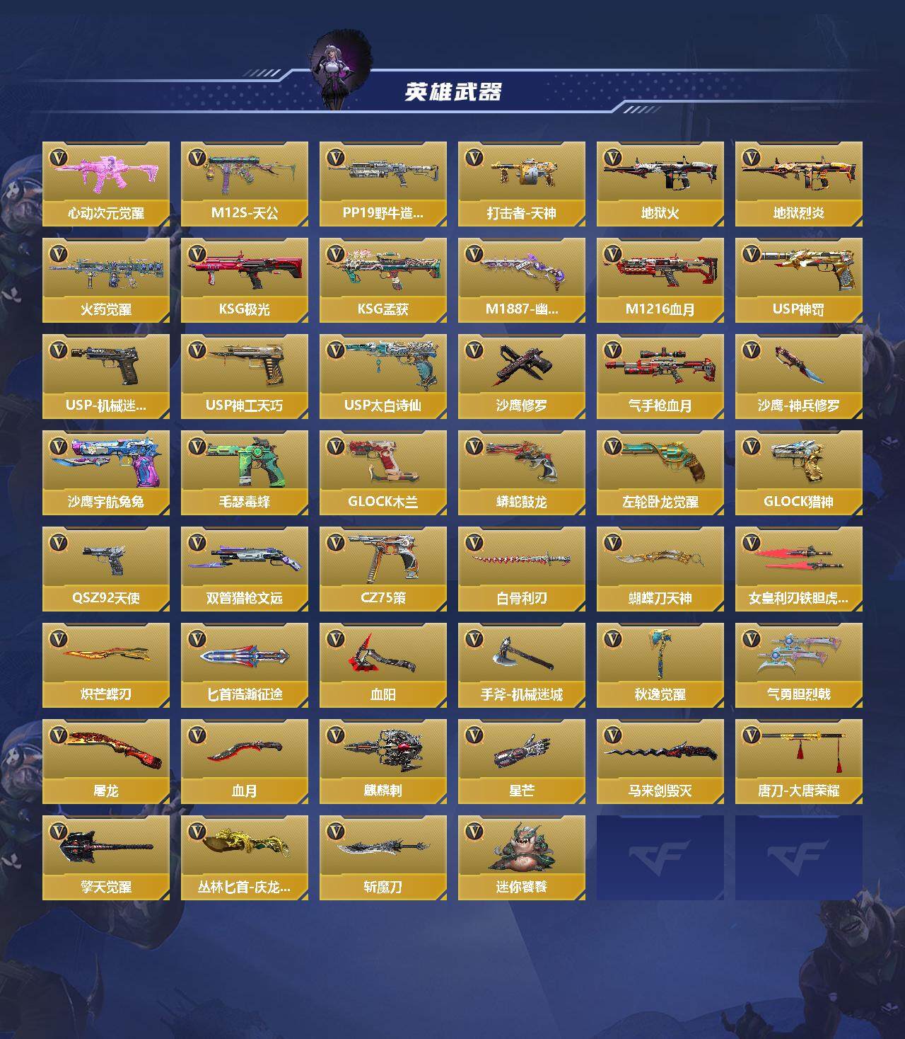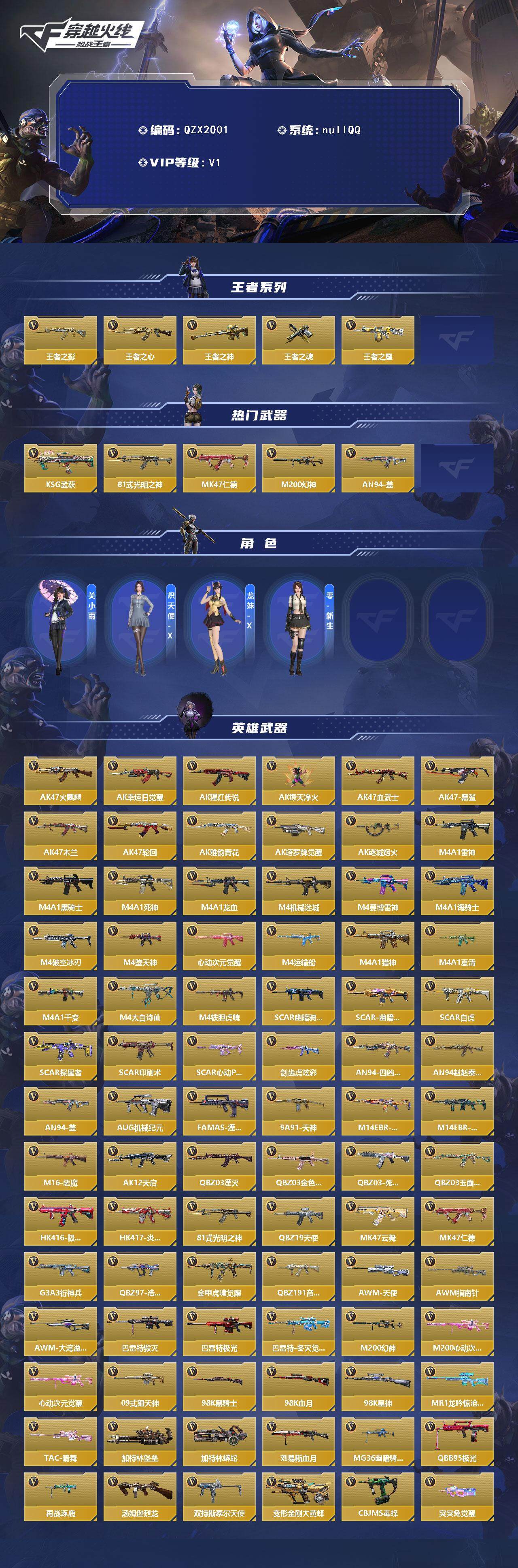 【QZX2001】VIP1/272V/王者之影/王者之心/王者之神/王者之魂/王者之霆/KSG-孟获/81式-光明之神/MK47-仁德/M200-幻神/AN94-盖/关小雨/炽天使-X/龙妹-X/零-新生/AK47-火麒麟/AK47-幸运日觉醒/AK47-猩红传说/AK47-燎天净火/AK47-血武士/AK47-黑鲨/AK47-木兰/AK47-轮回/AK47-雅韵青花/AK47-塔罗牌觉醒/AK47-谜城烟火/M4A1-雷神/M4A1-黑骑士/M4A1-死神/M4A1-龙血/M4A1-机械迷城/M4A1-赛博雷神/M4A1-海骑士/M4A1-破空冰刃/M4A1-堕天神/M4A1-心动次元觉醒/M4A1-运输船/M4A1-猎神/M4A1-夏清/M4A1-千变/M4A1-太白诗仙/M4A1-铁胆虎魄/SCAR-幽暗骑士/SCAR-幽暗骑士觉醒/SCAR Light-白虎/SCAR-探星者/SCAR-印刷术/SCAR-心动PICK/剑齿虎-炫彩/AN94-四凶觉醒/AN94-赳赳秦师/AUG-机械纪元/FAMAS-湮灭/9A91-天神/M14EBR-拂影/M14EBR-玄武/M16-恶魔/AK12-天启/QBZ03-湮灭/QBZ03-金色蔷薇/QBZ03-死神/QBZ03-玉面羞花/HK416-极光/HK417-炎龙铠甲/QBZ19-天使/MK47-云舞/仁德/G3A3-衍神兵/QBZ97-浩瀚征途/QBZ191-金甲虎啸觉醒/QBZ191-帝皇铠甲/AWM-天使/AWM-指南针/AWM-大湾溢彩/巴雷特-毁灭/巴雷特-极光/巴雷特-冬灭觉醒/幻神/M200-心动次元/M200-心动次元觉醒/09式狙-天神/98K-黑骑士/98K-血月/98K-星神/MR1-龙吟惊沧海/TAC-晴舞/加特林-堡垒/加特林-蟒蛇/刘易斯-血月/MG36-幽暗骑士/QBB95-极光/QBB95-再战涿鹿/汤姆逊-烈龙/双持斯泰尔-天使/QCW05-变形金刚·大黄蜂/CBJ-MS-毒蜂/P90-突突兔觉醒/CZS2-心动次元觉醒/M12S-天公/PP19野牛-造纸术/打击者-天神/地狱火/地狱烈炎/AA12-火药觉醒/KSG-极光/M1887-幽冥玄喵觉醒/M1216-血月/USP-神罚/USP-机械迷城/USP-神工天巧/USP-太白诗仙/沙鹰-修罗/气手枪-血月/沙鹰-神兵修罗/沙鹰-宇航兔兔/毛瑟-毒蜂/改装GLOCK-木兰/蟒蛇-鼓龙/左轮-卧龙觉醒/GLOCK18-猎神/QSZ92-天使/双管猎枪-文远/CZ75-策/白骨利刃/蝴蝶刀-天神/女皇利刃-铁胆虎魄/炽芒蝶刃/匕首-浩瀚征途/血阳/手斧-机械迷城/秋逸觉醒/气勇胆烈戟/屠龙/血月/太白诗仙扇/麒麟刺/星芒/马来剑-毁灭/唐刀-大唐荣耀/擎天觉醒/丛林匕首-庆龙觉醒/斩魔刀/迷你饕餮【操作系统: 安卓QQ】