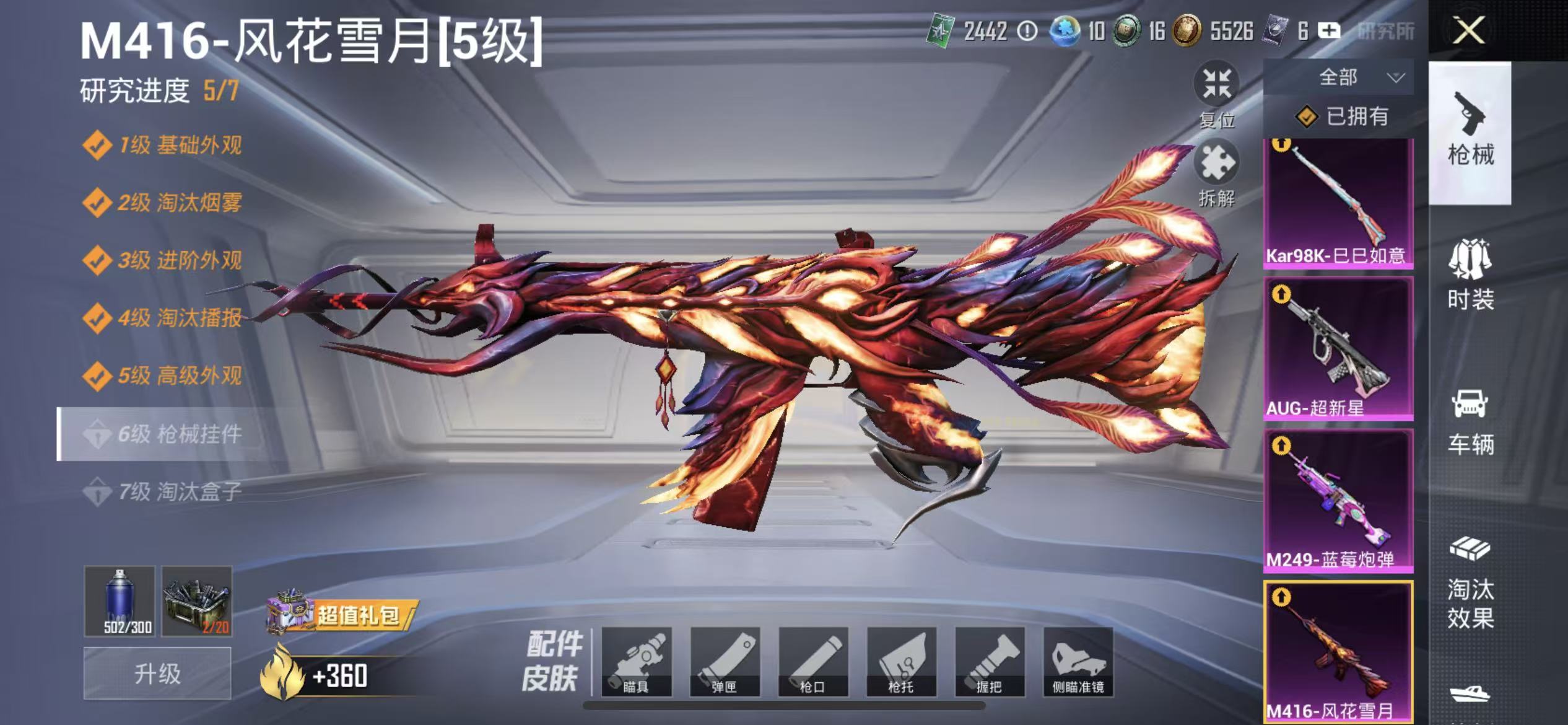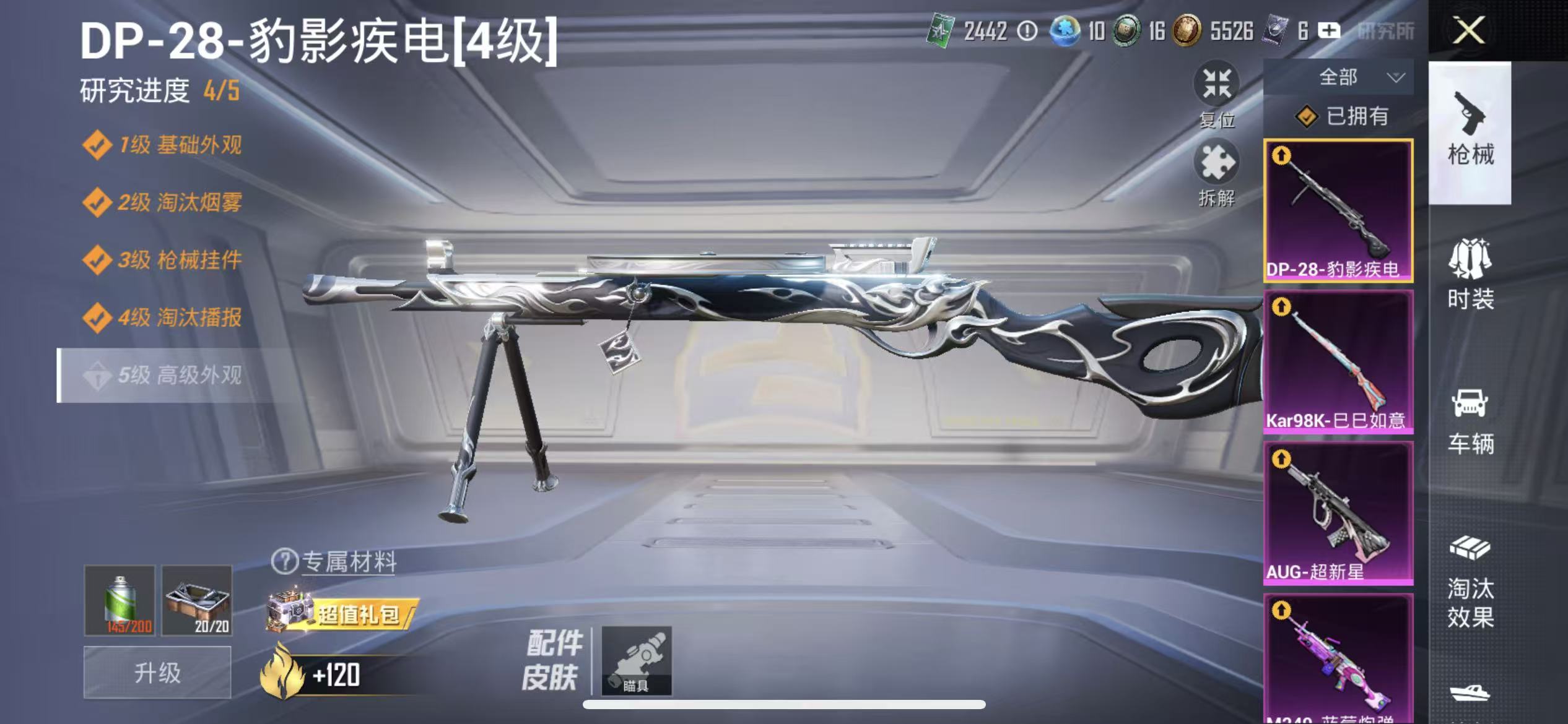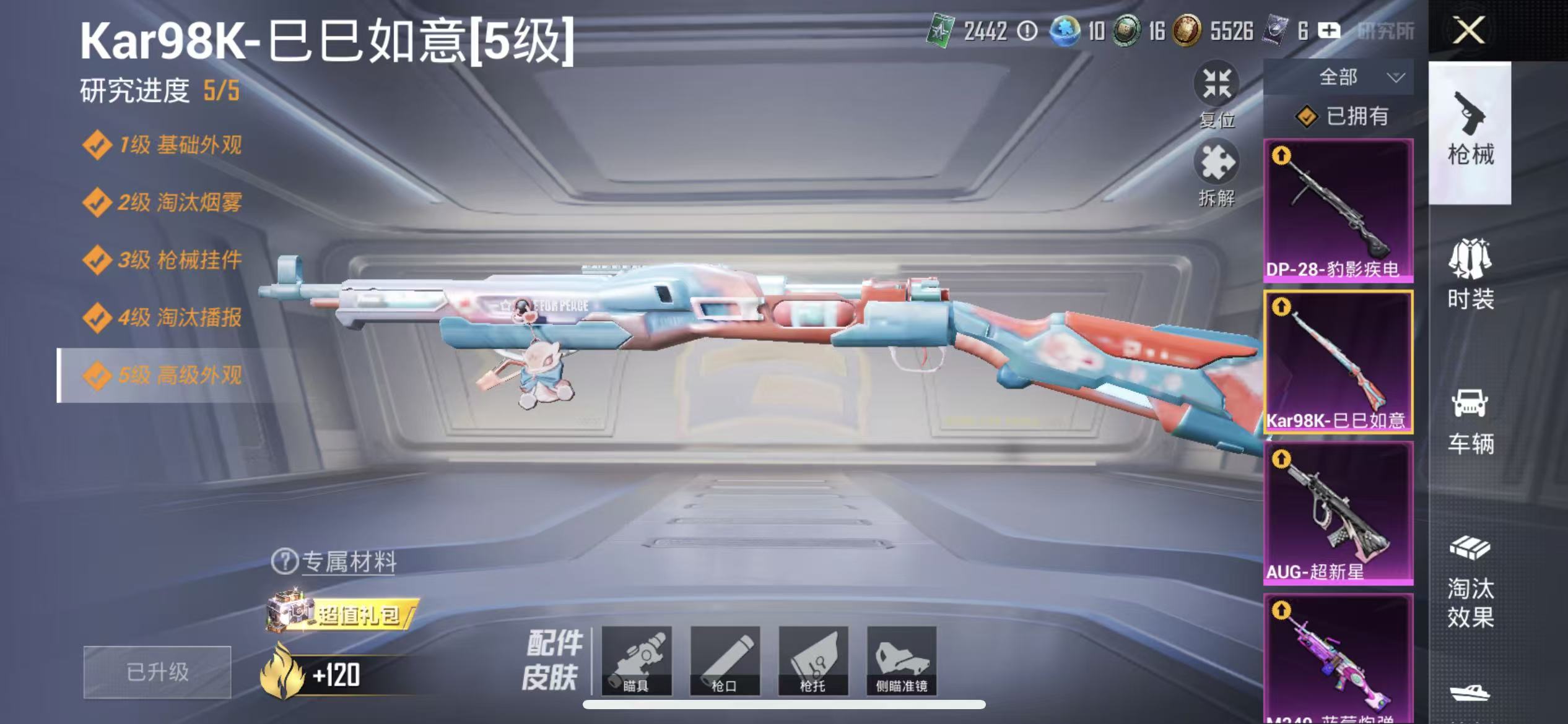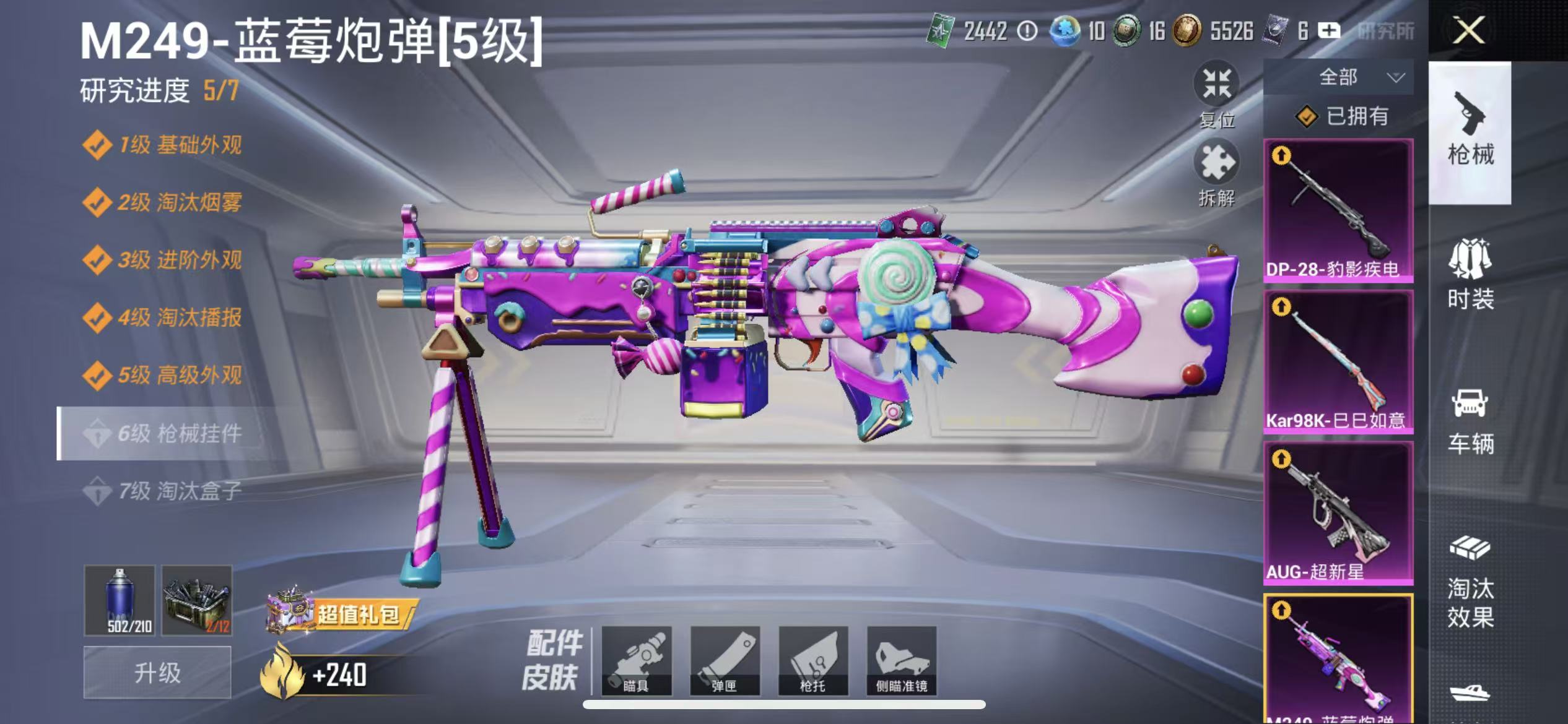 【5特效枪】 Kar98K-巳巳如意 (5级) DP-28-豹影疾电 (4级) AUG-超新星 (7级) M416-风花雪月 (5级) M249-蓝莓炮弹 (5级)
