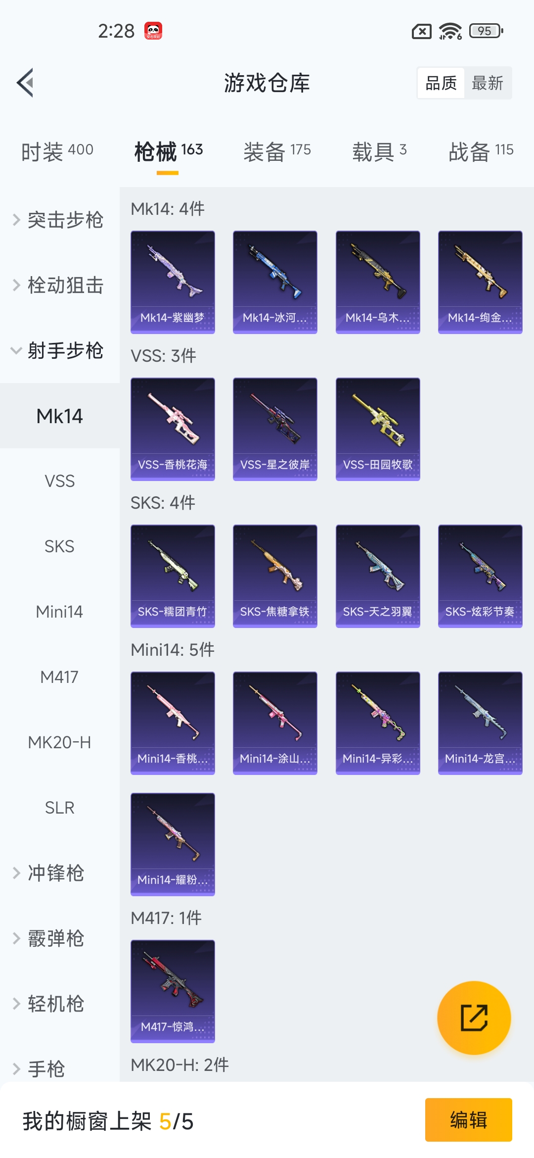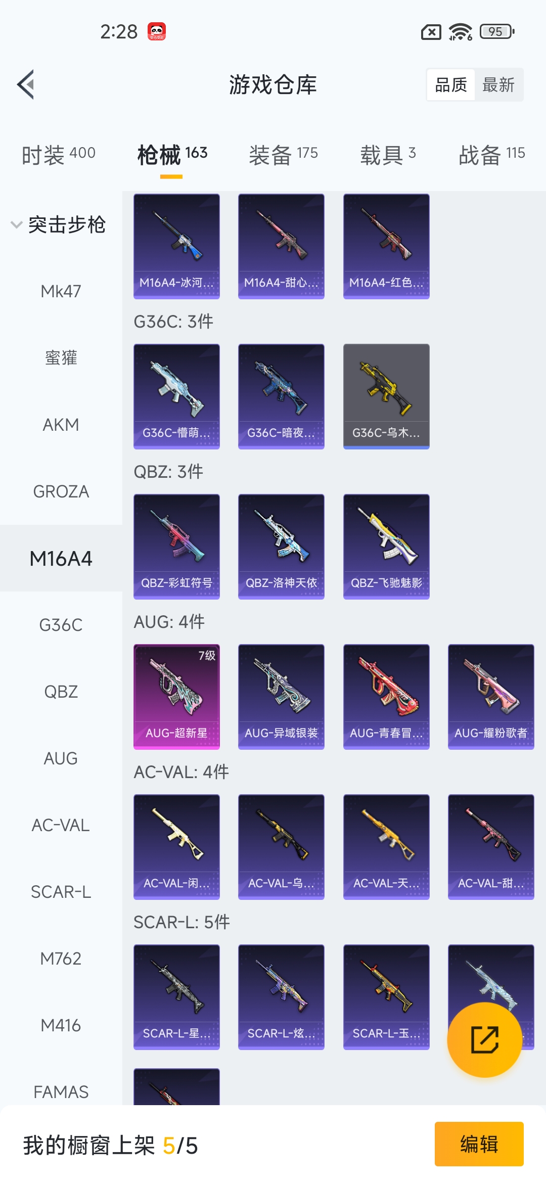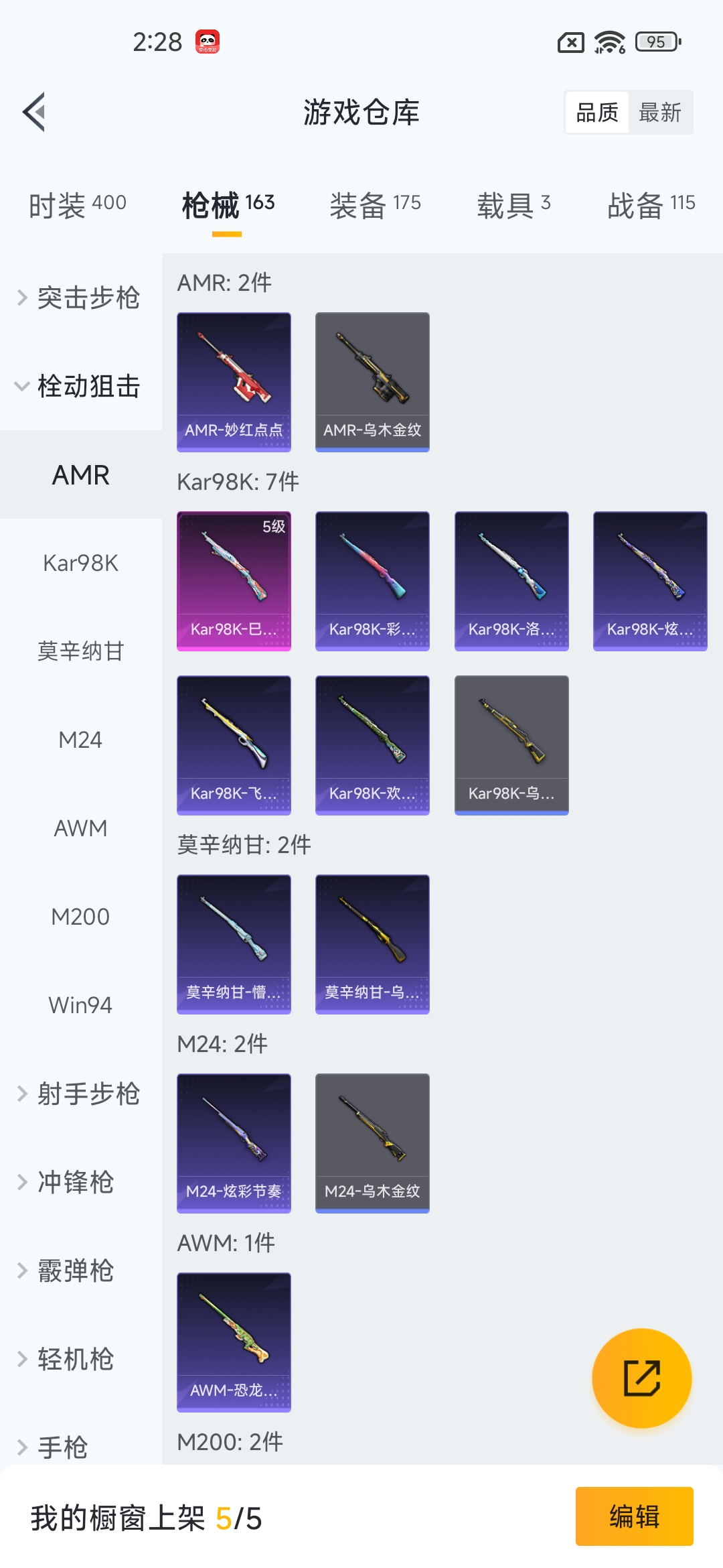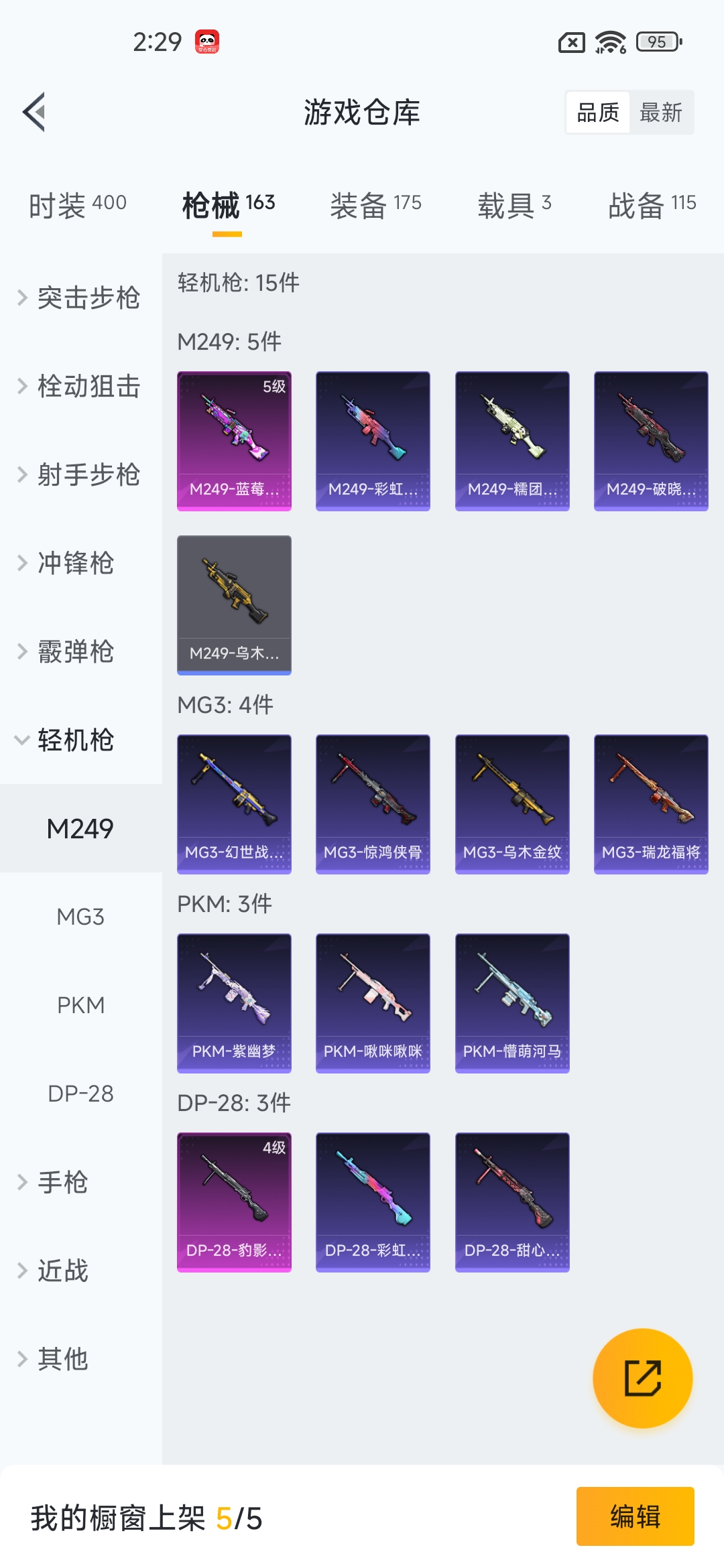 【5特效枪】 Kar98K-巳巳如意 (5级) DP-28-豹影疾电 (4级) AUG-超新星 (7级) M416-风花雪月 (5级) M249-蓝莓炮弹 (5级)