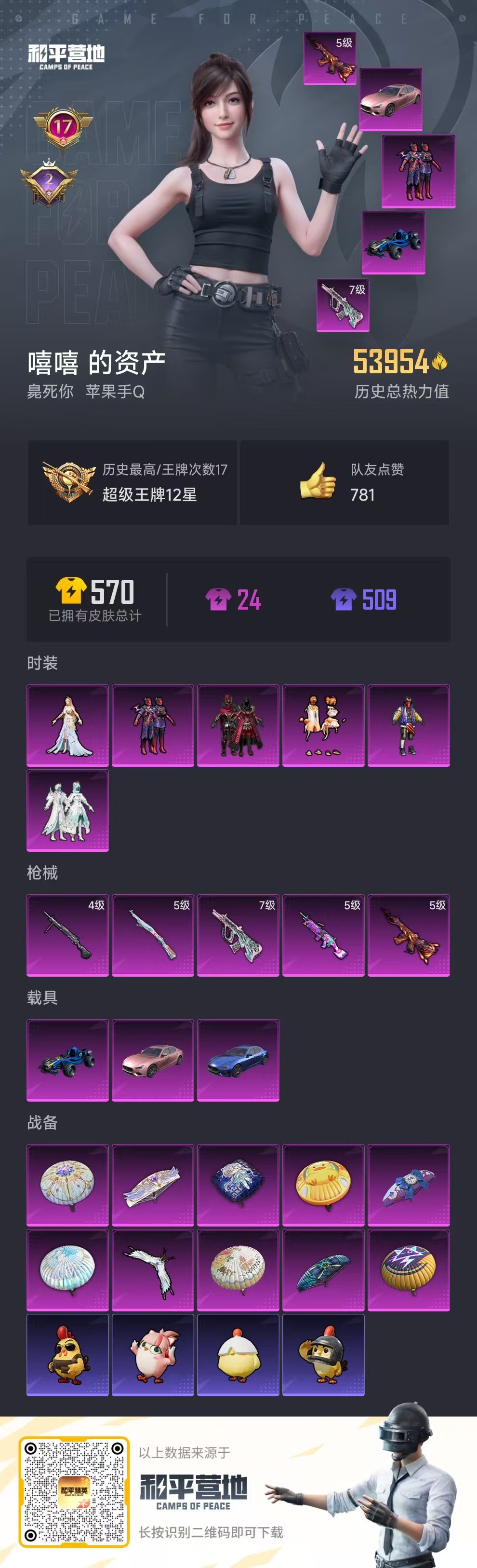 PX_2200952-(可二次实名) 苹果Q-3载具6粉装5特效枪8热门114套装163枪皮 53954热力值 17印记 历史超级王牌12星