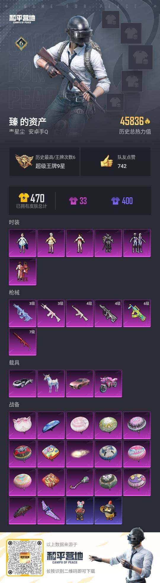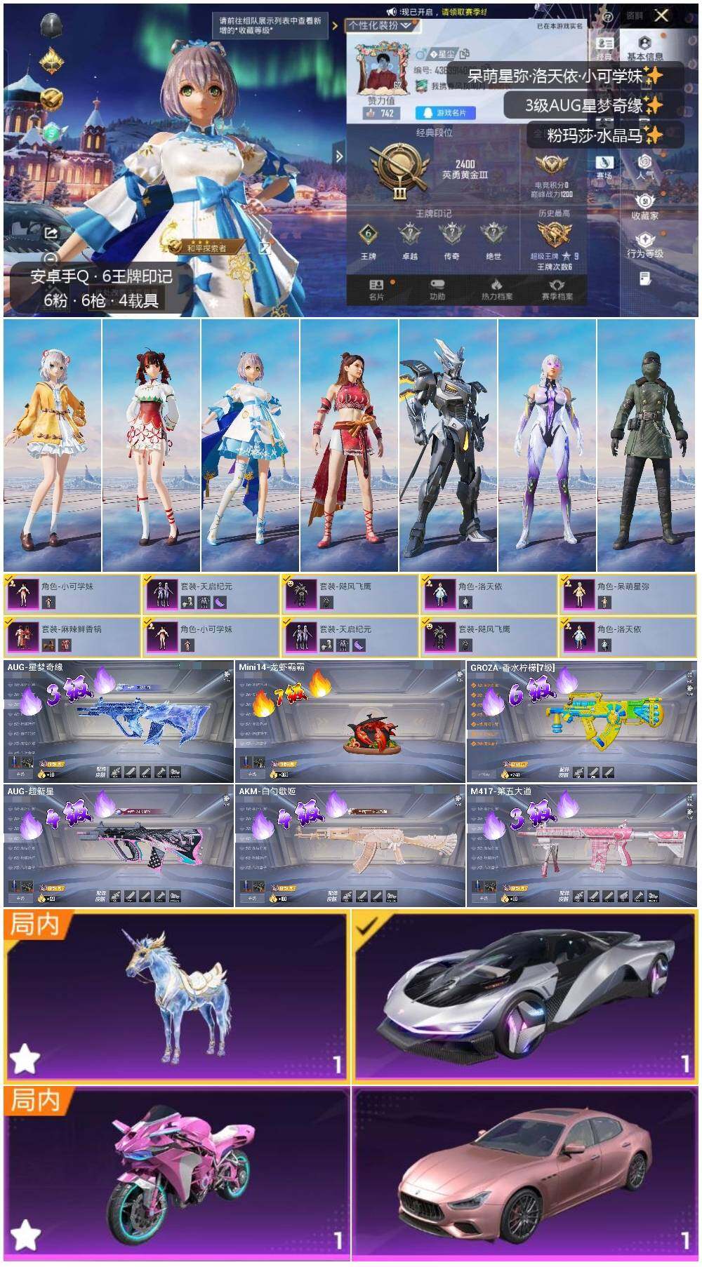 [14128480]可二次【店主推荐捡漏号!可直接换绑】 安卓 手Q-6粉装-6特效枪-4载具-3粉色飞行器-4.5w热力值-6王牌印记-94套装-129枪皮【粉色载具】:玛莎拉蒂Ghibli(粉),时空跃影(星辉银),双人摩托-梦幻火箭,星梦玉骢【粉色套装】:粉装-天启纪元,粉装-麻辣鲜香锅,粉装-飓风飞鹰,角色-洛天依,角色-呆萌星弥,角色-小可学妹【粉色枪皮等级】:AKM-白勺歌姬(四级),GROZA-香水柠檬(六级),AUG-超新星(四级),AUG-星梦奇缘(三级),Mini14-龙虾霸霸(七级),M417-第五大道(三级)【粉色飞行器】:精灵迷巫飞行器,梦幻火箭飞行器,齐天大圣飞行器【实名情况: 可二次实名】