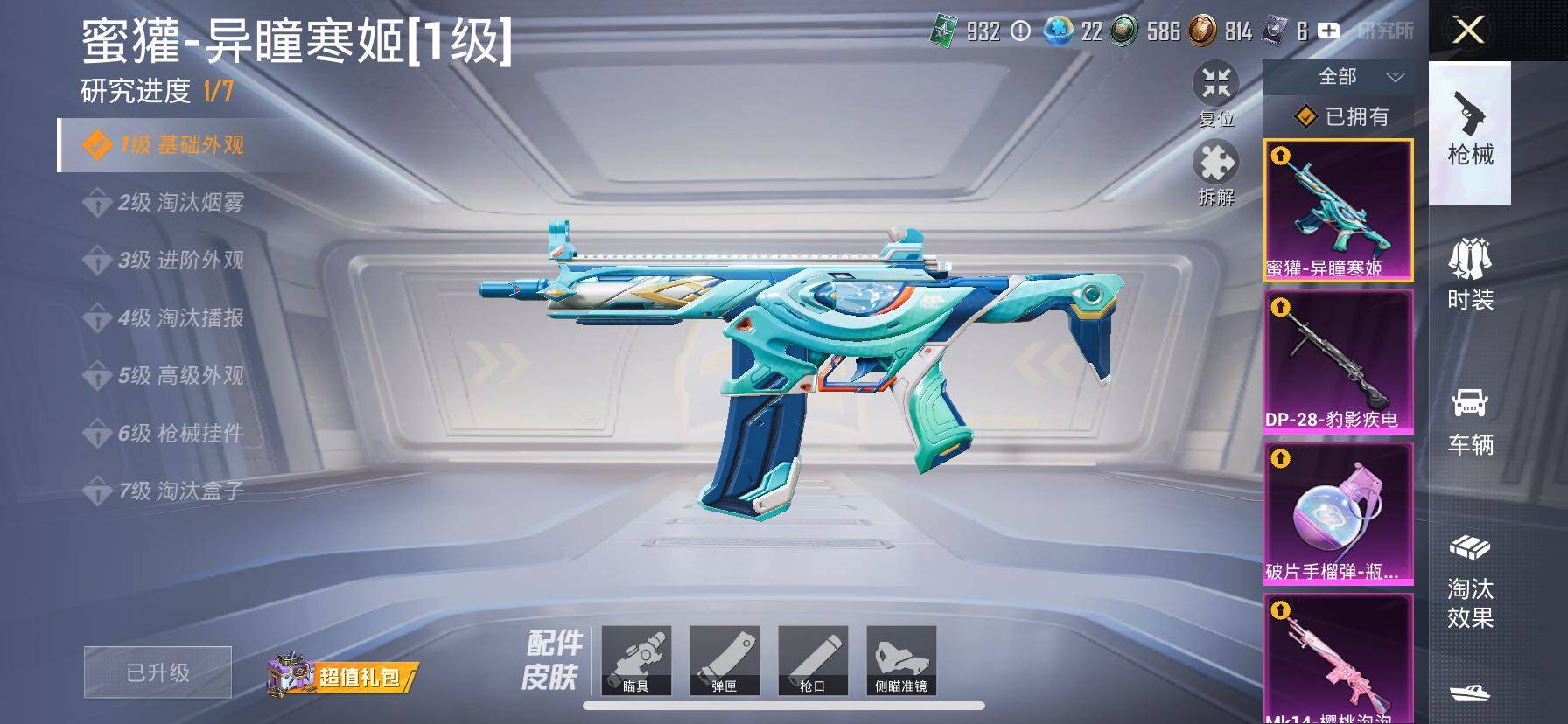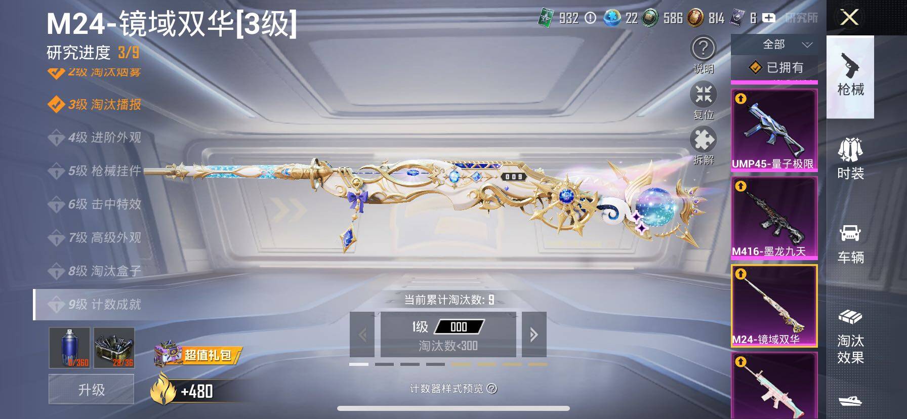 【13特效枪】 SCAR-L-锦绣绵绵 (5级) M416-墨龙九天 (3级) Kar98K-巳巳如意 (5级) DP-28-豹影疾电 (5级) AUG-暖羊咩咩 (5级) 蜜獾-异瞳寒姬 (1级) UMP45-量子极限 (5级) Mk14-樱桃泡泡 (5级) M24-镜域双华 (3级) GROZA-镜光银凌 (5级) AKM-梦之光华 (5级) M416-风花雪月 (7级) 破片手榴弹-瓶中星球 (5级)