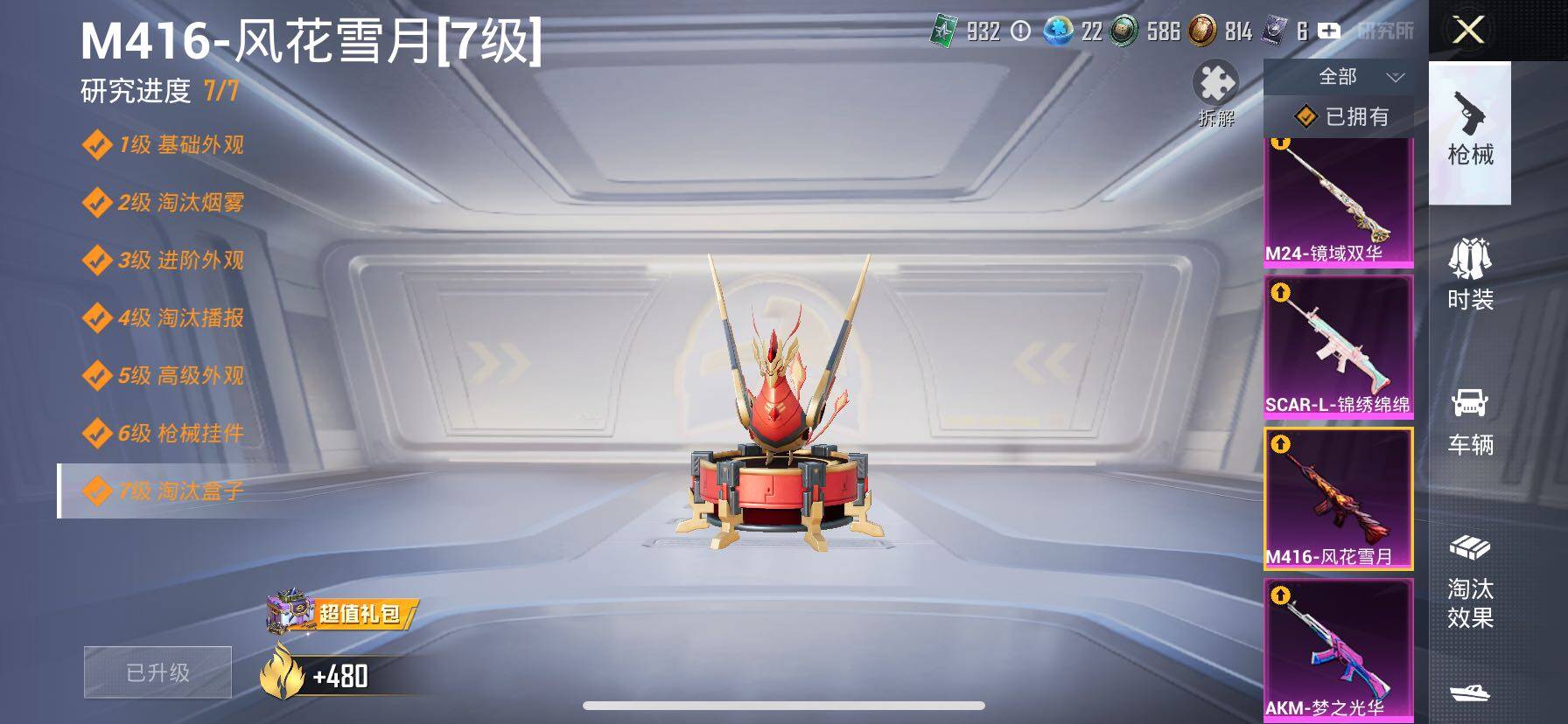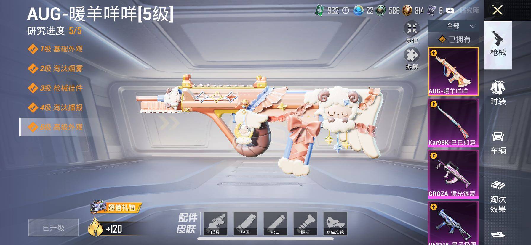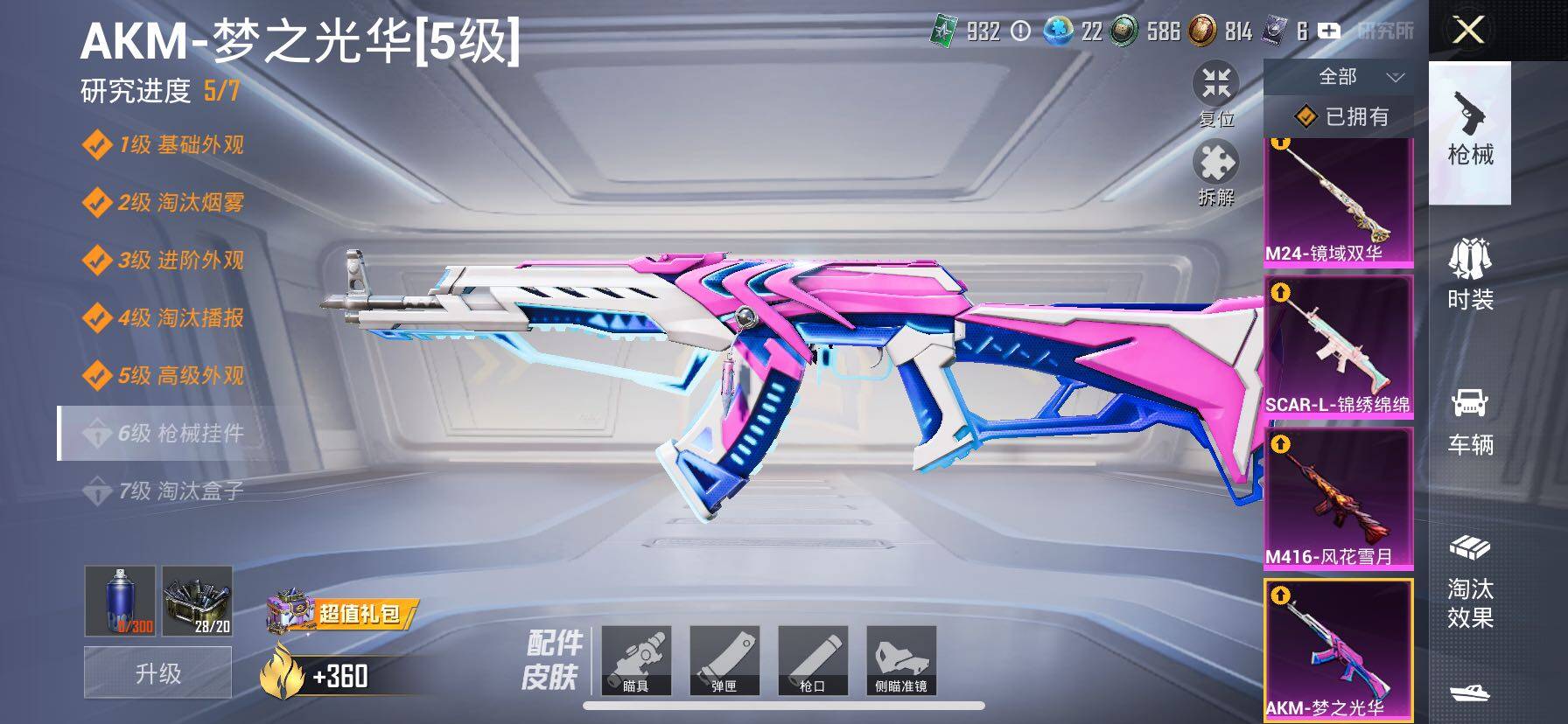 【优质枪皮肤】 AKM-梦之光华 M416-风花雪月 破片手榴弹-瓶中星球 Mk14-樱桃泡泡 AUG-暖羊咩咩 Kar98K-巳巳如意 GROZA-镜光银凌 UMP45-量子极限 M416-墨龙九天 M24-镜域双华 SCAR-L-锦绣绵绵