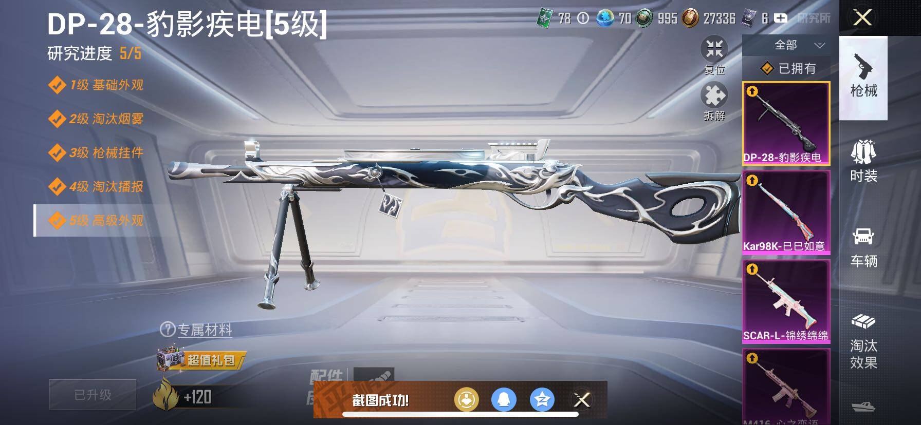 【4特效枪】 SCAR-L-锦绣绵绵 (5级) M416-心之恋语 (7级) Kar98K-巳巳如意 (5级) DP-28-豹影疾电 (5级)