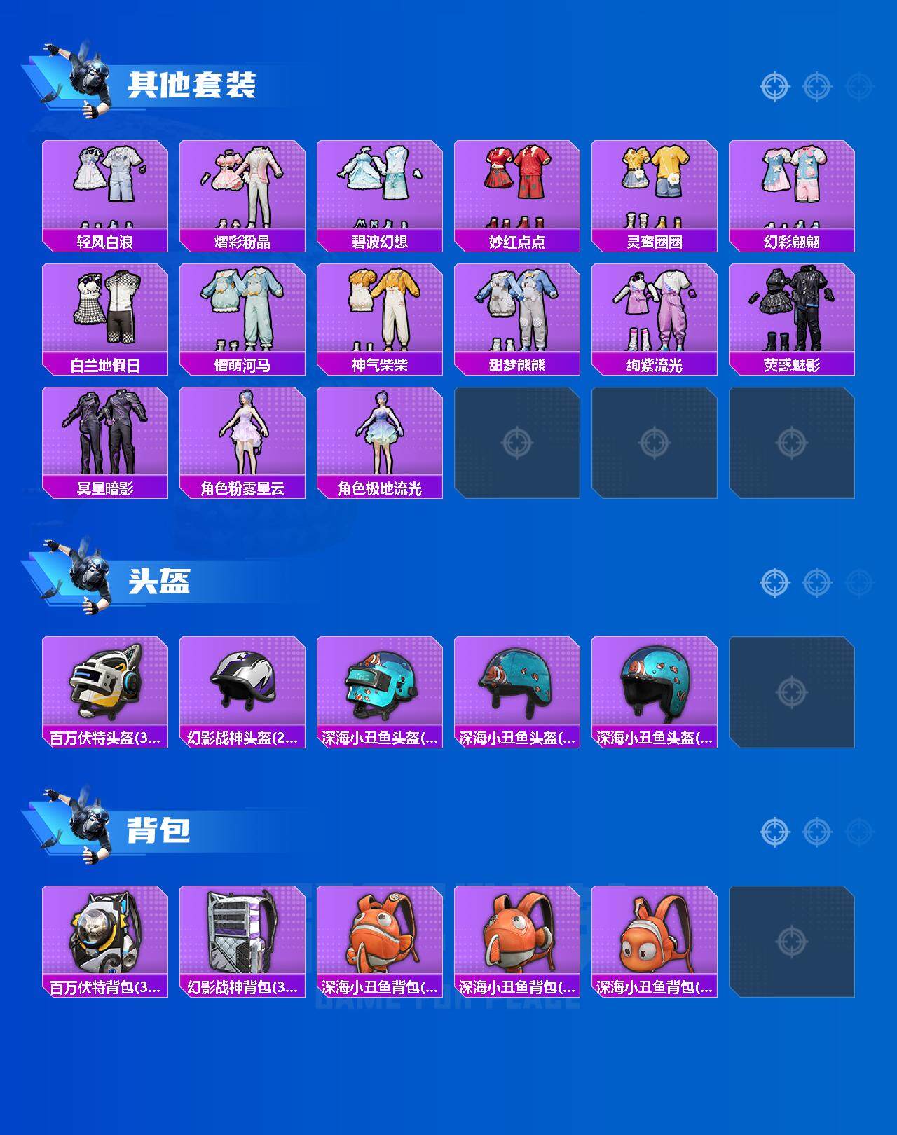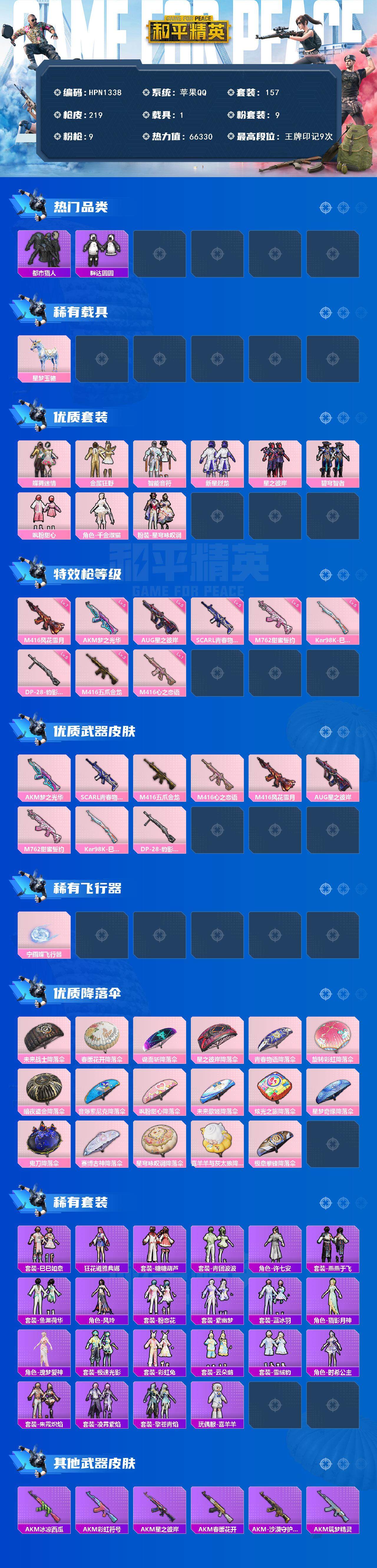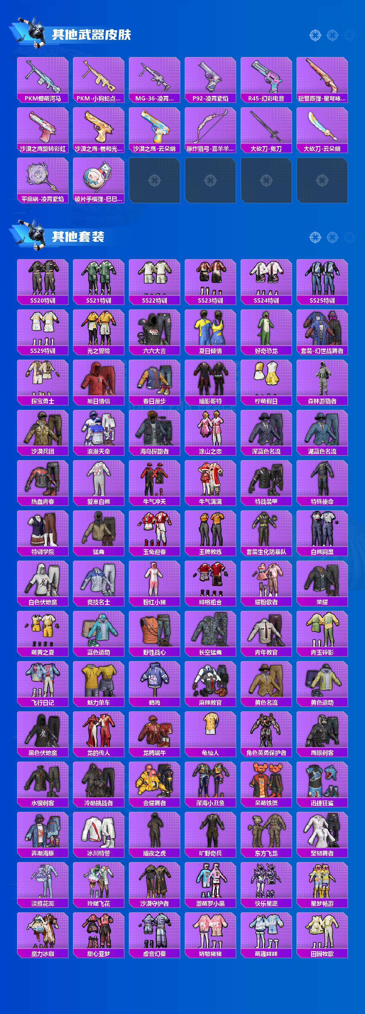 【HPN1338】157套装/枪械9/装备267/载具1/战备139/王牌印记9/热力值66330/五级AKM-梦之光华/五级SCAR-L-青春物语/三级M416-五爪金龙/一级M416-心之恋语/七级M416-风花雪月/五级AUG-星之彼岸/五级M762-甜蜜誓约/五级Kar98K-巳巳如意/五级DP-28-豹影疾电/套装-浪漫天命/套装-都市猎人/深海小丑鱼/胖达圆圆/沙漠守护者/套装-暗夜之虎/套装-龟仙人/套装-暗影哥特/套装-粉红小猪/星梦玉骢/蝶舞迷情/金属狂野/智能音符/新星烈龙/星之彼岸/碧穹智者/飒粉甜心/千金淑猫/星穹咏叹调/AKM-梦之光华/SCAR-L-青春物语/M416-五爪金龙/M416-心之恋语/M416-风花雪月/AUG-星之彼岸/M762-甜蜜誓约/Kar98K-巳巳如意/DP-28-豹影疾电/宁雨蝶飞行器/未来战士降落伞/春暖花开降落伞/诡面斩降落伞/星之彼岸降落伞/青春物语降落伞/旋转彩虹降落伞/暗夜鎏金降落伞/音爆索尼克降落伞/飒粉甜心降落伞/未来歌姬降落伞/炫光之旅降落伞/星梦奇缘降落伞/鬼刀降落伞/赛博古神降落伞/星穹咏叹调降落伞/喜羊羊与灰太狼降落伞/极意拳锋降落伞/套装-巳巳如意/角色-狂花道·雅典娜/套装-糖糖葫芦/套装-青团波波/角色-许七安/套装-燕燕于飞/套装-鱼渊荷华/角色-风玲/套装-粉恋花/套装-紫幽梦/套装-蓝冰羽/角色-猎影月神/角色-瑰梦爱神/套装-极速光影/套装-彩虹兔/套装-云朵鹅/套装-雪绒豹/角色-时希公主/套装-朱霞炽焰/套装-凌霄紫焰/套装-擎苍青焰/玩偶服-喜羊羊/套装-炫彩糖果/AUG-冰晶雪宝/AKM-冰凉西瓜/AKM-彩虹符号/AKM-星之彼岸/AKM-春暖花开/AKM-沙漠守护者/AKM-筑梦精灵/AKM-龙的传人/M16A4-幻世战舞者/M16A4-甜心亚梦/SCAR-L-未来战士/SCAR-L-炫彩节奏/SCAR-L-玉兔迎春/SCAR-L-小狗蛇点点/M416-糯团青竹/M416-红色方程式/GROZA-彩虹符号/GROZA-懵萌河马/GROZA-春暖花开/GROZA-田园牧歌/AUG-天降萌叽/AUG-诡面斩/QBZ-彩虹符号/M762-天降萌叽/M762-彩虹符号/M762-云朵鹅/Mk47-妙红点点/Mk47-百万伏特/G36C-懵萌河马/G36C-星穹咏叹调/AC-VAL-天降萌叽/AC-VAL-甜心亚梦/蜜獾-天降萌叽/蜜獾-娇憨猪猪/ARX-凌霄紫焰/UZI-天降萌叽/UZI-娇憨猪猪/UZI-红色方程式/UMP45-春暖花开/UMP45-涂山之恋/UMP45-生命誓言/Vector-彩虹符号/Vector-生命誓言/Vector-田园牧歌/Vector-音爆索尼克/汤姆逊-天降萌叽/汤姆逊-炫彩节奏/汤姆逊-环太平洋/汤姆逊-耀粉歌者/汤姆逊-诡面斩/汤姆逊-智耀战神/MP5K-飒粉甜心/AKS-74U-鬼刀/JS9-凌霄紫焰/P90-巳巳如意/Kar98K-王子的夏天/M24-未来战士/M24-炫彩节奏/M24-幻彩电音/AWM-音爆索尼克/SKS-心之恋语/SKS-未来歌姬/SKS-炫彩节奏/SKS-迅猛狂鲨/VSS-彩虹符号/VSS-星之彼岸/VSS-未来战士/VSS-田园牧歌/Mini14-旋转彩虹/Mini14-春暖花开/Mini14-涂山之恋/Mini14-穿刺龙虾/SLR-娇憨猪猪/SLR-彩虹符号/SLR-沙漠守护者/QBU-飒粉甜心/莫辛纳甘-懵萌河马/AMR-妙红点点/M200-六号稻草人/SVD-云朵鹅/S686-奇异狩猎者/S686-未来战士/S686-生命誓言/S686-巳巳如意/S686-千金淑猫/S1897-小鹦鹉BEBE/S1897-春暖花开/S1897-炫彩节奏/S1897-百万伏特/S12K-玩趣呆呆/S12K-娇憨猪猪/S12K-幻世战舞者/DBS-彩虹符号/DBS-甜心亚梦/DBS-第五大道/SPAS-12-田园牧歌/SPAS-12-云朵鹅/M249-妙红点点/M249-彩虹符号/M249-星之彼岸/M249-诡夜天鹅/DP-28-彩虹符号/DP-28-未来战士/DP-28-沙漠守护者/DP-28-甜心亚梦/MG3-妙红点点/MG3-幻世战舞者/MG3-甜心娃娃/MG3-第五大道/PKM-懵萌河马/PKM-小狗蛇点点/MG-36-凌霄紫焰/P92-凌霄紫焰/R45-幻彩电音/短管霰弹-星穹咏叹调/沙漠之鹰-旋转彩虹/沙漠之鹰-云朵鹅/沙漠之鹰-羲和光序/爆炸猎弓-喜羊羊与灰太狼/大砍刀-云朵鹅/大砍刀-鬼刀/平底锅-凌霄紫焰/破片手榴弹-巳巳如意/套装-SS20特训/套装-SS21特训/套装-SS22特训/套装-SS23特训/套装-SS24特训/套装-SS25特训/套装-SS29特训/套装-光之冒险/套装-六六大吉/套装-夏日倾情/套装-好奇恐龙/套装-幻世战舞者/套装-探宝勇士/套装-旭日情侣/套装-春日漫步/套装-柠萌假日/套装-森林游猎者/套装-沙漠兵团/套装-海岛探路者/套装-涂山之恋/套装-深蓝色名流/套装-湖蓝色名流/套装-热血青春/套装-爱崽白熊/套装-牛气冲天/套装-牛气满满/套装-特战装甲/套装-特殊使命/套装-特训学院/套装-猛禽/套装-玉兔迎春/套装-王牌教练/套装-生化防暴队/套装-白熊同盟/套装-白色伏地魔/套装-竞技名士/套装-绯格组合/套装-耀粉歌者/套装-荣耀/套装-萌黄之夏/套装-蓝色运动/套装-野性战心/套装-长空猛禽/套装-青年教官/套装-青玉碎影/套装-飞行日记/套装-魅力单车/套装-鹤鸣/套装-麻辣教官/套装-黄色名流/套装-黄色运动/套装-黑色伏地魔/套装-龙的传人/套装-龙腾端午/角色-英勇保护者/套装-鹰眼刺客/套装-水银刺客/套装-冷酷挑战者/套装-金耀舞者/套装-呆萌铁蟹/套装-迅捷狂鲨/套装-弄潮海豚/套装-冰川特警/套装-旷野奇兵/套装-东方飞龙/套装-坚韧舞者/套装-淡雅花蕊/套装-玲珑飞花/套装-激萌罗小黑/套装-快乐星愿/套装-星梦畅游/套装-魔力冰咖/套装-甜心亚梦/套装-虚音幻奏/套装-娇憨猪猪/套装-萌趣咩咩/套装-田园牧歌/套装-轻风白浪/套装-熠彩粉晶/套装-碧波幻想/套装-妙红点点/套装-灵蜜圈圈/套装-幻彩翩翩/套装-白兰地假日/套装-懵萌河马/套装-神气柴柴/套装-甜梦熊熊/套装-绚紫流光/套装-荧惑魅影/套装-冥星暗影/角色-粉雾星云/角色-极地流光/百万伏特头盔(3级)/幻影战神头盔(2级)/深海小丑鱼头盔(3级)/深海小丑鱼头盔(2级)/深海小丑鱼头盔(1级)/百万伏特背包(3级)/幻影战神背包(3级)/深