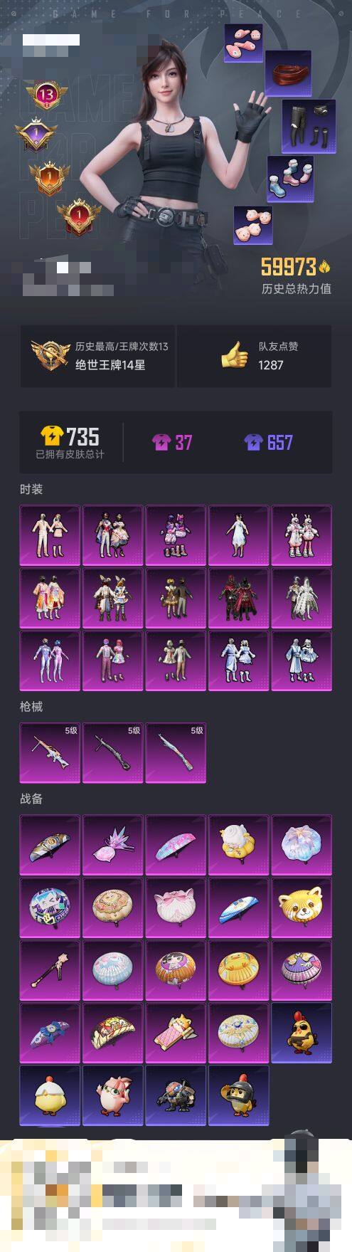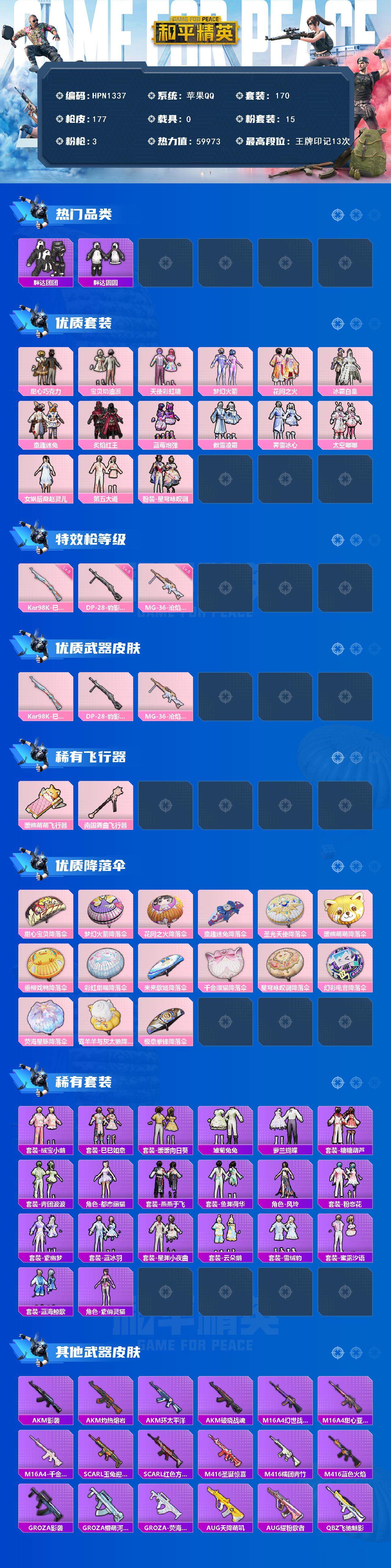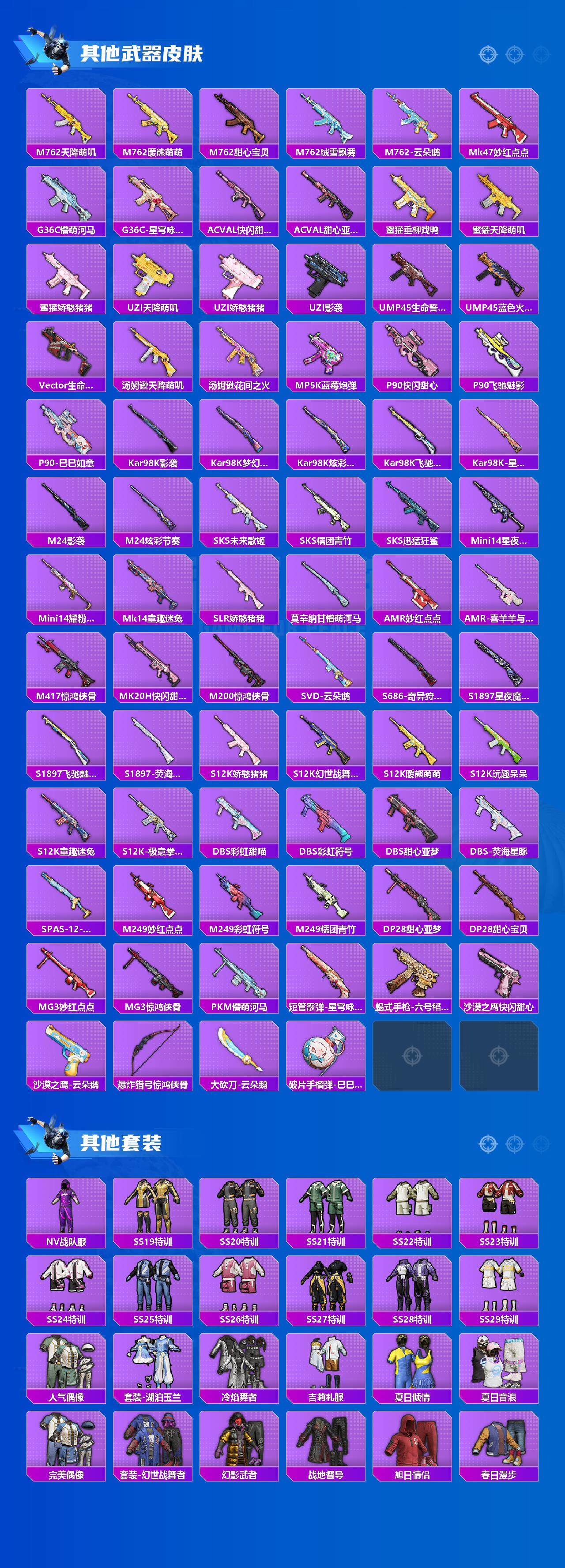 【HPN1337】170套装/枪械3/装备233/战备155/王牌印记13/热力值59973/五级Kar98K-巳巳如意/五级DP-28-豹影疾电/五级MG-36-沧焰双生/粉装-梦幻火箭/粉装-童趣迷兔/套装-胖达团团/胖达圆圆/套装-龟仙人/套装-暗影哥特/套装-粉红小猪/套装-糯粉咩咩/甜心巧克力/宝贝奶油派/天使彩虹糖/梦幻火箭/花间之火/冰霜白皇/童趣迷免/炙焰红王/粉装-蓝莓炮弹/傲雪凌霜/霁雪冰心/粉装-太空嘟嘟/女娲后裔-赵灵儿/第五大道/星穹咏叹调/Kar98K-巳巳如意/DP-28-豹影疾电/MG-36-沧焰双生/暖熊萌萌飞行器/南国舞曲飞行器/甜心宝贝降落伞/梦幻火箭降落伞/花间之火降落伞/童趣迷兔降落伞/圣光天使降落伞/暖熊萌萌降落伞/垂柳戏鸭降落伞/彩虹甜喵降落伞/未来歌姬降落伞/千金淑猫降落伞/星穹咏叹调降落伞/幻彩电音降落伞/荧海星豚降落伞/喜羊羊与灰太狼降落伞/极意拳锋降落伞/套装-绒宝小鹅/套装-巳巳如意/套装-暖暖向日葵/套装-雏菊兔兔/套装-萝兰蝴蝶/套装-糖糖葫芦/套装-青团波波/角色-都市丽猫/套装-燕燕于飞/套装-鱼渊荷华/角色-风玲/套装-粉恋花/套装-紫幽梦/套装-蓝冰羽/套装-星渊小夜曲/套装-云朵鹅/套装-雪绒豹/套装-蜜露汐语/套装-蓝海鲸歌/角色-紫俏灵猫/套装-炫彩糖果/AUG-冰晶雪宝/AKM-影袭/AKM-灼热熔岩/AKM-环太平洋/AKM-破晓战魂/M16A4-幻世战舞者/M16A4-甜心亚梦/M16A4-千金淑猫/SCAR-L-玉兔迎春/SCAR-L-红色方程式/M416-圣诞惊喜/M416-糯团青竹/M416-蓝色火焰/GROZA-影袭/GROZA-懵萌河马/GROZA-荧海星豚/AUG-天降萌叽/AUG-耀粉歌者/QBZ-飞驰魅影/M762-天降萌叽/M762-暖熊萌萌/M762-甜心宝贝/M762-绒雪飘舞/M762-云朵鹅/Mk47-妙红点点/G36C-懵萌河马/G36C-星穹咏叹调/AC-VAL-快闪甜心/AC-VAL-甜心亚梦/蜜獾-垂柳戏鸭/蜜獾-天降萌叽/蜜獾-娇憨猪猪/UZI-天降萌叽/UZI-娇憨猪猪/UZI-影袭/UMP45-生命誓言/UMP45-蓝色火焰/Vector-生命誓言/汤姆逊-天降萌叽/汤姆逊-花间之火/MP5K-蓝莓炮弹/P90-快闪甜心/P90-飞驰魅影/P90-巳巳如意/Kar98K-影袭/Kar98K-梦幻火箭/Kar98K-炫彩节奏/Kar98K-飞驰魅影/Kar98K-星穹咏叹调/M24-影袭/M24-炫彩节奏/SKS-未来歌姬/SKS-糯团青竹/SKS-迅猛狂鲨/Mini14-星夜魔法师/Mini14-耀粉歌者/Mk14-童趣迷兔/SLR-娇憨猪猪/莫辛纳甘-懵萌河马/AMR-妙红点点/AMR-喜羊羊与灰太狼/M417-惊鸿侠骨/MK20-H-快闪甜心/M200-惊鸿侠骨/SVD-云朵鹅/S686-奇异狩猎者/S1897-星夜魔法师/S1897-飞驰魅影/S1897-荧海星豚/S12K-玩趣呆呆/S12K-童趣迷兔/S12K-娇憨猪猪/S12K-幻世战舞者/S12K-暖熊萌萌/S12K-极意拳锋/DBS-彩虹甜喵/DBS-彩虹符号/DBS-甜心亚梦/DBS-荧海星豚/SPAS-12-云朵鹅/M249-妙红点点/M249-彩虹符号/M249-糯团青竹/DP-28-甜心亚梦/DP-28-甜心宝贝/MG3-妙红点点/MG3-惊鸿侠骨/PKM-懵萌河马/短管霰弹-星穹咏叹调/蝎式手枪-六号稻草人/沙漠之鹰-快闪甜心/沙漠之鹰-云朵鹅/爆炸猎弓-惊鸿侠骨/大砍刀-云朵鹅/破片手榴弹-巳巳如意/套装-NV战队服/套装-SS19特训/套装-SS20特训/套装-SS21特训/套装-SS22特训/套装-SS23特训/套装-SS24特训/套装-SS25特训/套装-SS26特训/套装-SS27特训/套装-SS28特训/套装-SS29特训/套装-人气偶像/套装-湖泊玉兰/套装-冷焰舞者/套装-吉莉礼服/套装-夏日倾情/套装-夏日音浪/套装-完美偶像/套装-幻世战舞者/套装-幻影武者/套装-战地督导/套装-旭日情侣/套装-春日漫步/套装-极速红龙/套装-柠萌假日/套装-橘黑制服/套装-海岛探路者/套装-深蓝色名流/套装-湖蓝色名流/套装-灼焰舞者/套装-灿烂千阳/套装-炫蓝之夏/套装-牛气满满/套装-特殊使命/套装-特训学院/套装-狂战萌兔/套装-猎鹰/套装-猛禽/套装-玉兔迎春/套装-王牌教练/套装-白色伏地魔/套装-破晓战魂/套装-破蛋小黄鸡/套装-空岛之星/套装-竞技名士/套装-竞技达人朋克/套装-红色运动/套装-绮丽涂鸦/套装-绯格组合/套装-缤纷假日/套装-缤纷果语/套装-耀粉歌者/套装-蓝彩潮人/套装-蓝色运动/套装-街头潮人/套装-超能勇士/套装-都市魅力/套装-酒红色名流/套装-长空猛禽/套装-雪鹰学院/套装-霸义无双/套装-青年教官/套装-青春校园/套装-魅力单车/套装-鹤鸣/套装-黄色伏地魔/套装-黄色名流/套装-黄色运动/套装-黑色伏地魔/套装-鹰眼刺客/套装-冰冻风暴/套装-漫步者/套装-辉星之火/套装-极速竞梦/套装-飞驰魅影/套装-音速流光/套装-水晶王族/套装-甜心亚梦/套装-虚音幻奏/套装-机械使命/套装-香草威化/套装-粉团憨憨/套装-软羊咩咩/套装-娇憨猪猪/套装-萌趣咩咩/套装-荷畔雨呱/套装-俏皮奶喵/套装-暖心橘喵/角色-李逍遥/角色-林月如/角色-赵灵儿/角色-阿奴/套装-妙红点点/套装-幻彩翩翩/套装-懵萌河马/套装-神气柴柴/套装-绝对偶像/套装-惊鸿侠骨/套装-锦衣飞扬/套装-快闪甜心/套装-春光漫游/梦幻火箭头盔(2级)/梦幻火箭头盔(1级)/甜心宝贝头盔(3级)/甜心宝贝头盔(2级)/甜心宝贝头盔(1级)/甜蜜誓约头盔(1级)/花间之火头盔(2级)/花间之火头盔(1级)/梦幻火箭背包(3级)/梦幻火箭背包(2级)/甜心宝贝背包(3级)/甜心宝贝背包(2级)/甜心宝贝背包(1级)/花间之火背包(3级)/花间之火背包(2级)/花间之火背包(1级)【按大区: 苹果QQ】