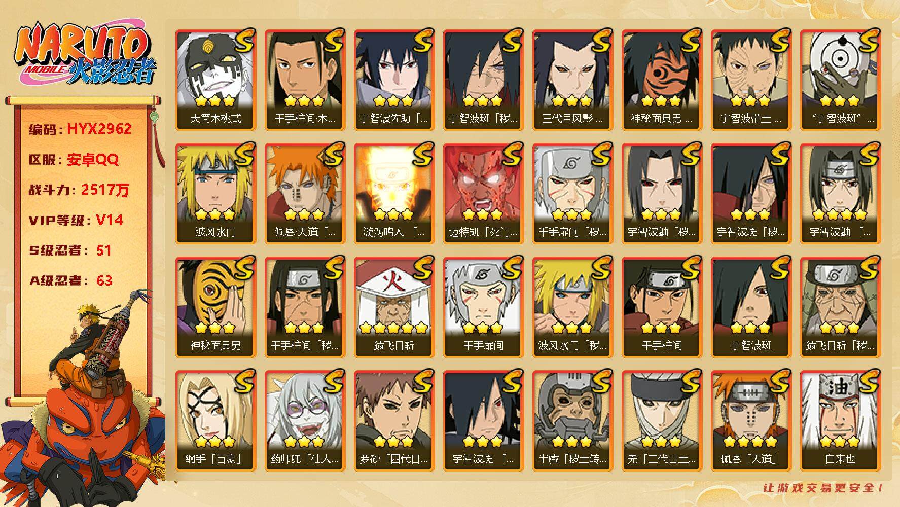 【HYX2962】V14/战力2517W/S忍51/A忍63/秽土转生宇智波斑/2星旗木卡卡西「忍界大战」/2星达鲁伊「博人传」/3星旗木卡卡西「须佐能乎」/5星蝎/宇智波斑/秽土转生猿飞日斩/2星照美冥「五代目水影」/千手扉间/5星迈特凯/自来也/秽土转生千手扉间/四代目风影罗砂/仙人模式药师兜/2星长十郎「六代目水影」/2星蝎「绯流琥」/2星春野樱「百豪」/死门迈特凯/宇智波带土-暴怒/2星勘九郎「忍界大战」/2星角都「晓创生」/2星迈特凯「惊门」/2星药师兜「半蛇斗篷」/春野樱-忍界大战/2星宇智波佐助「万花筒写轮眼」/2星猿飞木叶丸「博人传」/神秘面具男/2星大蛇丸「晓」/2星日向宁次「忍界大战」/5星纲手/宇智波佐助-永恒万花筒/2星长门「青年」/忍界大战宇智波带土/4星宇智波鼬「须佐能乎」/波风水门/3星大筒木舍人「最终章」/三代目土影大野木/2星角都「秽土转生」/5星大蛇丸/三代目雷影艾/2星李洛克「忍界大战」/波风水门-青年/秽土转生半藏/神秘面具男-红夜之刃/小南-新春限定/4星自来也「仙人模式」/2星日向雏田「最终章」/2星宇智波泉奈/宇智波止水-新春限定/木叶创立宇智波斑/3星艾「忍界大战」/2星小南「漂泊浪客」/3星宇智波斑「秽土转生·解」/二代目水影鬼灯幻月/宇智波佐助-须佐能乎/百豪纲手/5星我爱罗「疾风传」/二代目土影无/2星旗木卡卡西「元气夏日」/2星宇智波止水/5星猿飞阿斯玛/2星猿飞日斩「火影继承人」/3星烈斗「初代目风影」/秽土转生三代目风影/2星奇拉比「忍界大战」/千手柱间-木叶创立/神秘面具男-忍者之路/5星猿飞日斩/3星大筒木桃式/5星飞段「死司凭血」/3星漩涡鸣人「暴怒·第六尾」/2星桃地再不斩「秽土转生」/白面具宇智波斑/2星地陆/3星自来也「传说中的三忍」/千手柱间/佩恩六道-漂泊浪客/2星黑土「博人传」/超佩恩天道/2星神农「羁绊」/2星我爱罗「忍界大战」/2星迪达拉/2星小南/2星漩涡鸣人「九尾查克拉」/秽土转生金角银角/2星宇智波带土「漂泊浪客」/2星宇智波鼬/博人传大筒木金式/秽土转生宇智波鼬/3星迪达拉「秽土转生」/4星佩恩「天道」/桃地再不斩-漂泊武士/2星角都「地怨虞」/九喇嘛连结漩涡鸣人/秽土转生波风水门/2星秋道丁次「忍界大战」/2星漩涡博人「桃式显现」/2星旗木卡卡西「万花筒写轮眼」/四代目雷影艾/秽土转生千手柱间/2星卑留呼「火之意志继承者」/舞之豪杰自来也/3星宇智波止水「须佐能乎」/4星飞段/2星奇拉比/2星漩涡鸣人「仙人模式」/2星宇智波鼬「夏日限定」/2星加藤断/2星旗木卡卡西/2星艾「青年」/忍界大战大野木/5星干柿鬼鲛/2星千代「近松十人卫」/2星角都【按大区: 安卓QQ】