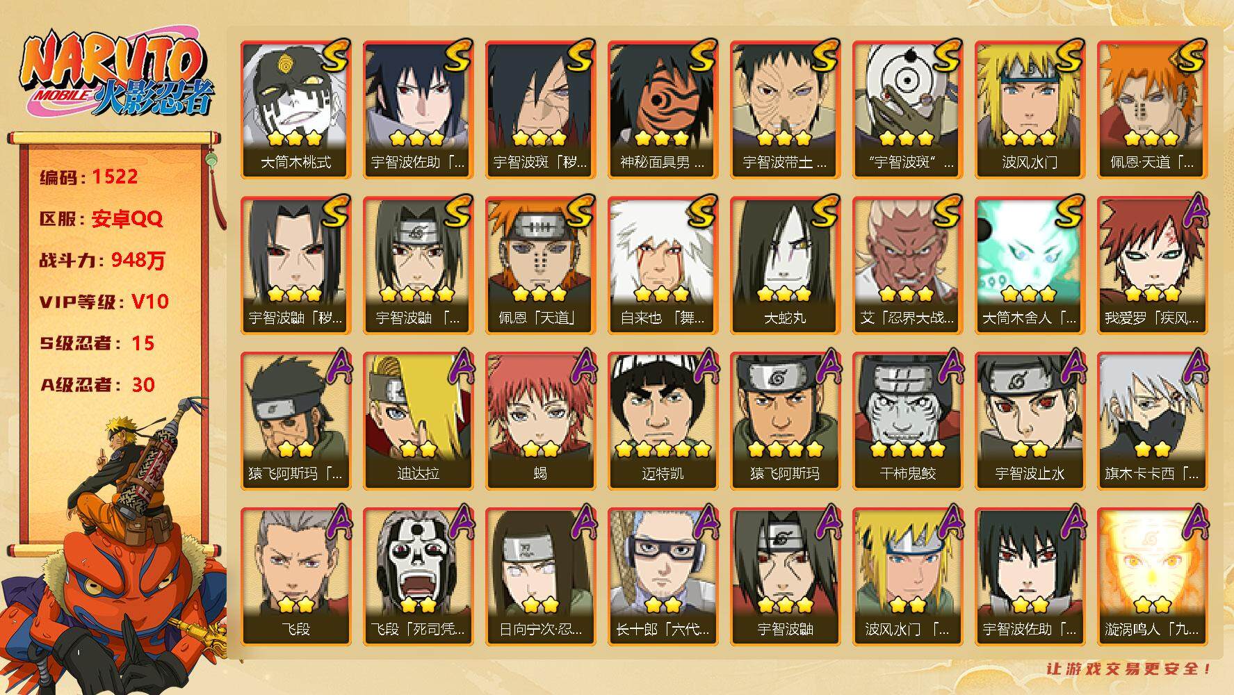 [12139931]V10 948万战力 15S级忍者数-30A级忍者数 九喇嘛水门54片 秽土柱间50片 秽土日斩67片 LL5199