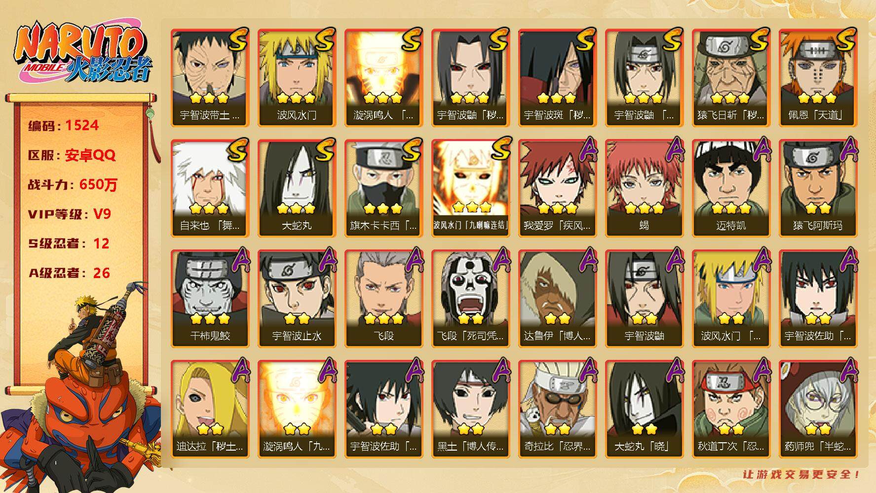 [12140797]V9 650万战力 12S级忍者数-26A级忍者数 永恒佐助43片 纲手75片 秽土柱间62片 LL5204