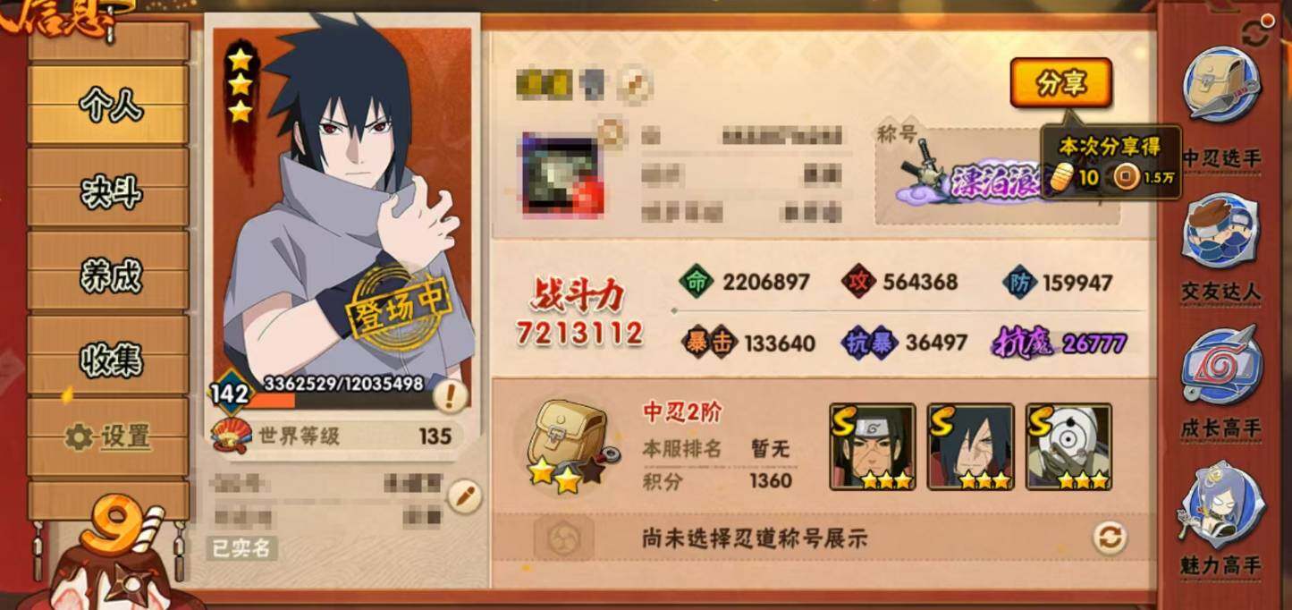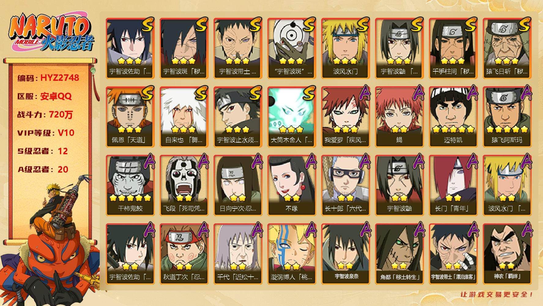 【HYZ2748】V10/战力720W/S忍12/A忍20/2星日向宁次「忍界大战」/2星宇智波带土「漂泊浪客」/2星飞段「死司凭血」/2星宇智波鼬/宇智波佐助-永恒万花筒/5星猿飞阿斯玛/2星长门「青年」/忍界大战宇智波带土/2星蝎/秽土转生猿飞日斩/天道佩恩/波风水门/3星大筒木舍人「最终章」/2星秋道丁次「忍界大战」/2星角都「秽土转生」/5星迈特凯/2星漩涡博人「桃式显现」/秽土转生千手柱间/3星我爱罗「疾风传」/2星长十郎「六代目水影」/波风水门-青年/舞之豪杰自来也/白面具宇智波斑/3星宇智波止水「须佐能乎」/2星神农「羁绊」/2星宇智波泉奈/3星宇智波斑「秽土转生·解」/2星不缘/宇智波佐助-须佐能乎/5星干柿鬼鲛/2星千代「近松十人卫」/须佐能乎宇智波鼬【按大区: 安卓QQ】