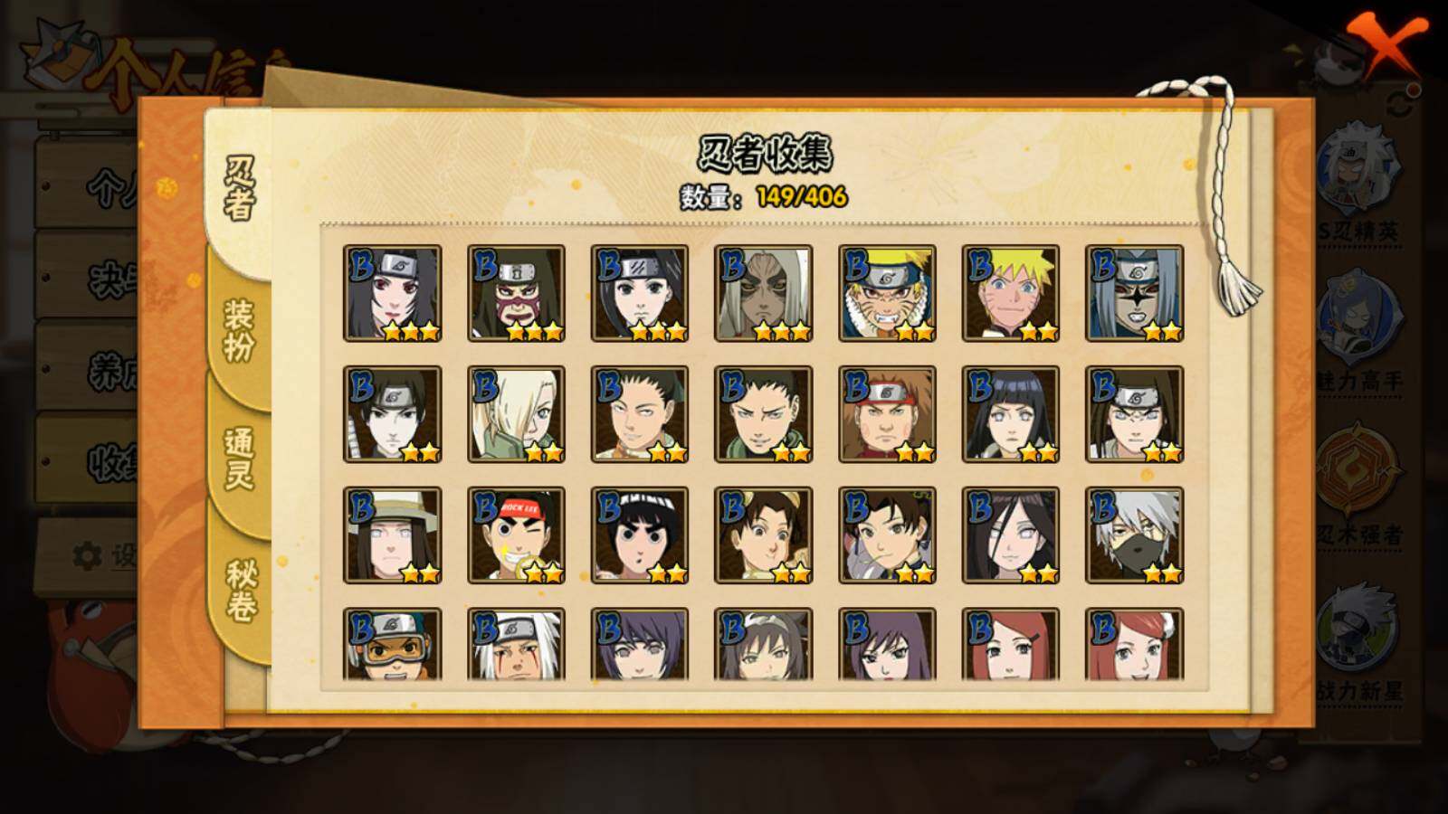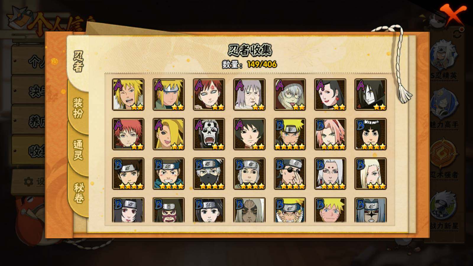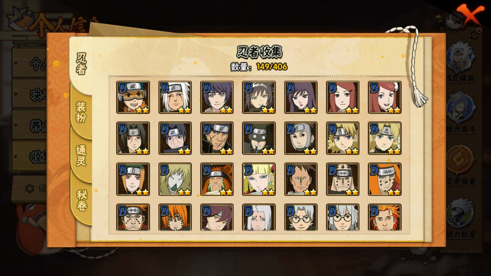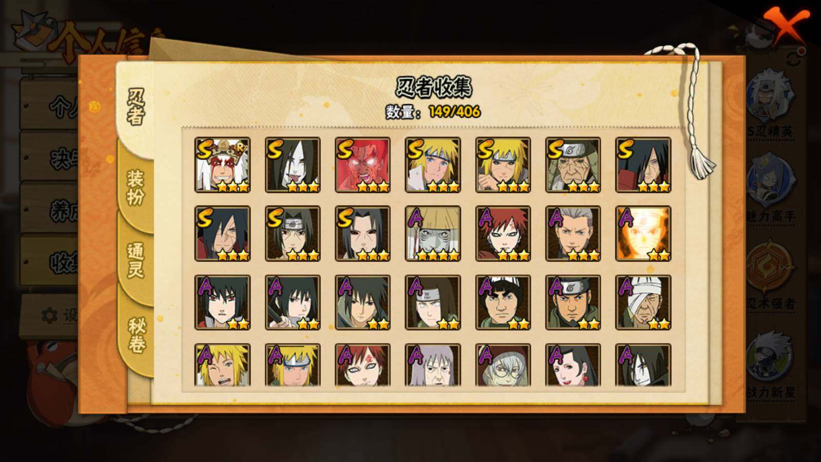 【S级忍者】:猿飞日斩「秽土转生」(3星),波风水门「秽土转生」(3星),宇智波鼬「秽土转生」(3星),宇智波斑「秽土转生」(3星),宇智波斑「秽土转生·解」(3星),宇智波鼬「须佐能乎」(3星),自来也「舞之豪杰」(3星),大蛇丸(3星),波风水门(3星),迈特凯「死门」(3星)