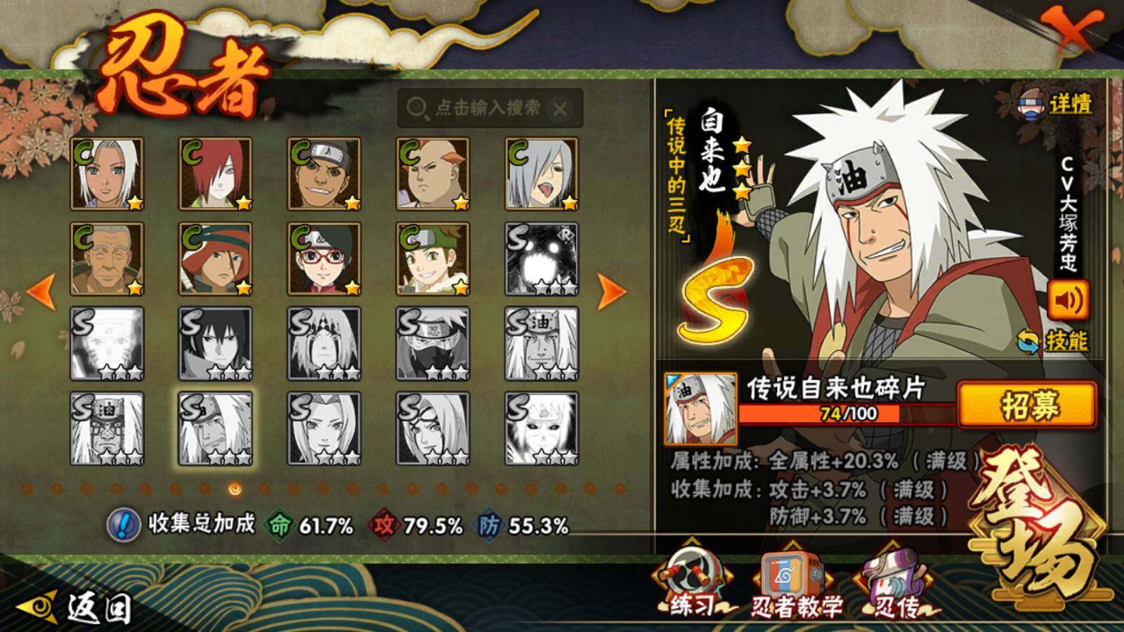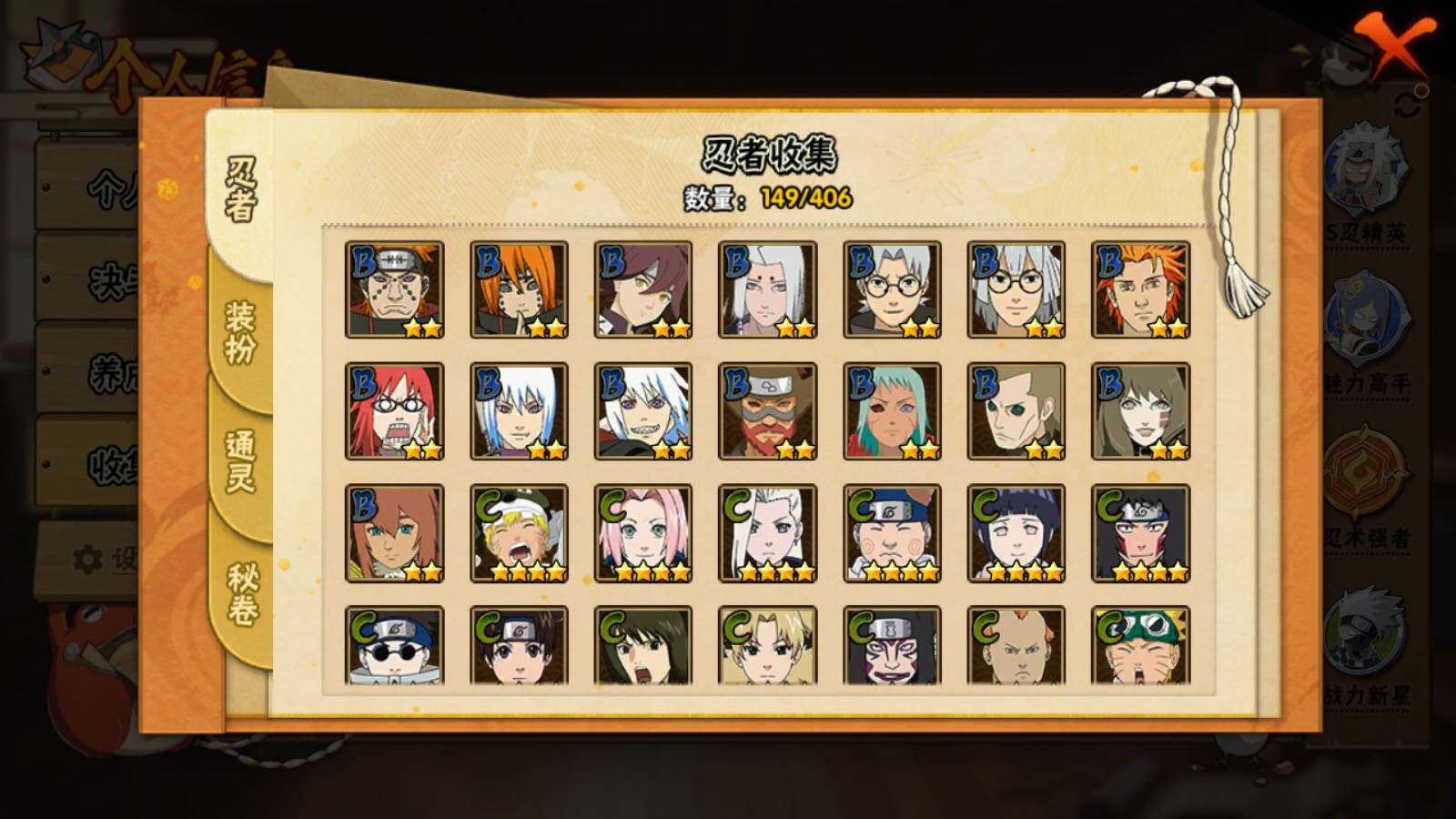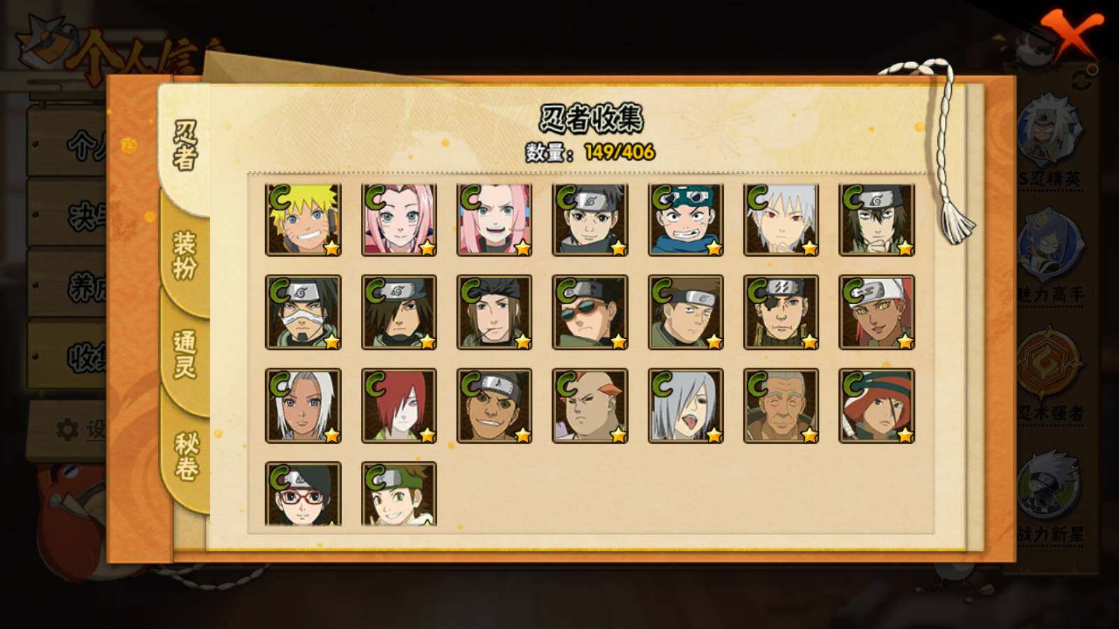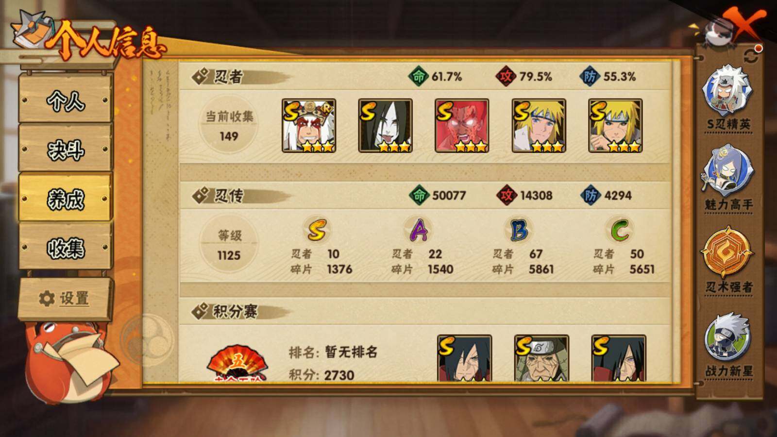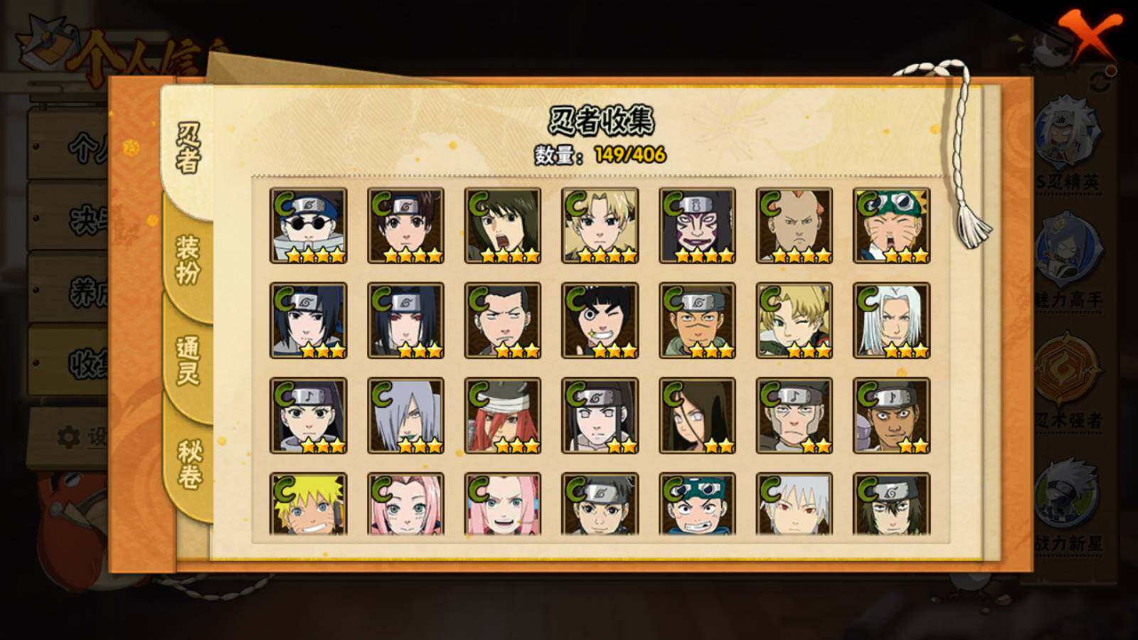 【S级忍者】:猿飞日斩「秽土转生」(3星),波风水门「秽土转生」(3星),宇智波鼬「秽土转生」(3星),宇智波斑「秽土转生」(3星),宇智波斑「秽土转生·解」(3星),宇智波鼬「须佐能乎」(3星),自来也「舞之豪杰」(3星),大蛇丸(3星),波风水门(3星),迈特凯「死门」(3星)