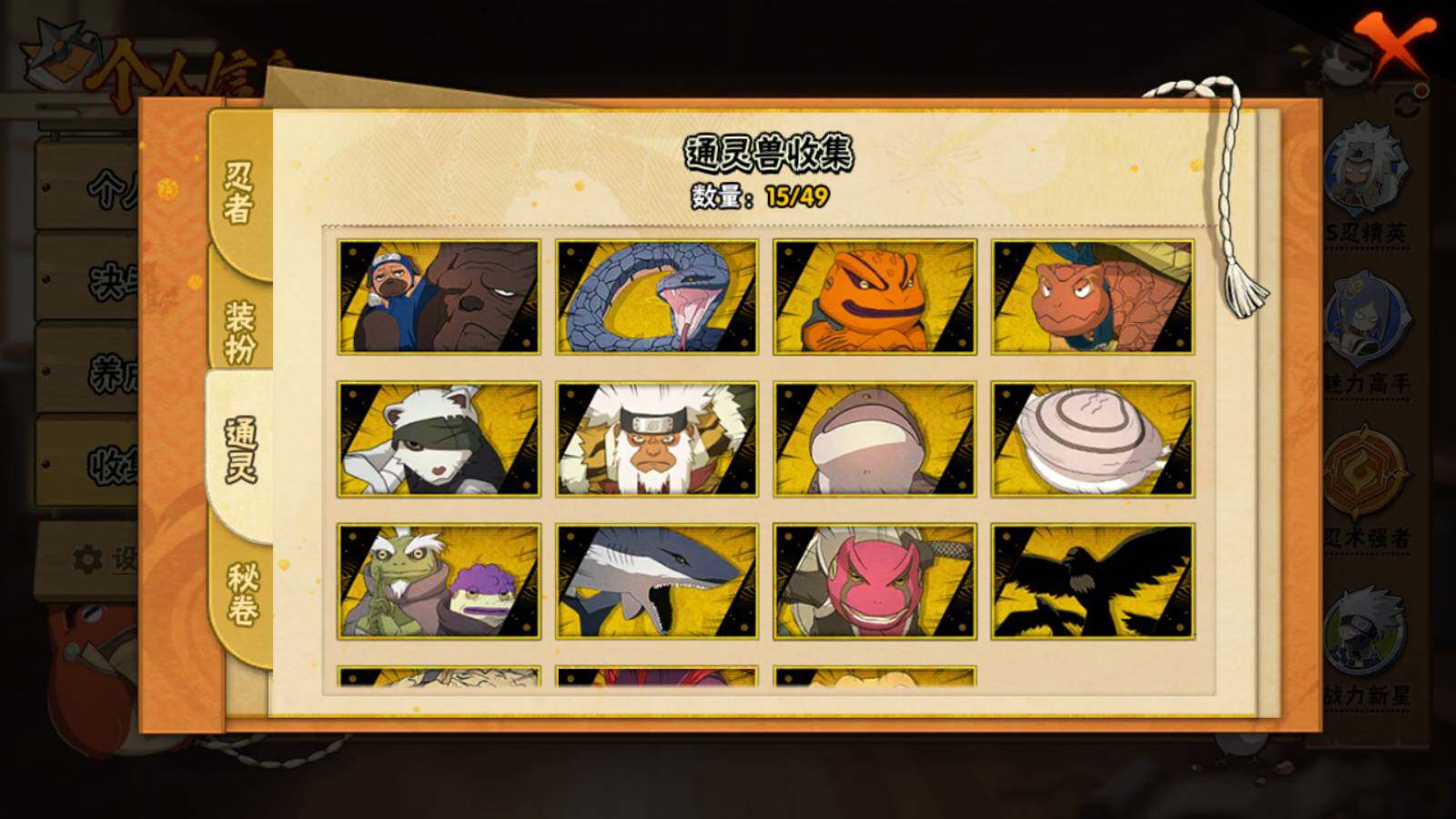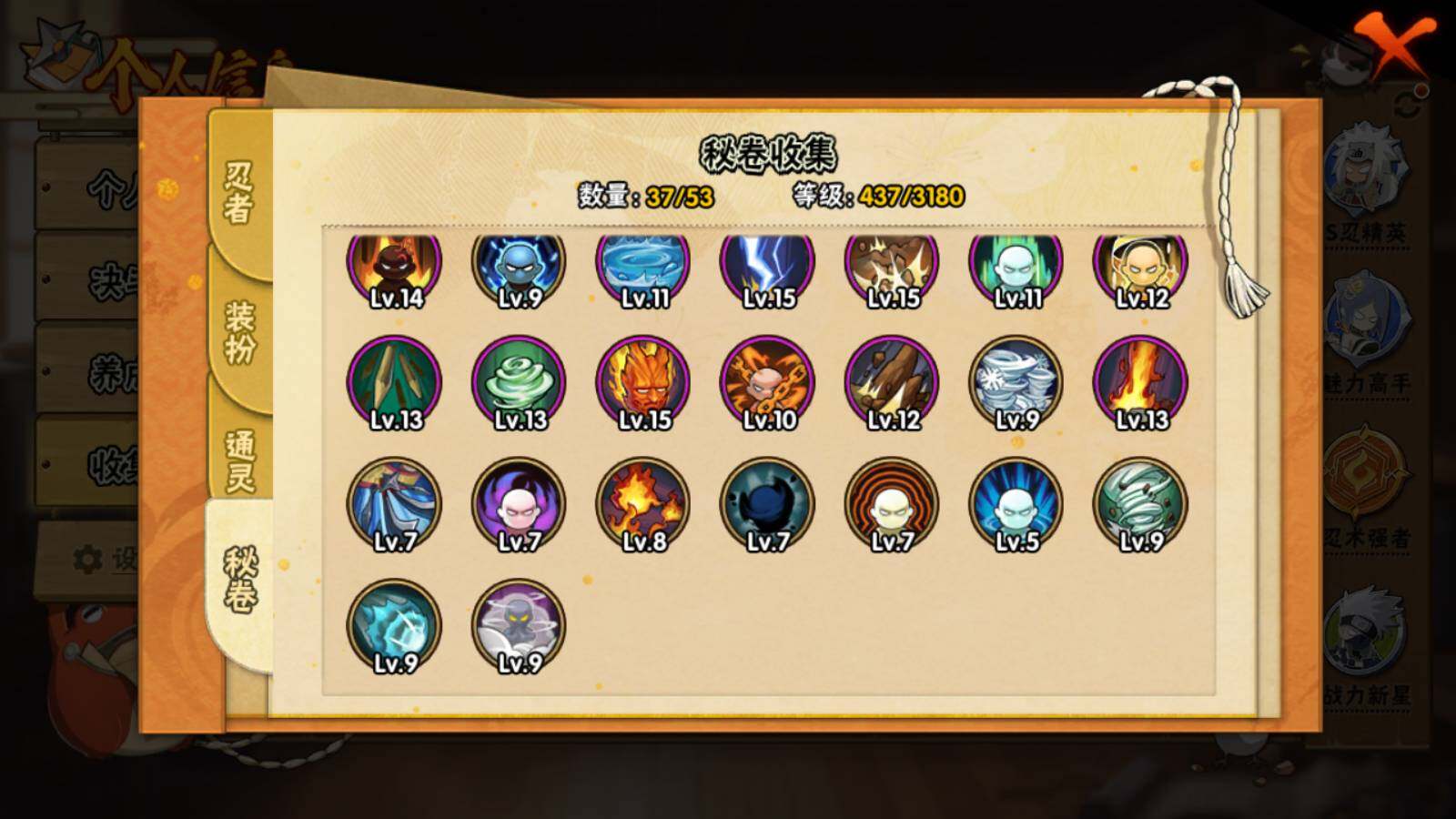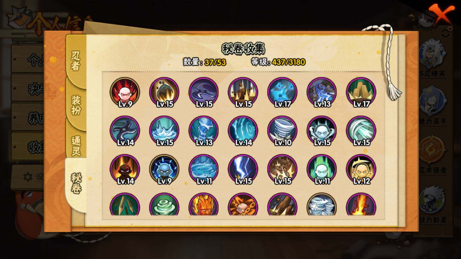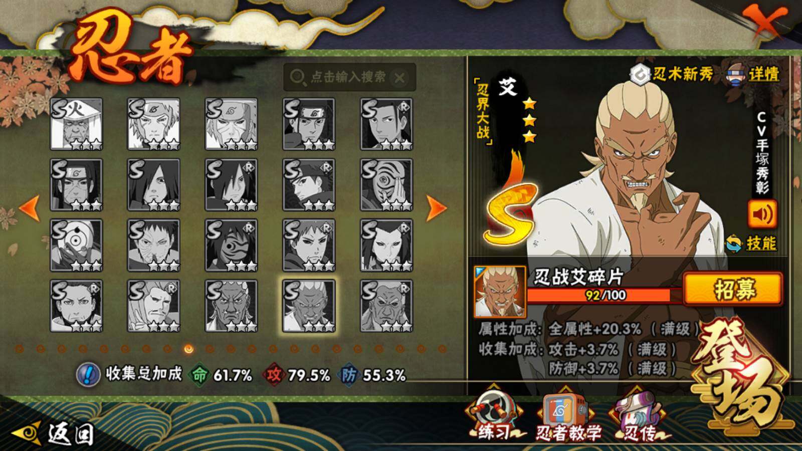 【S级忍者】:猿飞日斩「秽土转生」(3星),波风水门「秽土转生」(3星),宇智波鼬「秽土转生」(3星),宇智波斑「秽土转生」(3星),宇智波斑「秽土转生·解」(3星),宇智波鼬「须佐能乎」(3星),自来也「舞之豪杰」(3星),大蛇丸(3星),波风水门(3星),迈特凯「死门」(3星)