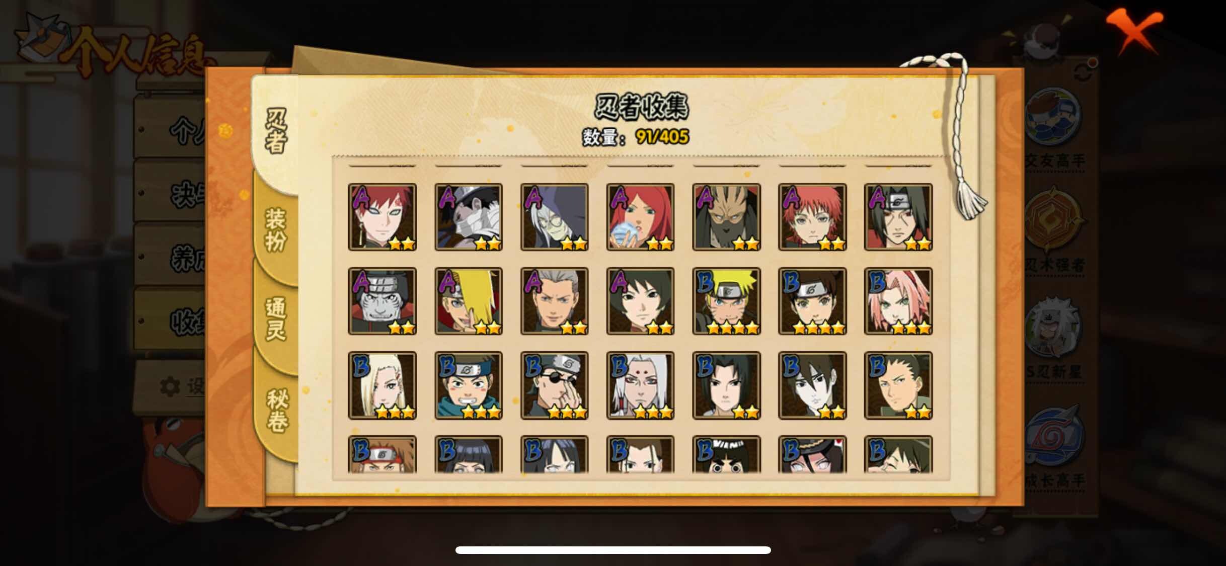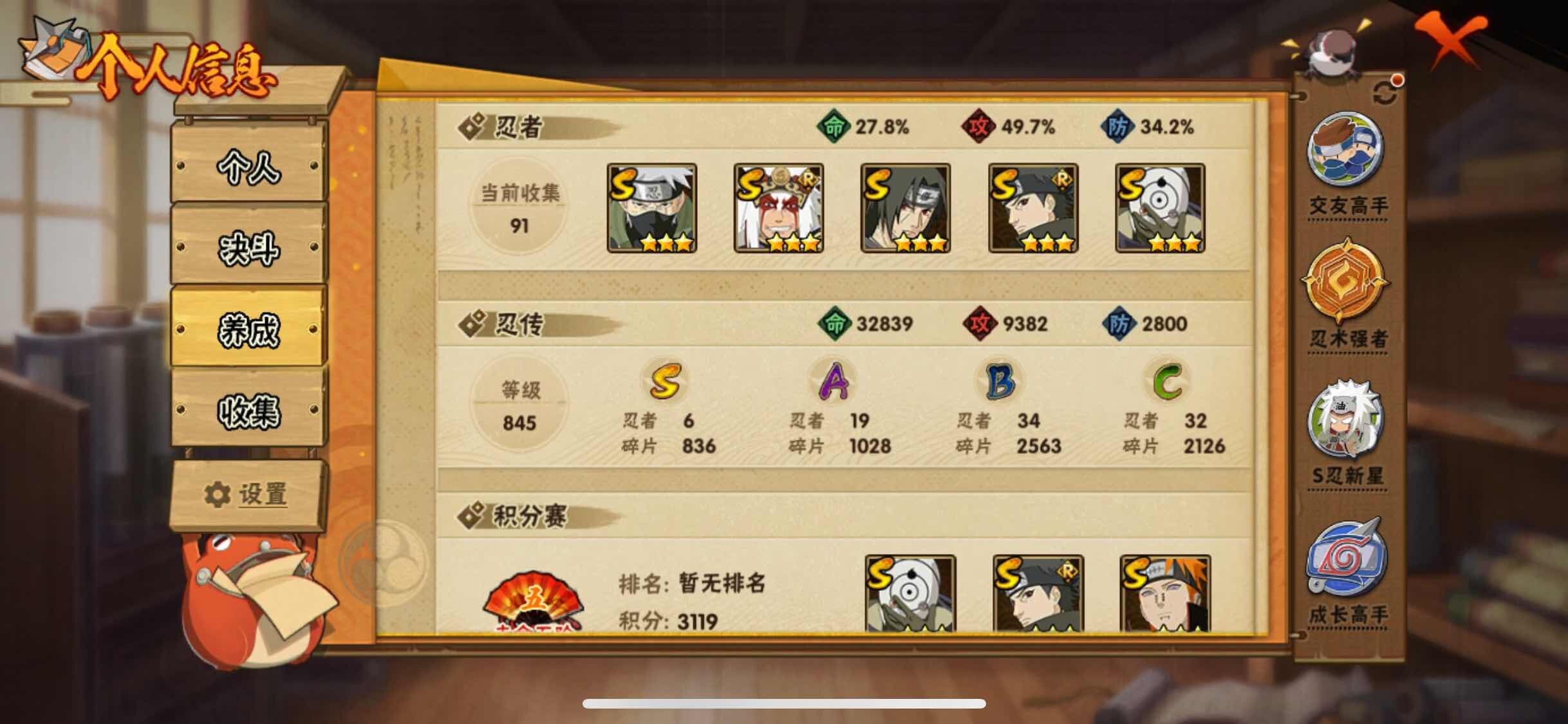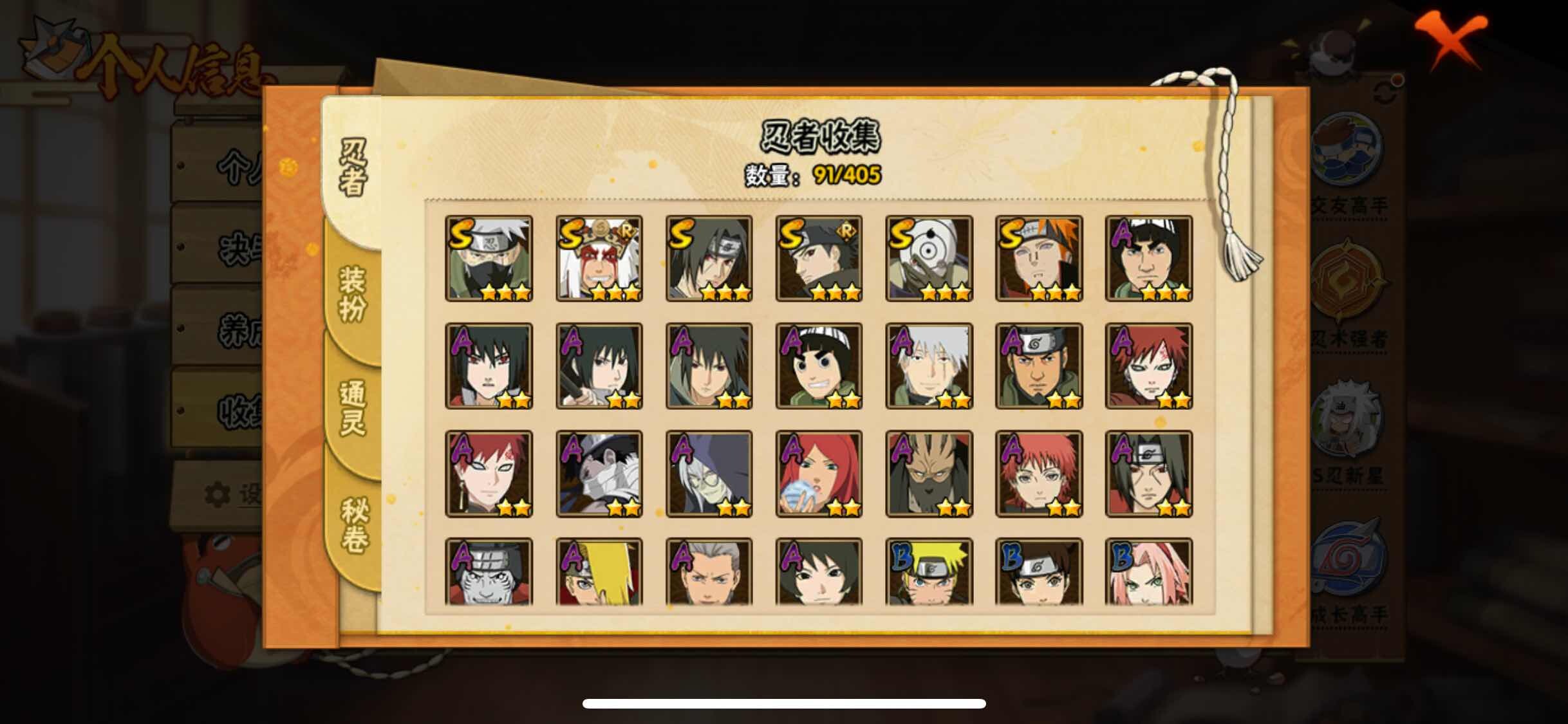 【S级忍者】:宇智波鼬「须佐能乎」(3星),宇智波止水「须佐能乎」(3星),旗木卡卡西「须佐能乎」(3星),自来也「舞之豪杰」(3星),佩恩「天道」(3星),宇智波斑 「白面具」(3星宇智波斑「白面具」)