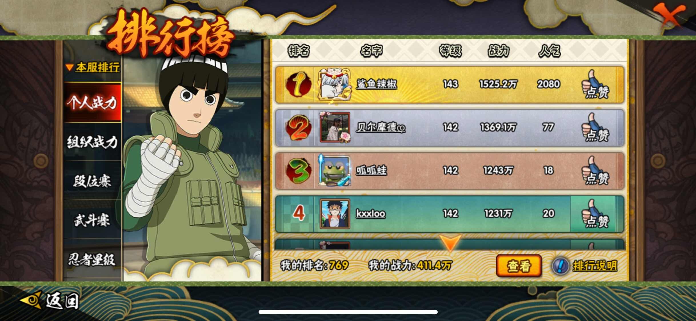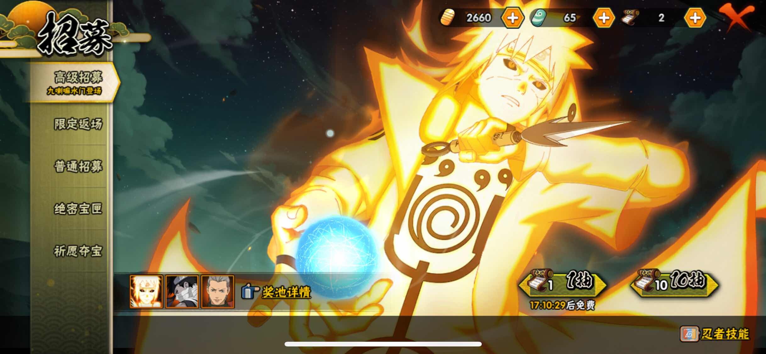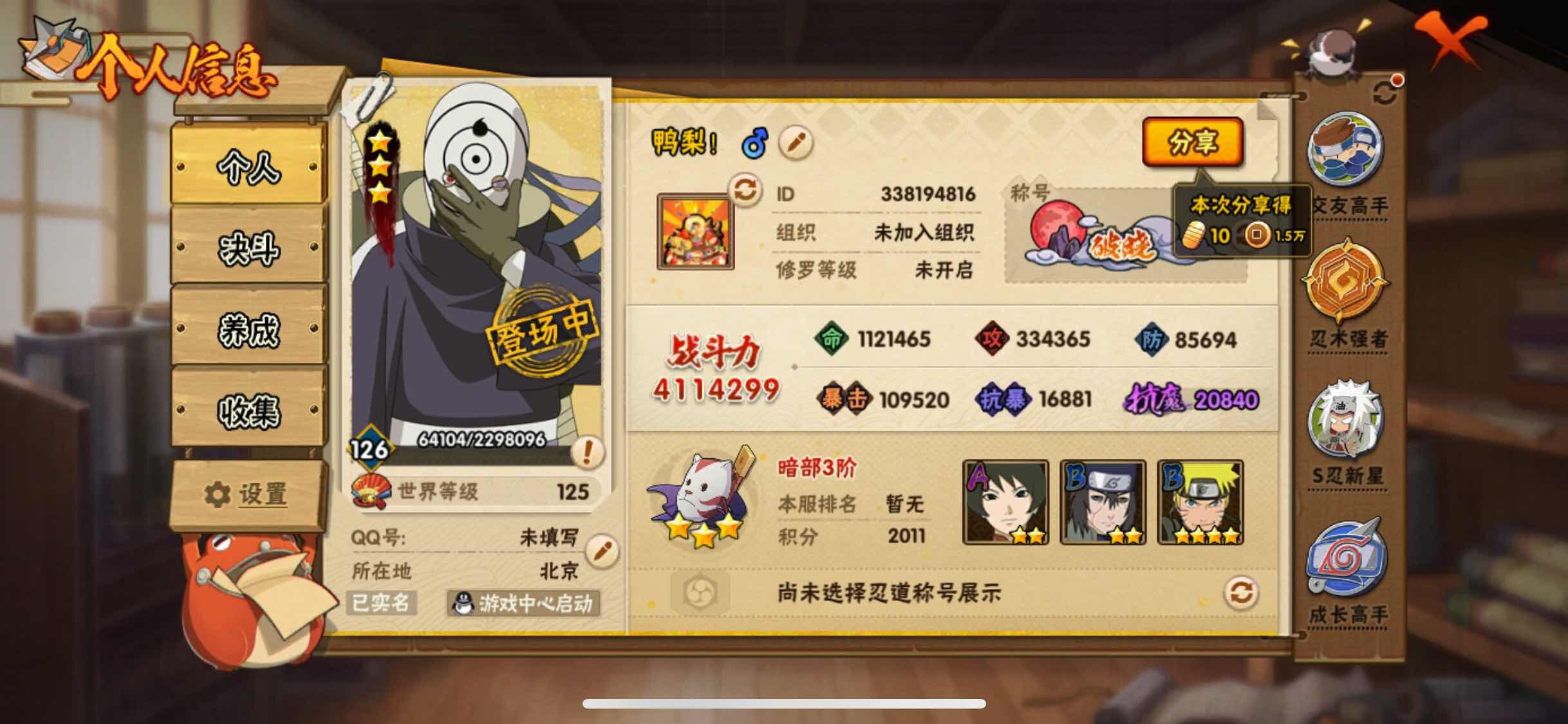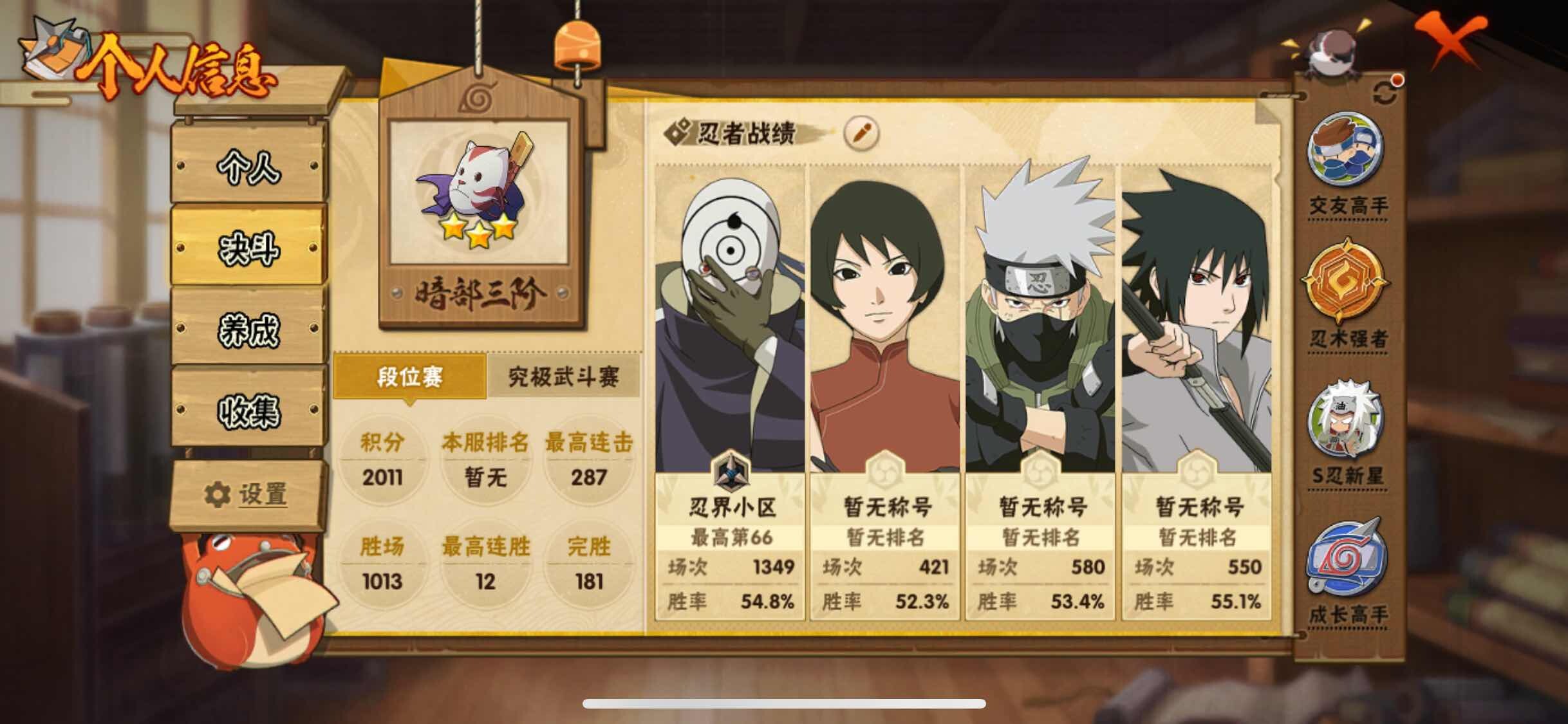 【S级忍者】:宇智波鼬「须佐能乎」(3星),宇智波止水「须佐能乎」(3星),旗木卡卡西「须佐能乎」(3星),自来也「舞之豪杰」(3星),佩恩「天道」(3星),宇智波斑 「白面具」(3星宇智波斑「白面具」)