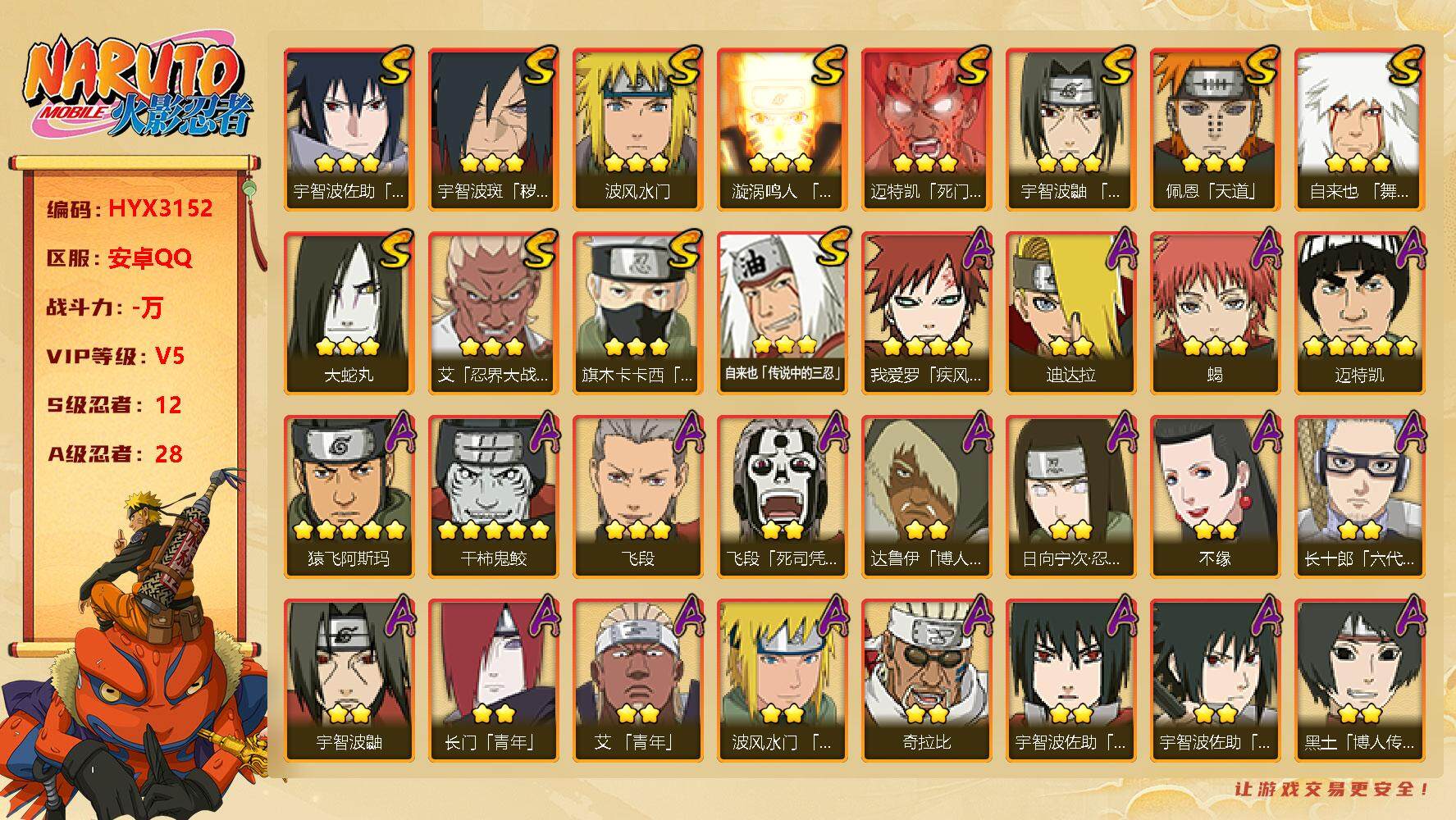 【HYX3152】V5/S忍12/A忍28/2星日向宁次「忍界大战」/2星达鲁伊「博人传」/2星飞段「死司凭血」/2星宇智波鼬/宇智波佐助-永恒万花筒/5星猿飞阿斯玛/3星旗木卡卡西「须佐能乎」/2星长门「青年」/3星飞段/天道佩恩/波风水门/3星蝎/九喇嘛连结漩涡鸣人/2星秋道丁次「忍界大战」/5星迈特凯/2星漩涡博人「桃式显现」/2星李洛克「忍界大战」/2星长十郎「六代目水影」/波风水门-青年/2星蝎「绯流琥」/舞之豪杰自来也/死门迈特凯/3星自来也「传说中的三忍」/2星黑土「博人传」/2星药师兜「半蛇斗篷」/2星日向雏田「最终章」/2星奇拉比/2星宇智波佐助「万花筒写轮眼」/2星宇智波泉奈/2星迪达拉/4星我爱罗「疾风传」/大蛇丸/3星艾「忍界大战」/3星宇智波斑「秽土转生·解」/2星艾「青年」/2星不缘/宇智波佐助-须佐能乎/5星干柿鬼鲛/2星千代「近松十人卫」/须佐能乎宇智波鼬【按大区: 安卓QQ】