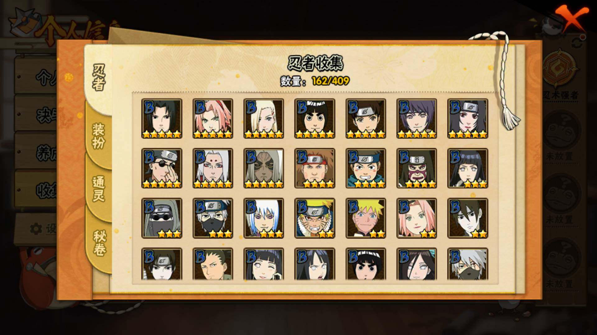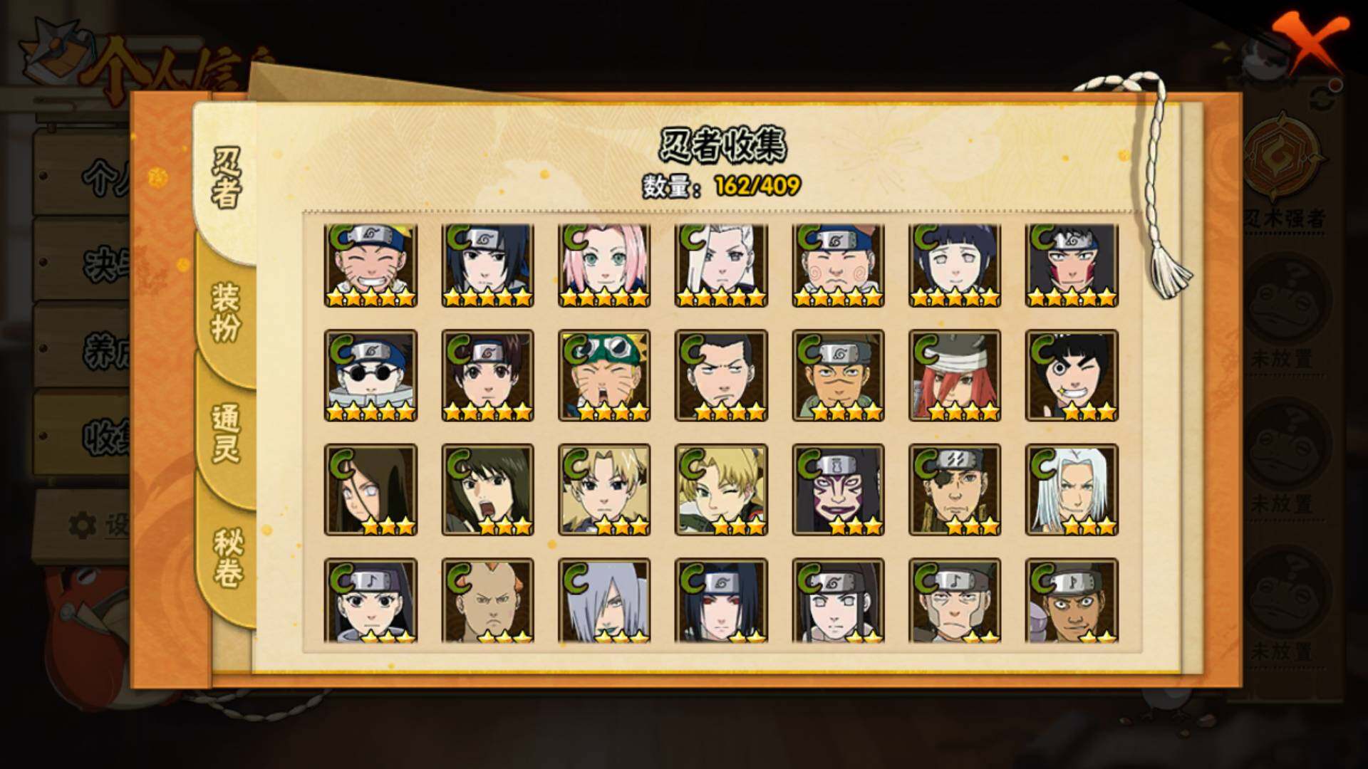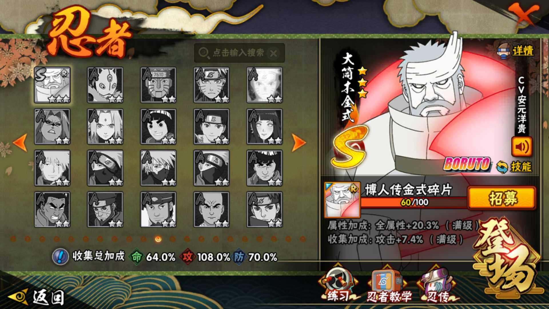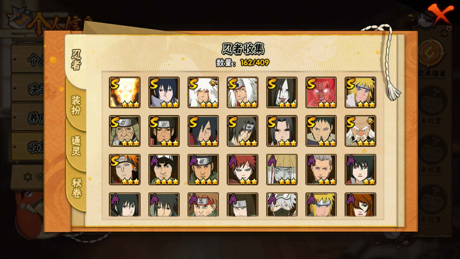 【S级忍者】:猿飞日斩「秽土转生」(3星),千手柱间「秽土转生」(3星),宇智波鼬「秽土转生」(3星),宇智波斑「秽土转生·解」(3星),大野木「忍界大战」(3星),宇智波带土「忍界大战」(3星),宇智波鼬「须佐能乎」(3星),自来也「舞之豪杰」(3星),大蛇丸(3星),自来也「传说中的三忍」(3星),波风水门(3星),漩涡鸣人「九喇嘛连结」(3星),迈特凯「死门」(3星),佩恩「天道」(3星),宇智波佐助「永恒万花筒」(3星)