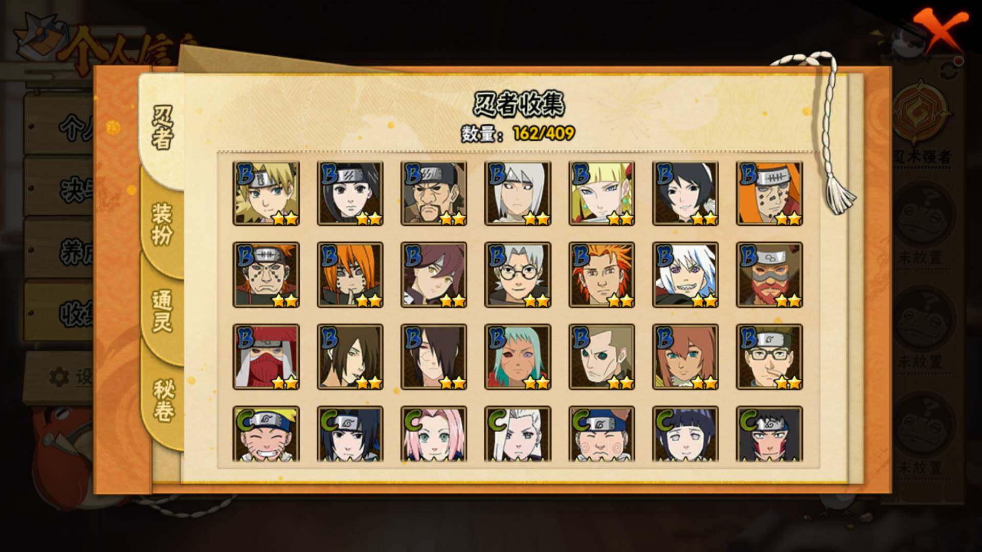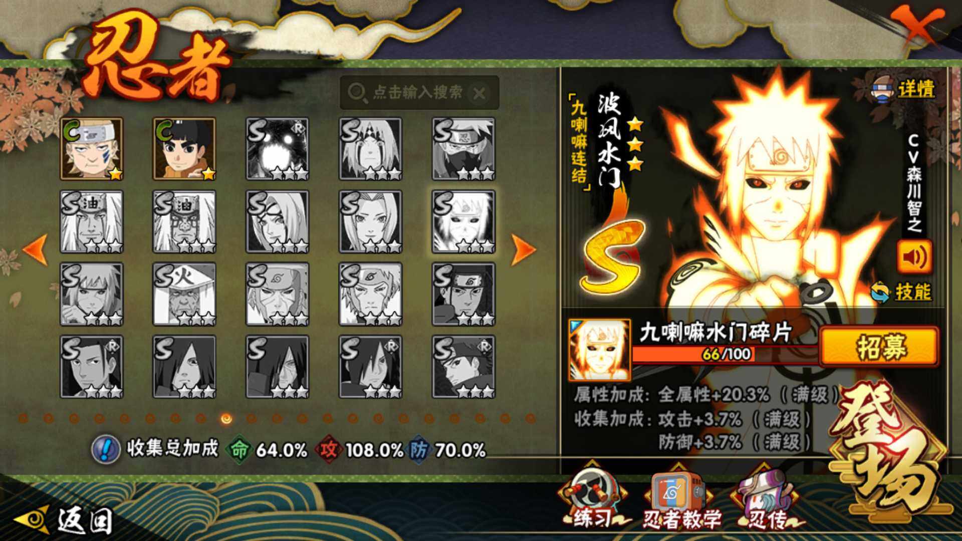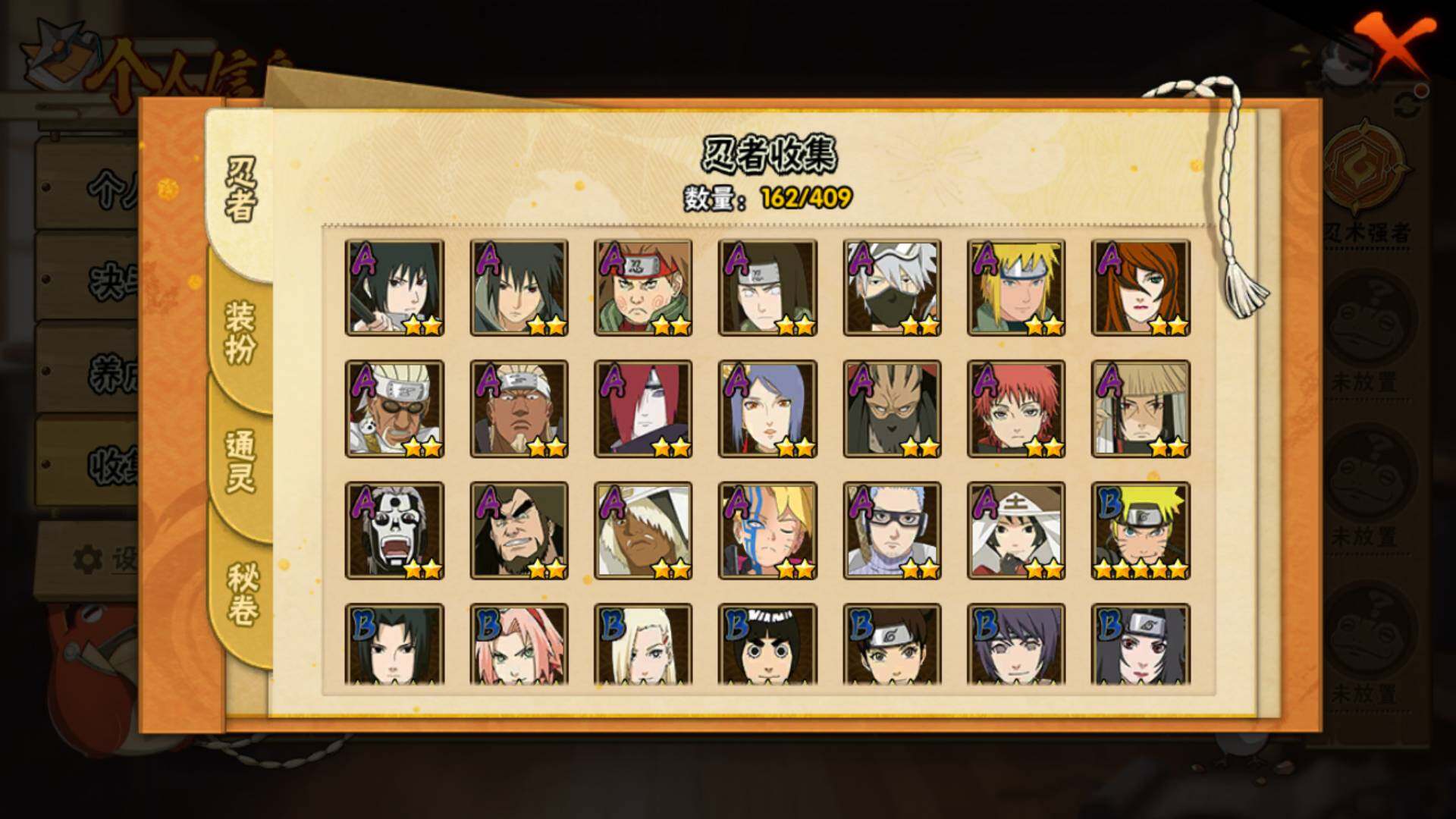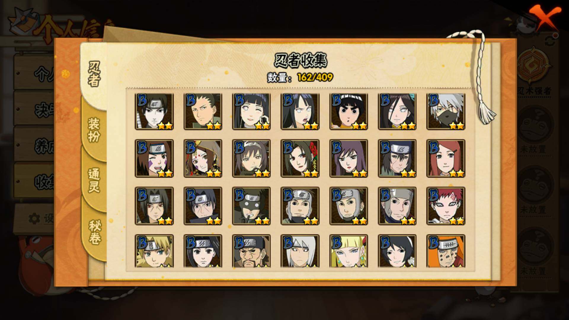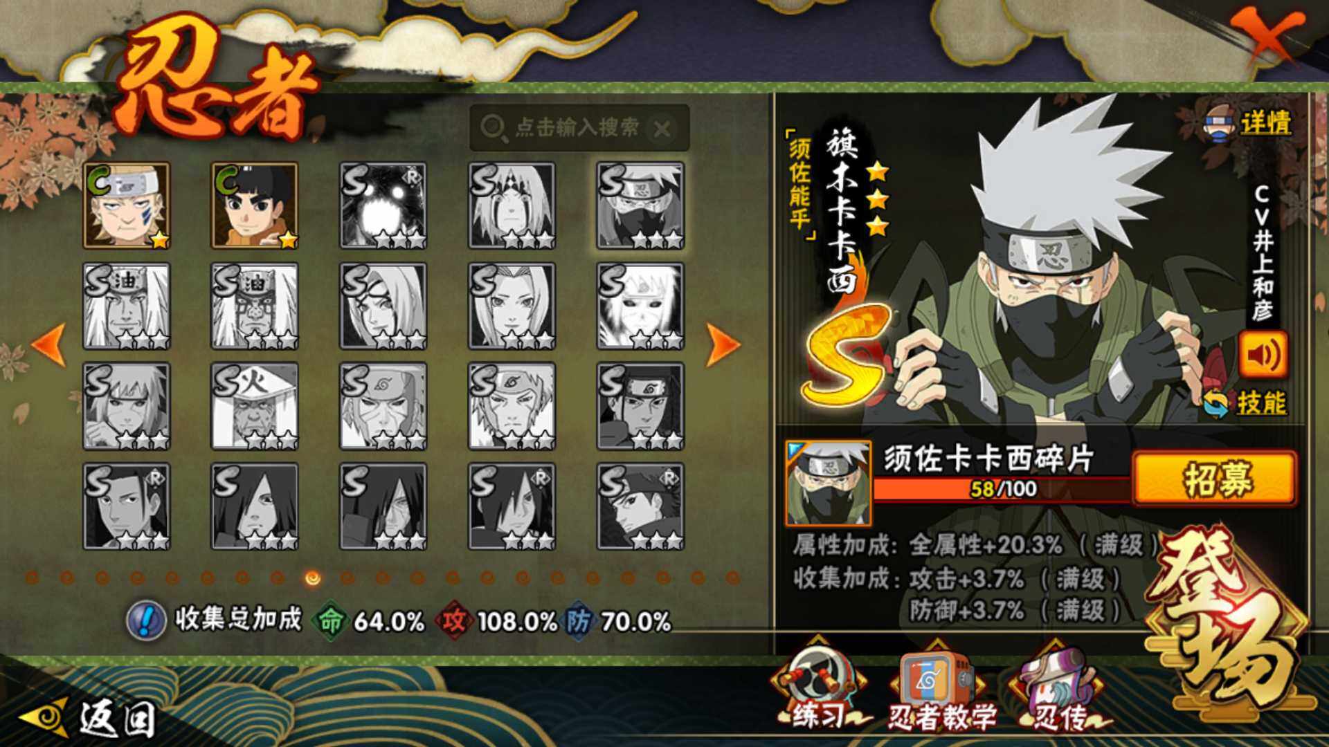 【S级忍者】:猿飞日斩「秽土转生」(3星),千手柱间「秽土转生」(3星),宇智波鼬「秽土转生」(3星),宇智波斑「秽土转生·解」(3星),大野木「忍界大战」(3星),宇智波带土「忍界大战」(3星),宇智波鼬「须佐能乎」(3星),自来也「舞之豪杰」(3星),大蛇丸(3星),自来也「传说中的三忍」(3星),波风水门(3星),漩涡鸣人「九喇嘛连结」(3星),迈特凯「死门」(3星),佩恩「天道」(3星),宇智波佐助「永恒万花筒」(3星)