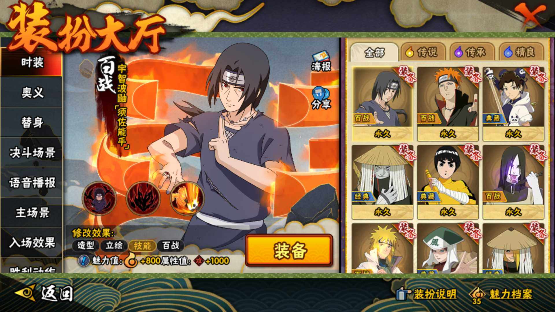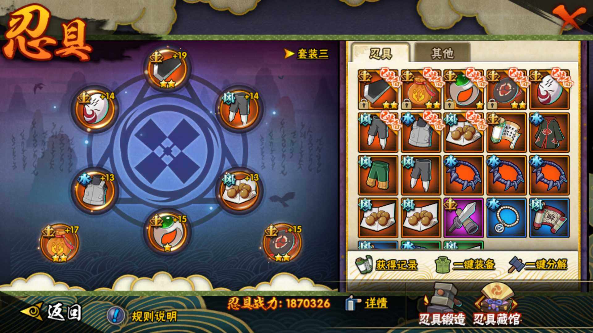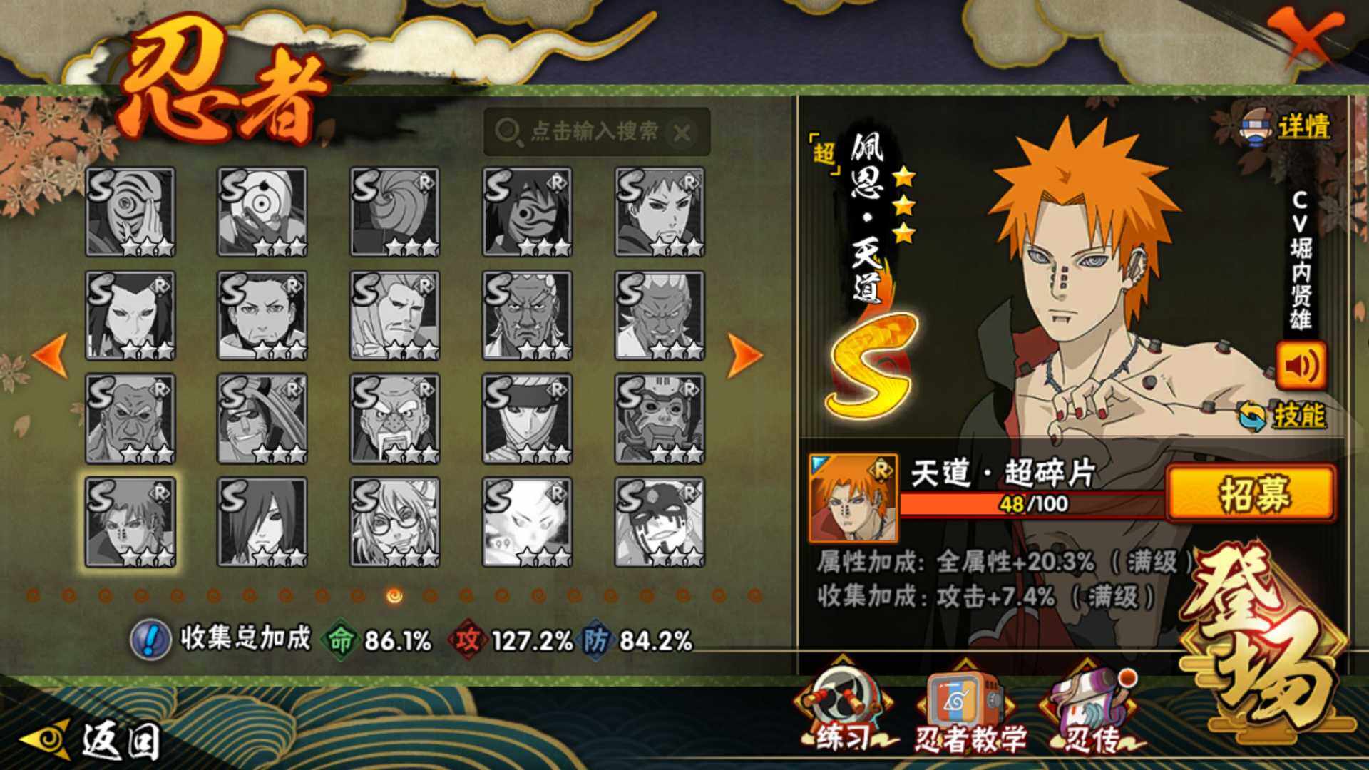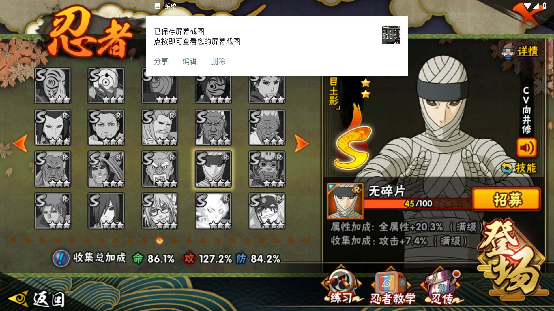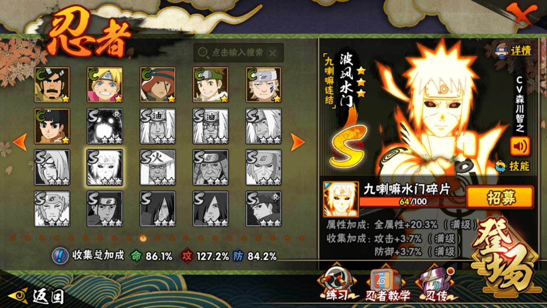 【S级忍者】:波风水门「秽土转生」(3星),千手柱间「秽土转生」(3星),宇智波鼬「秽土转生」(3星),宇智波斑「秽土转生·解」(3星),大野木「忍界大战」(3星),春野樱「忍界大战」(3星),宇智波带土「忍界大战」(3星),宇智波鼬「须佐能乎」(3星),旗木卡卡西「须佐能乎」(3星),宇智波斑「木叶创立」(3星),千手柱间「木叶创立」(3星),自来也「舞之豪杰」(3星),大蛇丸(3星),纲手(3星),波风水门(3星),漩涡鸣人「九喇嘛连结」(3星),迈特凯「死门」(3星),佩恩「天道」(3星),宇智波佐助「永恒万花筒」(3星)