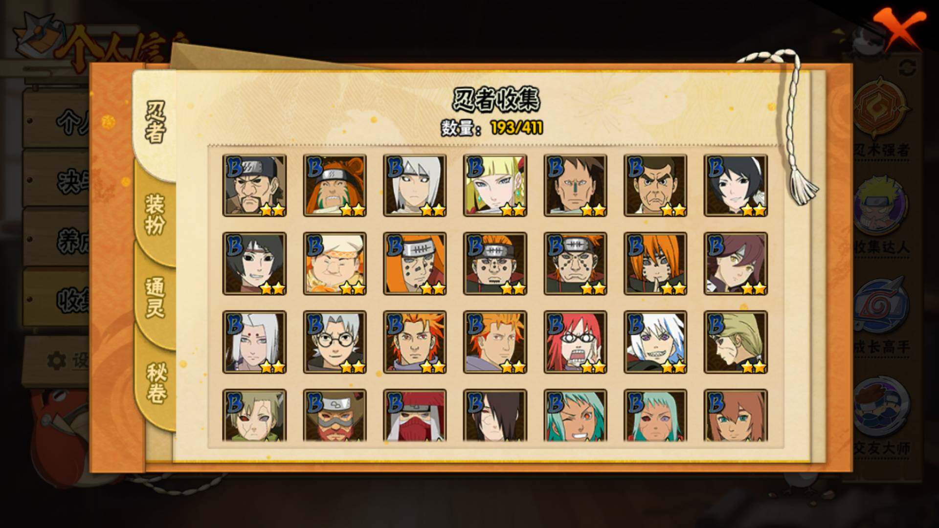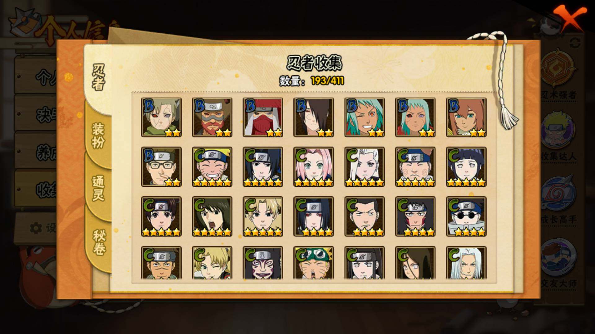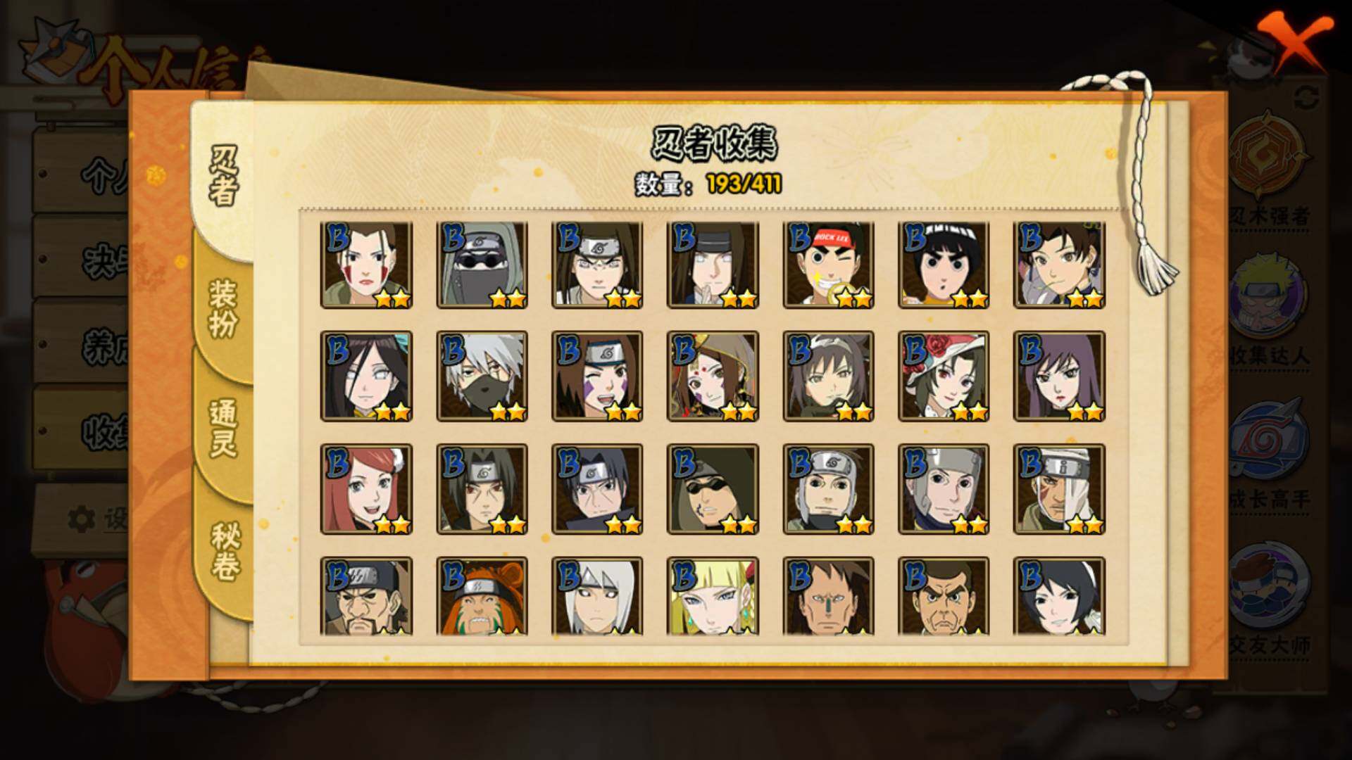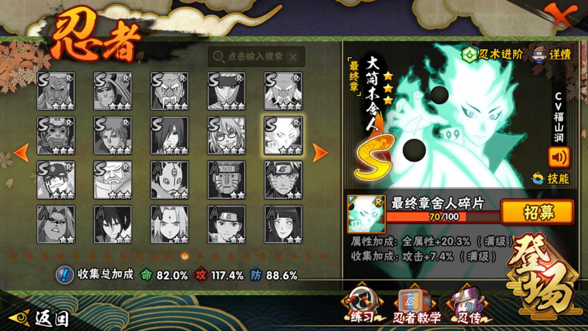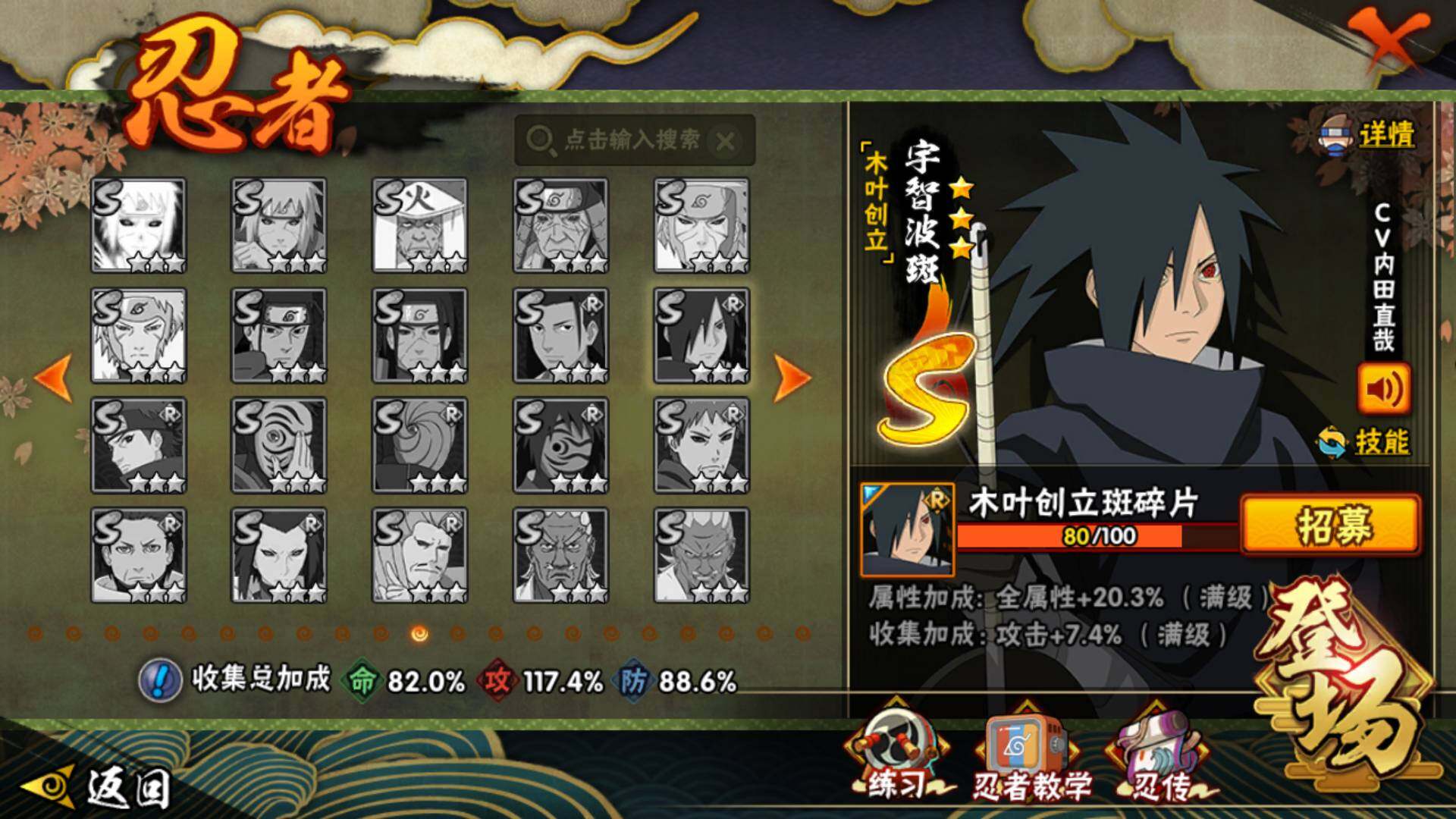 【S级忍者】:宇智波鼬「秽土转生」(3星),宇智波斑「秽土转生」(3星),宇智波斑「秽土转生·解」(3星),宇智波带土「忍界大战」(3星),宇智波鼬「须佐能乎」(3星),旗木卡卡西「须佐能乎」(3星),自来也「舞之豪杰」(3星),大蛇丸(3星),宇智波斑(3星),波风水门(3星),漩涡鸣人「九喇嘛连结」(3星),迈特凯「死门」(3星),佩恩「天道」(3星),宇智波佐助「永恒万花筒」(3星),宇智波斑 「白面具」(3星宇智波斑「白面具」)