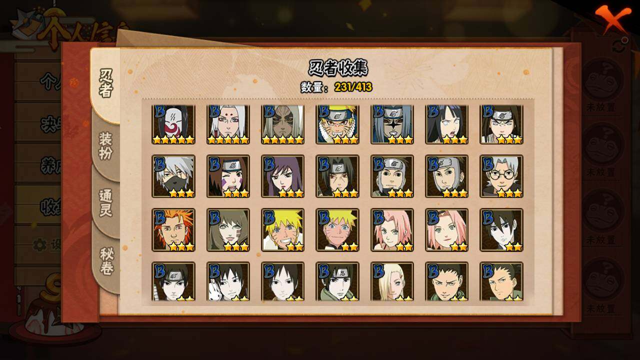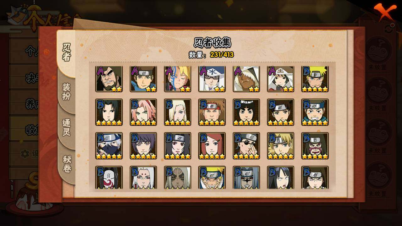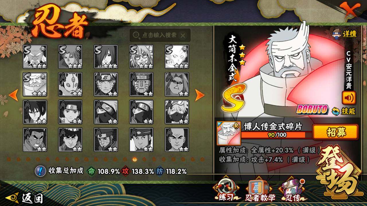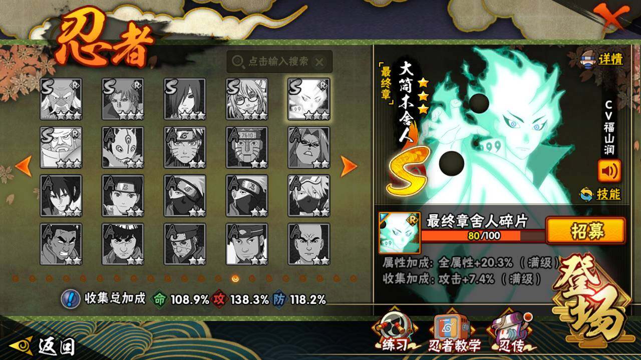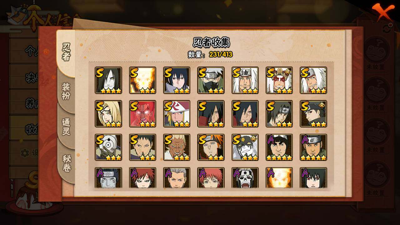 【S级忍者】:宇智波斑「秽土转生」(3星),宇智波斑「秽土转生·解」(3星),宇智波带土「忍界大战」(3星),艾「忍界大战」(3星),宇智波鼬「须佐能乎」(3星),宇智波止水「须佐能乎」(3星),旗木卡卡西「须佐能乎」(3星),自来也(3星),自来也「舞之豪杰」(3星),大蛇丸(4星),自来也「传说中的三忍」(3星),纲手「百豪」(3星),波风水门(3星),漩涡鸣人「九喇嘛连结」(3星),迈特凯「死门」(3星),佩恩「天道」(3星),宇智波佐助「永恒万花筒」(3星),宇智波斑 「白面具」(3星宇智波斑「白面具」),大筒木桃式(3星)