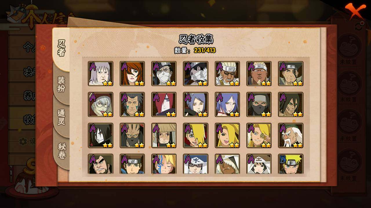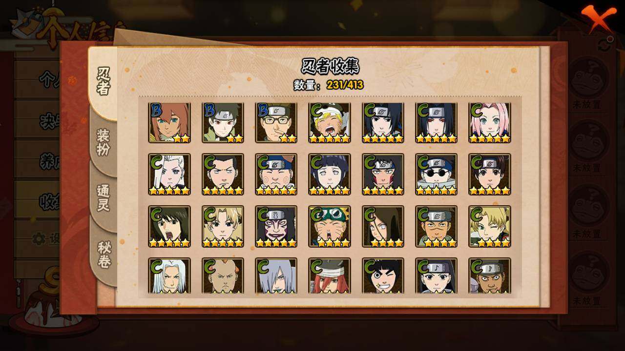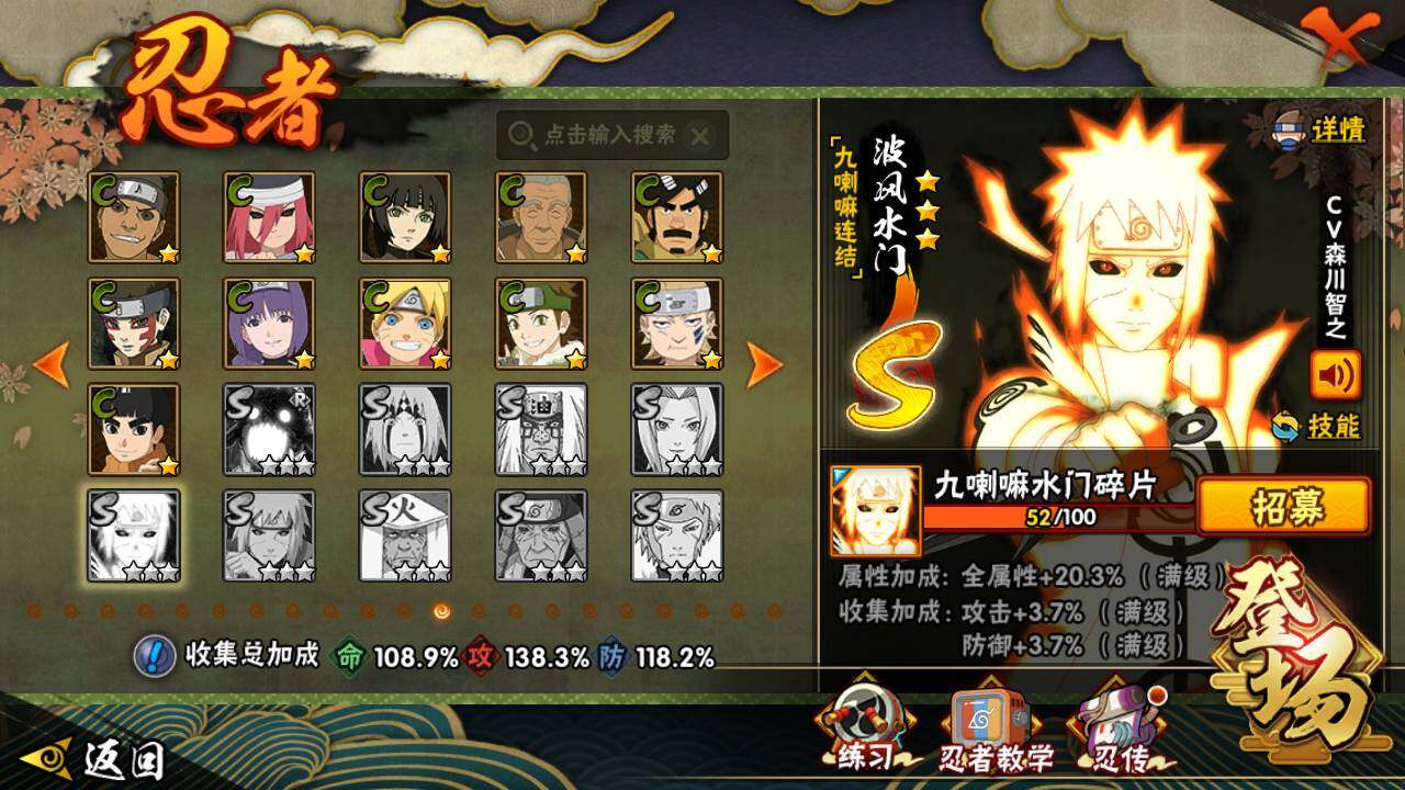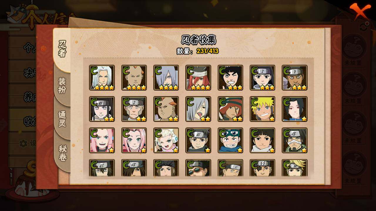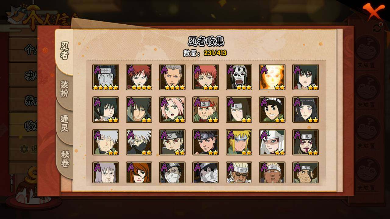【S级忍者】:宇智波斑「秽土转生」(3星),宇智波斑「秽土转生·解」(3星),宇智波带土「忍界大战」(3星),艾「忍界大战」(3星),宇智波鼬「须佐能乎」(3星),宇智波止水「须佐能乎」(3星),旗木卡卡西「须佐能乎」(3星),自来也(3星),自来也「舞之豪杰」(3星),大蛇丸(4星),自来也「传说中的三忍」(3星),纲手「百豪」(3星),波风水门(3星),漩涡鸣人「九喇嘛连结」(3星),迈特凯「死门」(3星),佩恩「天道」(3星),宇智波佐助「永恒万花筒」(3星),宇智波斑 「白面具」(3星宇智波斑「白面具」),大筒木桃式(3星)