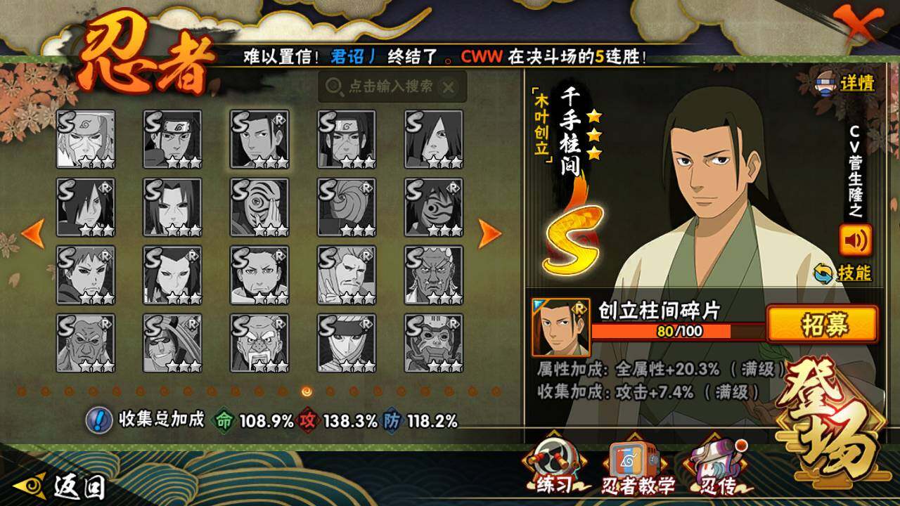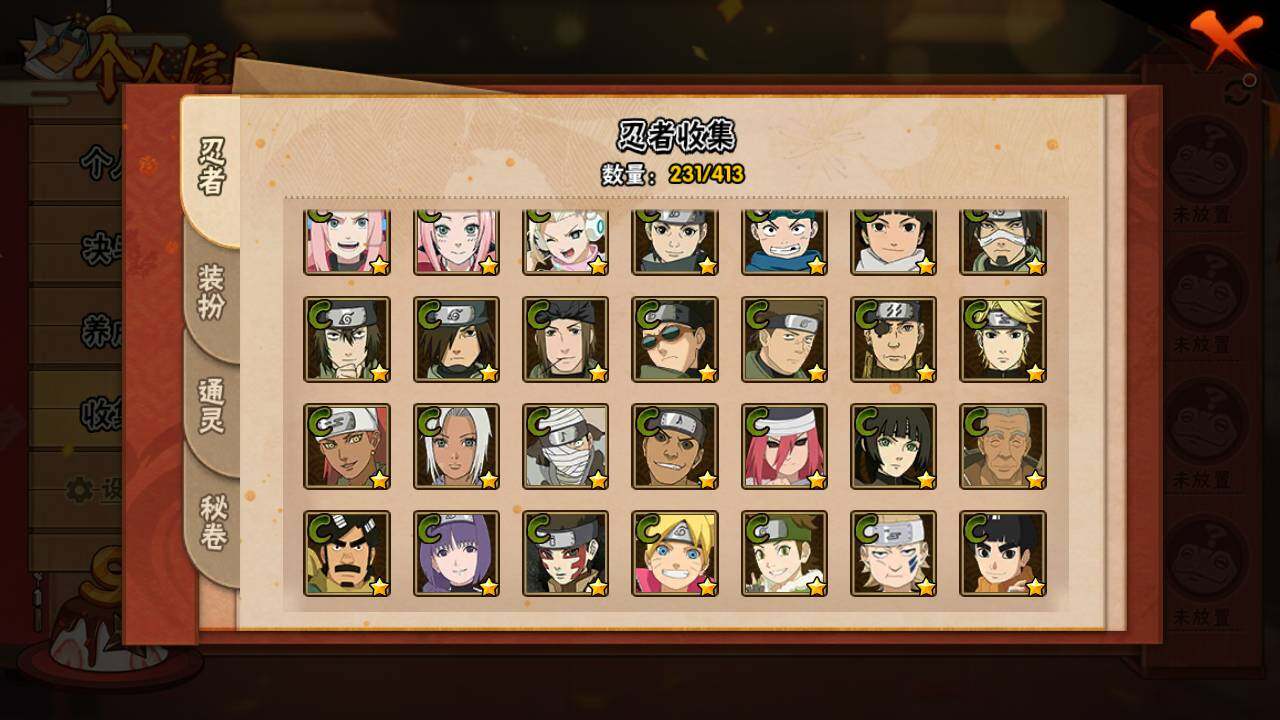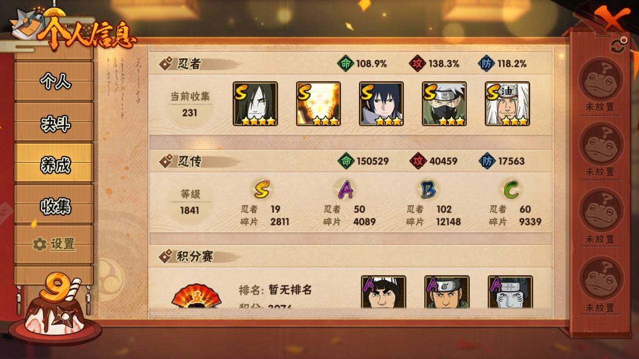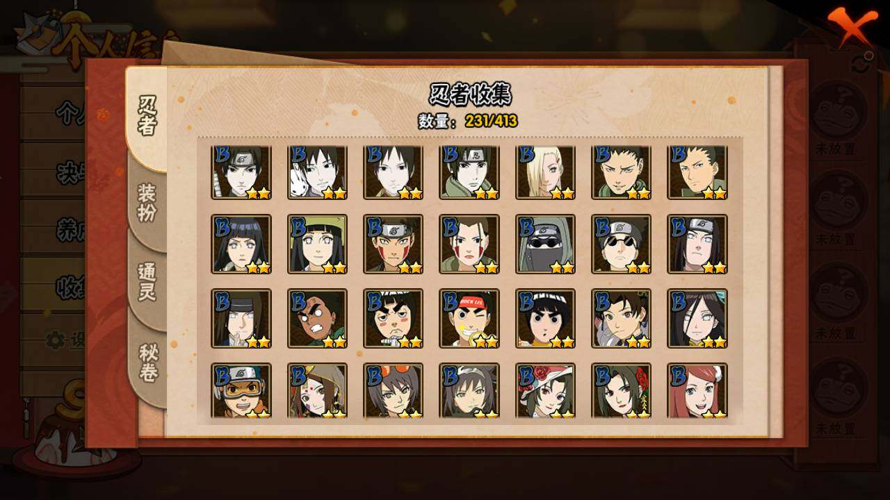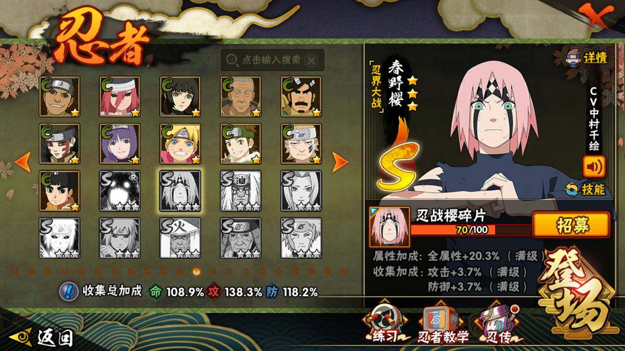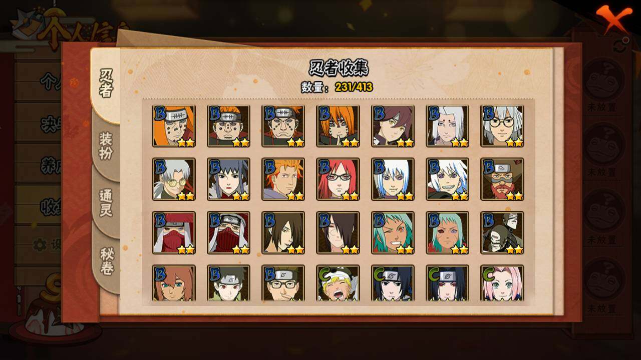 【S级忍者】:宇智波斑「秽土转生」(3星),宇智波斑「秽土转生·解」(3星),宇智波带土「忍界大战」(3星),艾「忍界大战」(3星),宇智波鼬「须佐能乎」(3星),宇智波止水「须佐能乎」(3星),旗木卡卡西「须佐能乎」(3星),自来也(3星),自来也「舞之豪杰」(3星),大蛇丸(4星),自来也「传说中的三忍」(3星),纲手「百豪」(3星),波风水门(3星),漩涡鸣人「九喇嘛连结」(3星),迈特凯「死门」(3星),佩恩「天道」(3星),宇智波佐助「永恒万花筒」(3星),宇智波斑 「白面具」(3星宇智波斑「白面具」),大筒木桃式(3星)